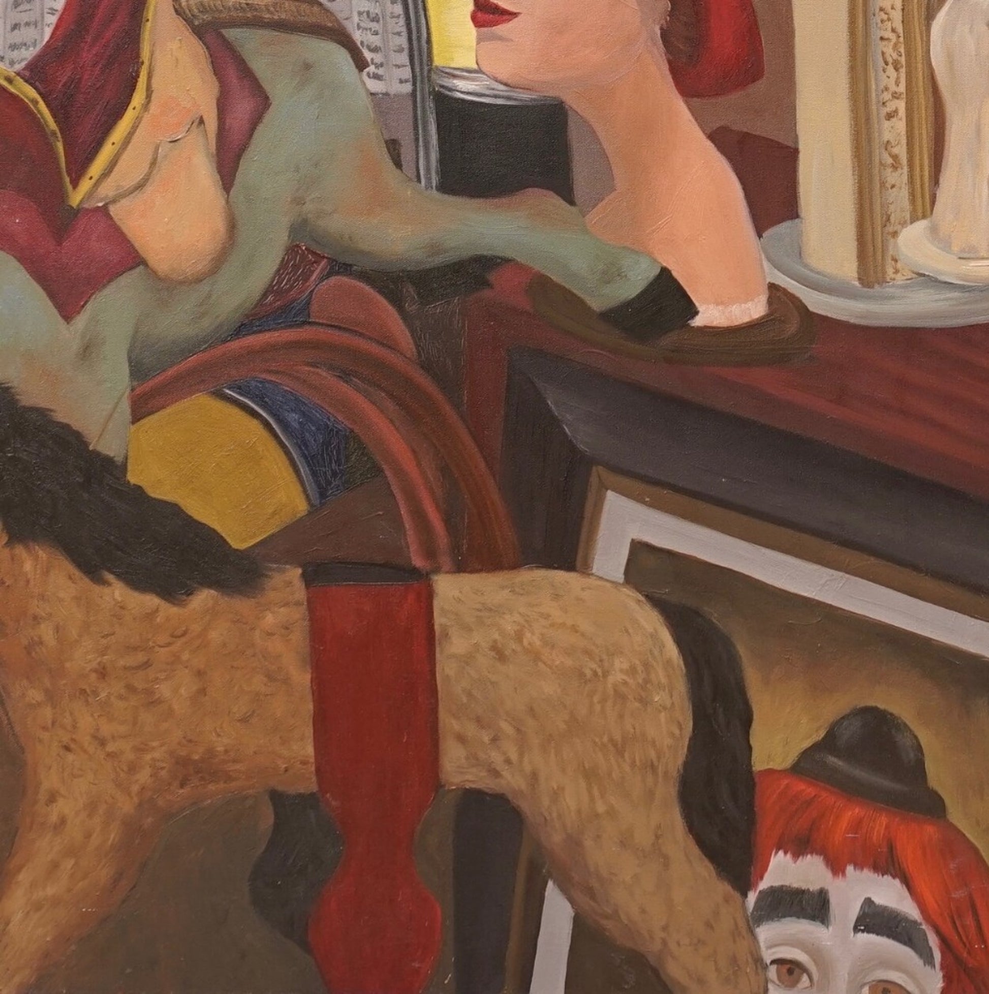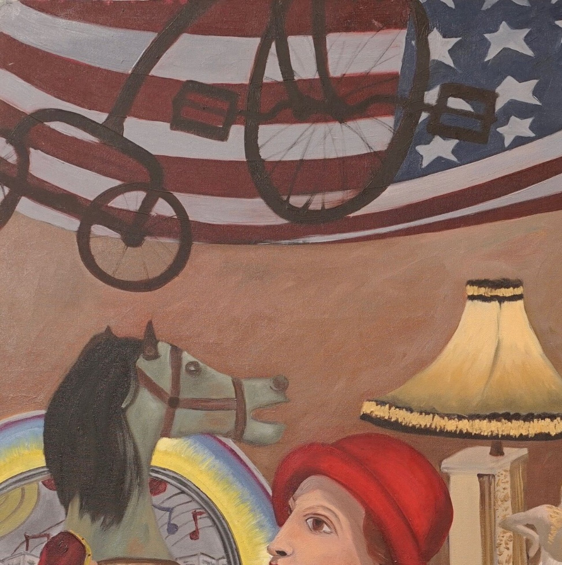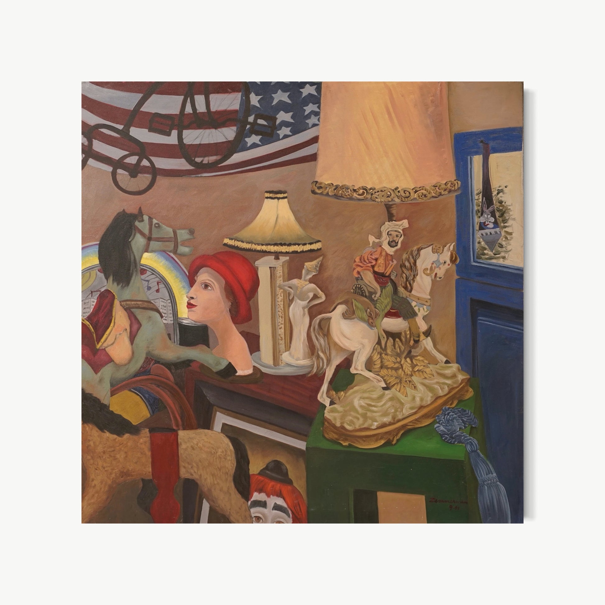 This early work offers a fascinating glimpse into Marc’s developing visual language. The composition brings together a curated collection of vintage objects and figurative elements, arranged with a theatrical sense of staging and narrative curiosity.