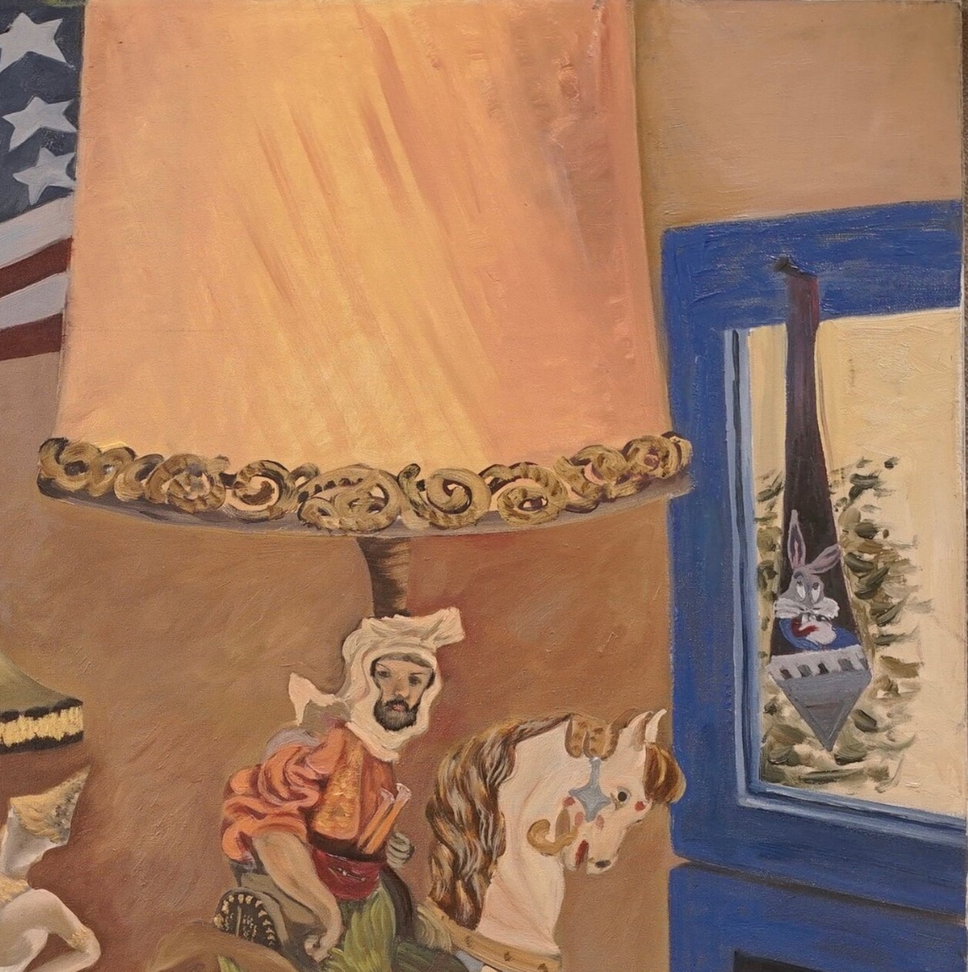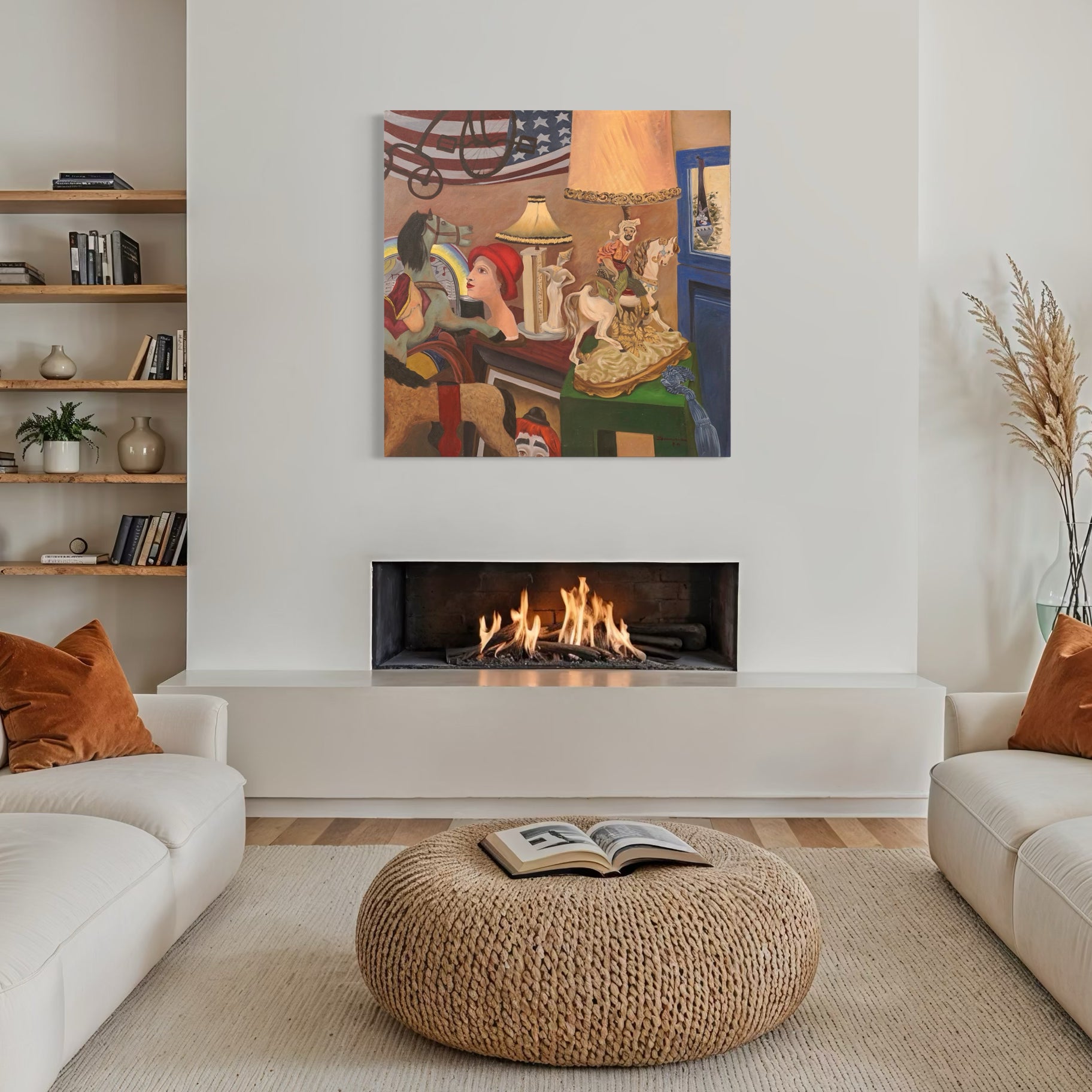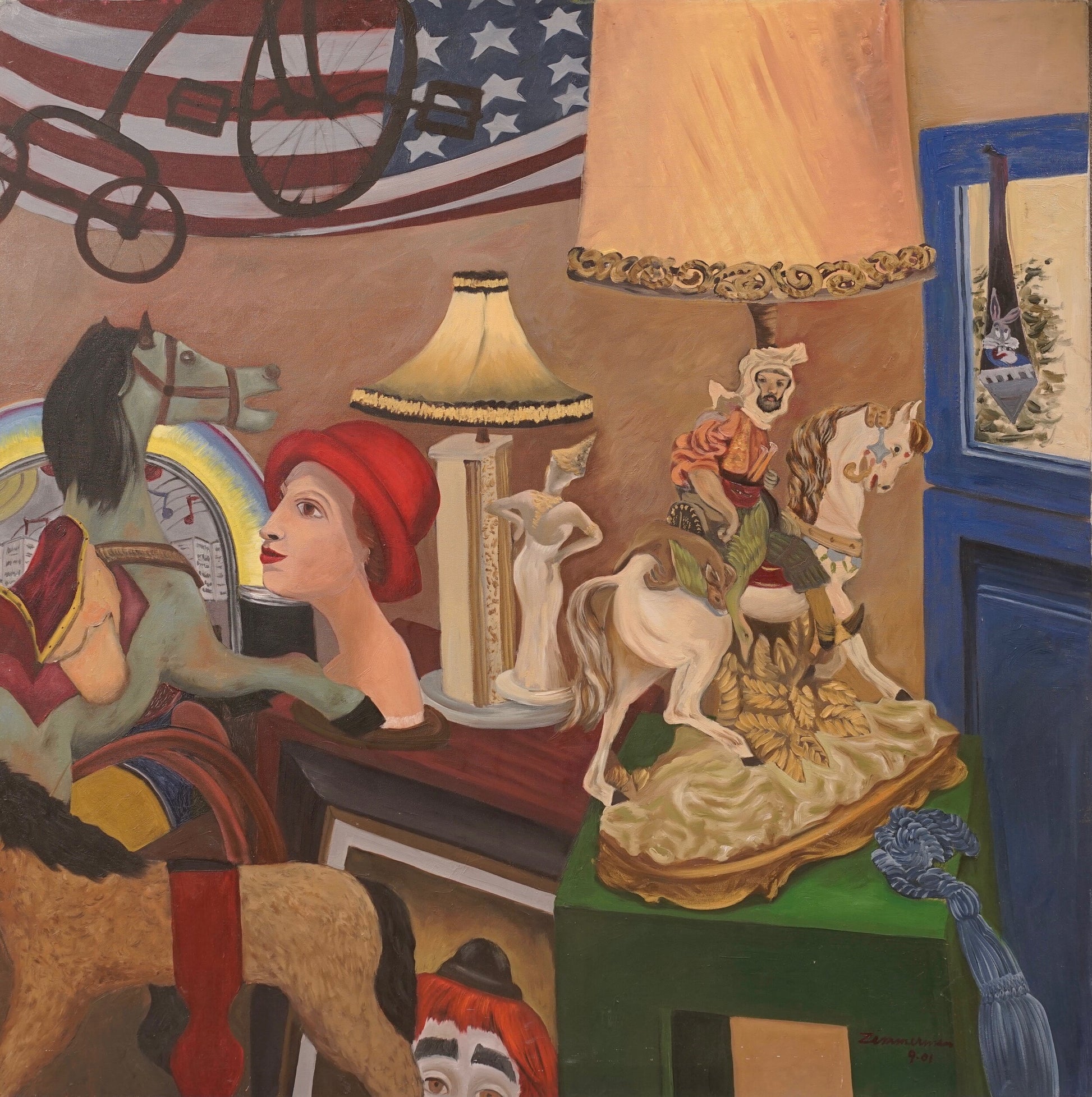 This early work offers a fascinating glimpse into Marc’s developing visual language. The composition brings together a curated collection of vintage objects and figurative elements, arranged with a theatrical sense of staging and narrative curiosity.
