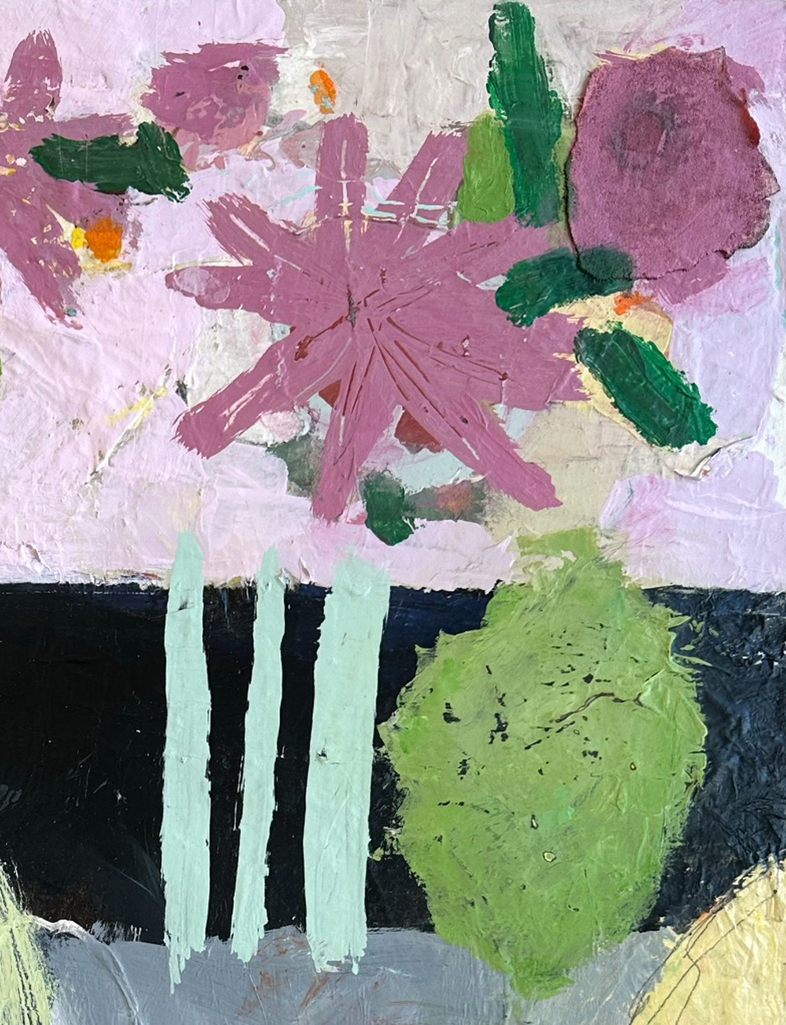 Christiane Corcelle is a French-American mixed media artist based in Massachusetts. Her intuitive, layered practice spans painting, printmaking, collage, and de-collage, building richly textured surfaces that invite close exploration. Guided by curiosity and openness to process, she transforms color, shape, and found materials into works that are both dynamic and contemplative.
