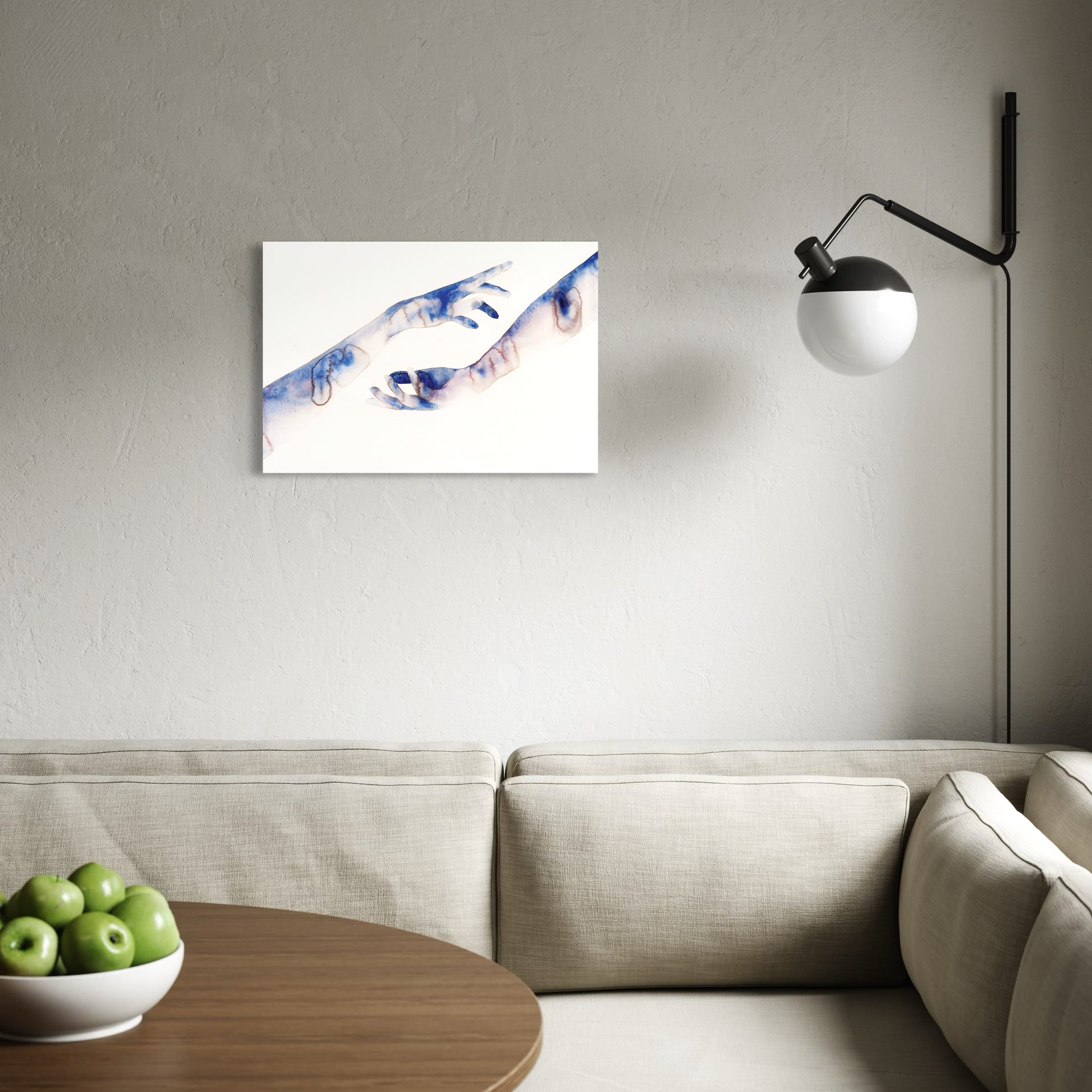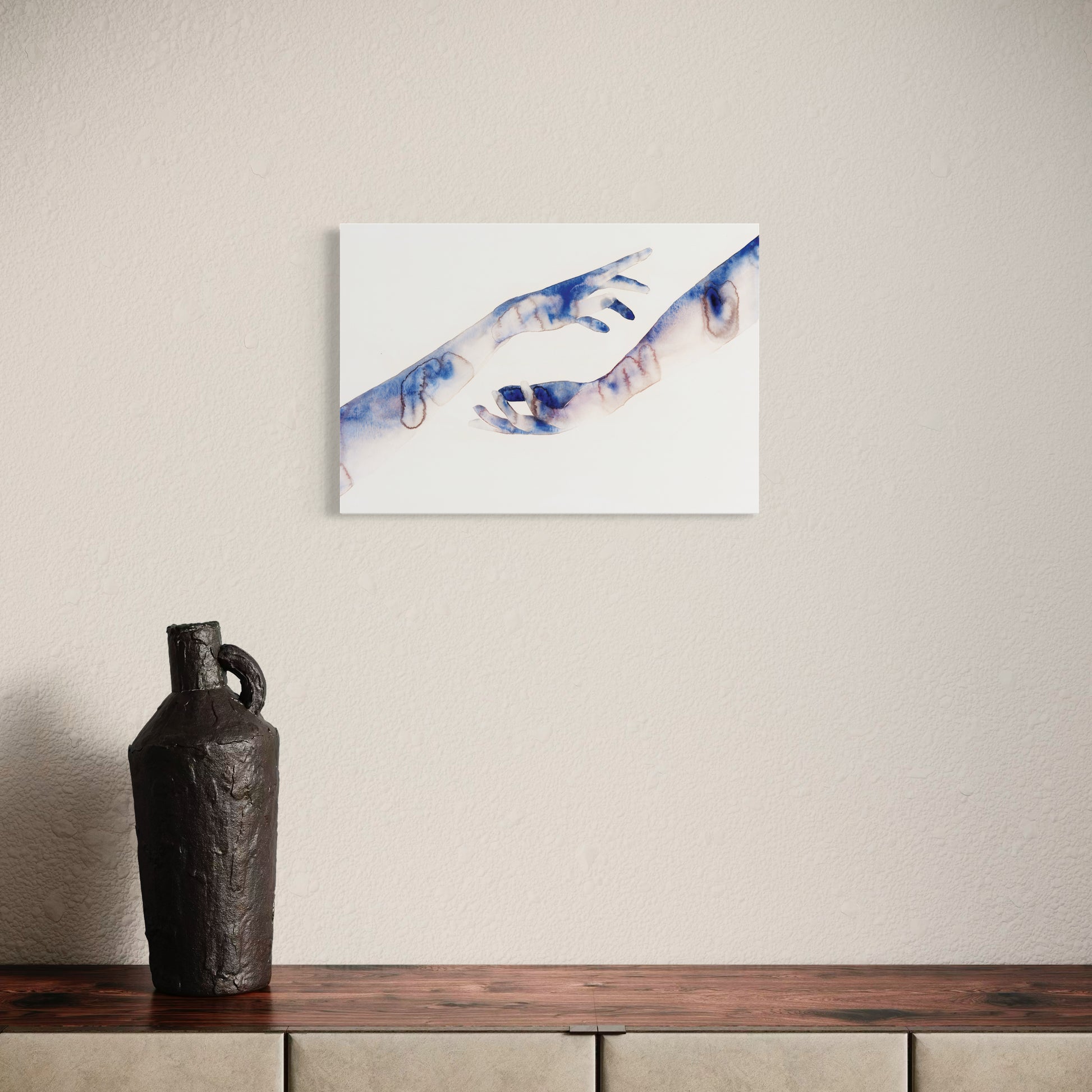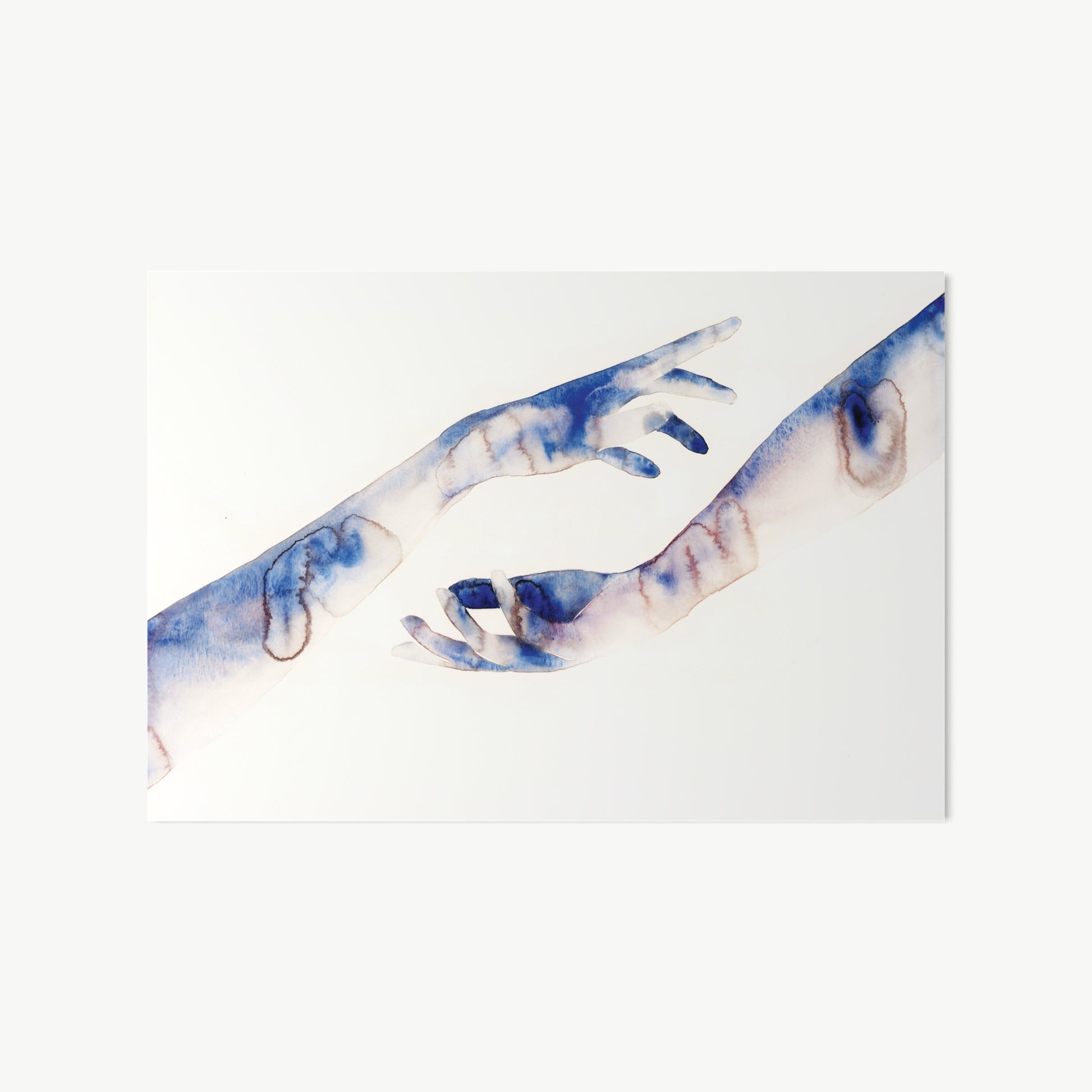 Cuddemi returns again and again to the hand - reaching, holding, almost touching. It is where connection begins and where it is most honestly felt. She gives them space to breathe, setting them against white and letting the gesture speak. Whether two hands drift toward each other across open space or arms intertwine in something between tension and tenderness, the hand carries everything. No faces are needed. In her work, a hand becomes a whole conversation.