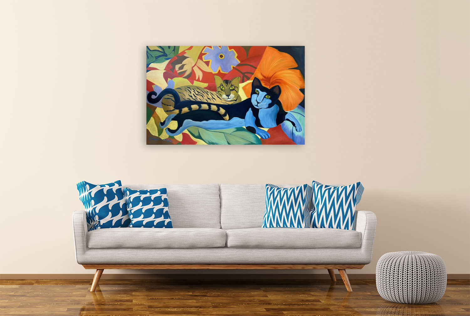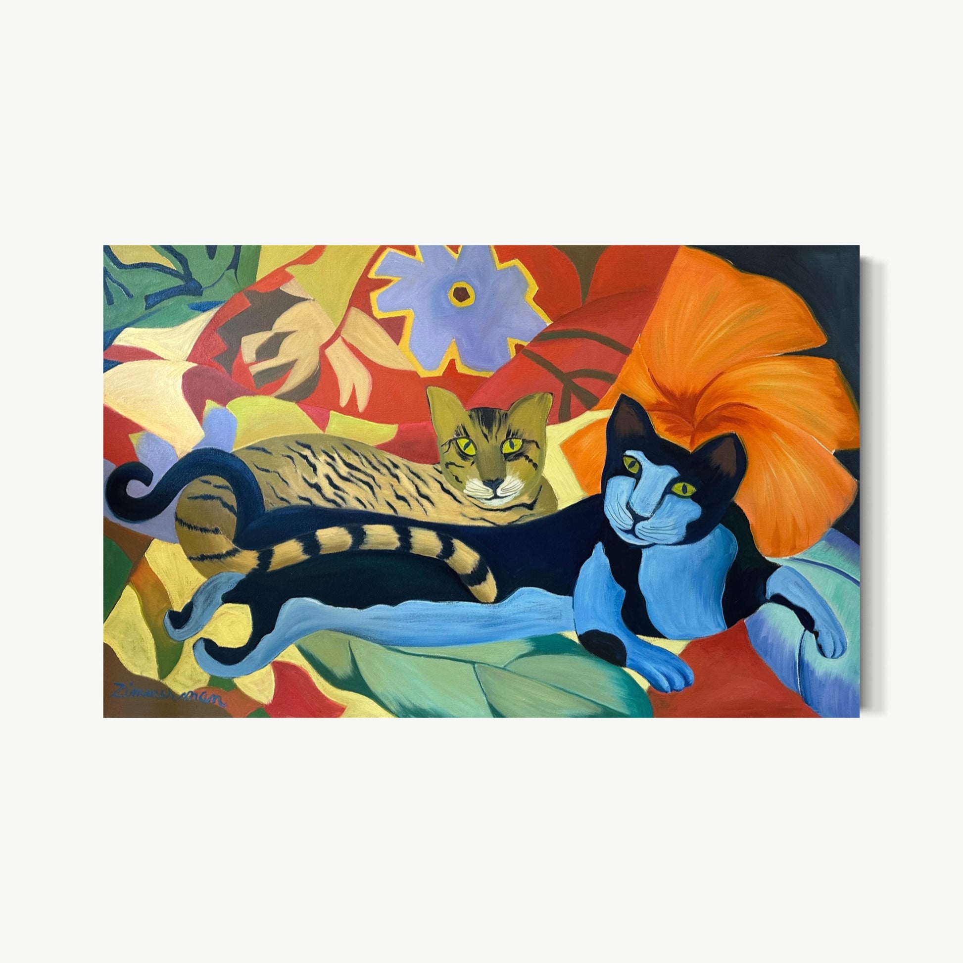 Zimmerman’s distinctive vocabulary was shaped early through his work in woodcut printmaking, which instilled the crisp edges and compositional clarity that continue to anchor his paintings today. His lush, immersive environments draw inspiration from the dreamlike worlds of Henri Rousseau and Paul Gauguin, while extended periods living and painting in Kauai, Hawaii, as well as time in Mexico and Europe, infused his work with the saturated light and rhythmic vitality that define his celebrated Jungle and Tropical Fantasy Floral series.