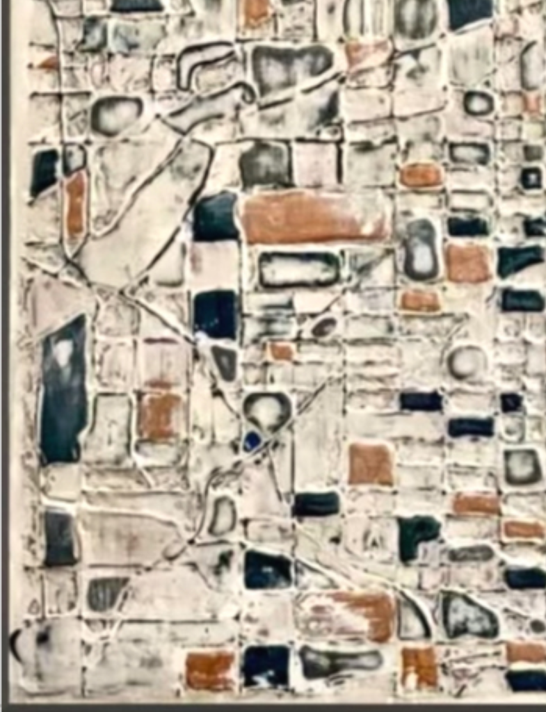 Miriam Sweeney is a San Francisco–based artist whose work reimagines aerial views of cityscapes as textured, map-like abstractions. Her paintings explore the balance between order and chaos, structure and collapse, capturing the rhythm of urban life through layered shapes that suggest streets, landmarks, traffic, and the voices of the city.