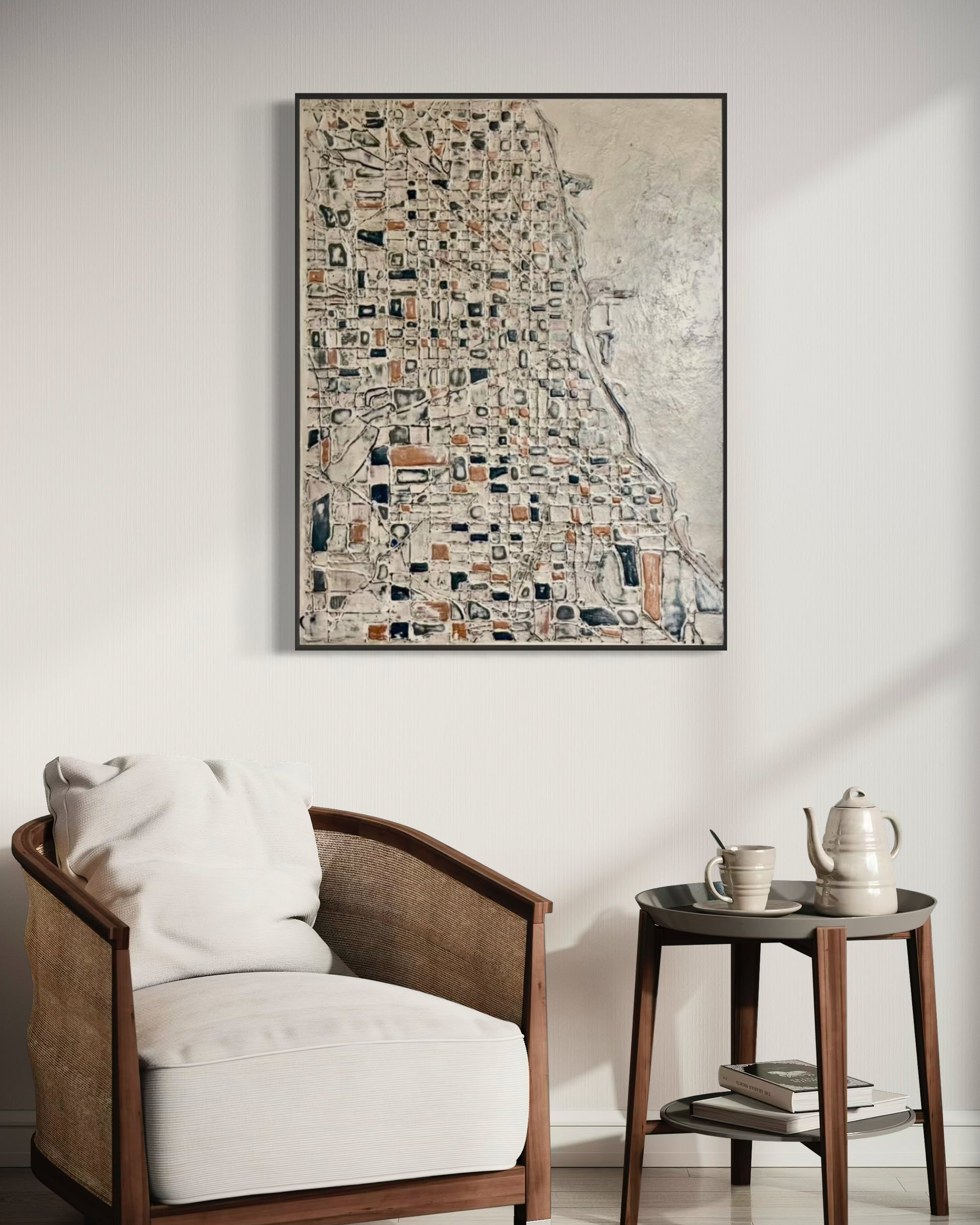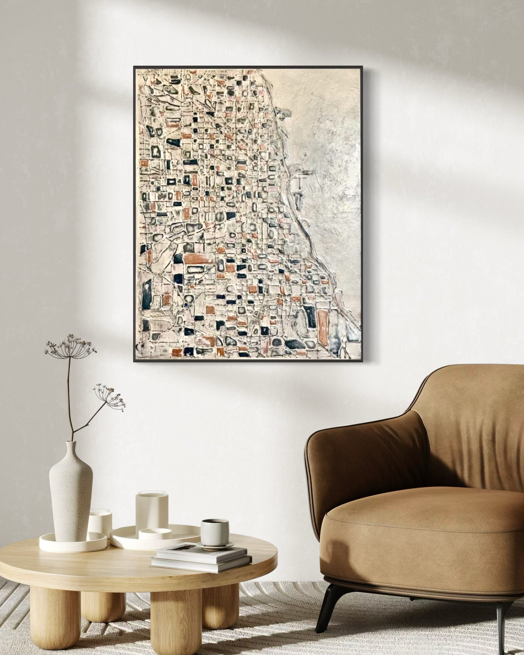 Each piece begins with a digital mapping process, where Sweeney plots city blocks using Apple Maps as a structural guide. She then builds the surface with repeated layers of soft-body acrylics, creating depth, color, and a subtle sculptural quality. The process is slow and meditative, allowing compositions to shift gradually, sometimes reflecting the density of an urban core, other times opening into looser, more organic forms.