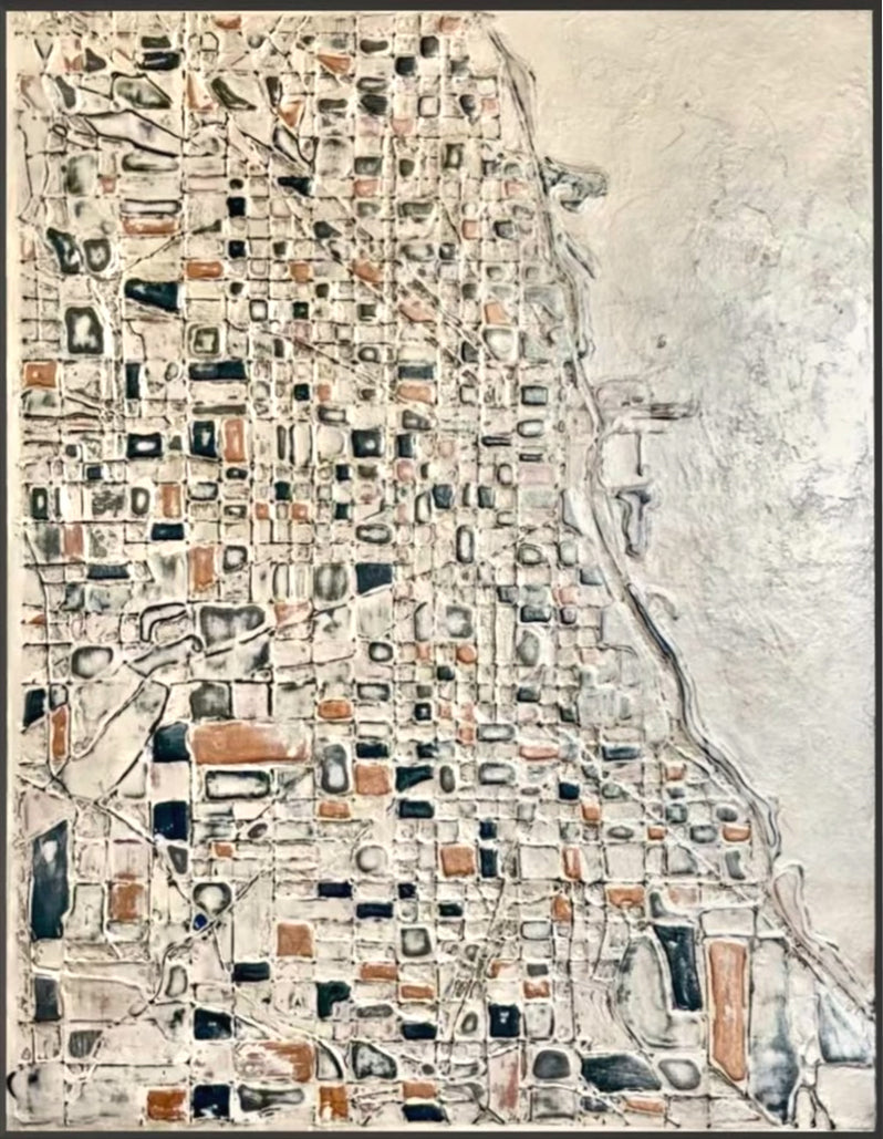 Her paintings transform maps into a poetic language of texture and rhythm, evoking both the excitement of exploring new places and the intimacy of finding meaning within them. Her work has been shown throughout the San Francisco Bay Area, including the Triton Museum of Art, the Pacific Heights Gallery, and the Harry Williams Creative Gallery, and is held in private collections around the world.