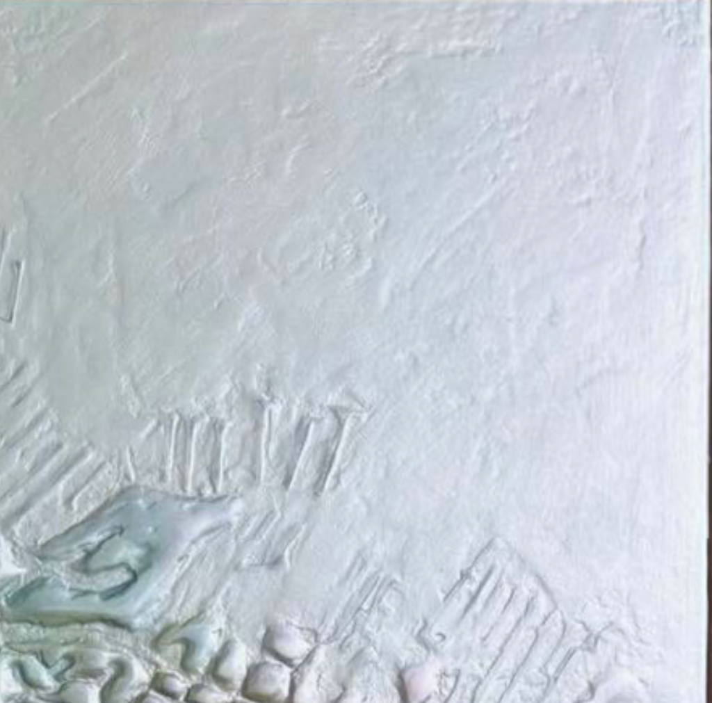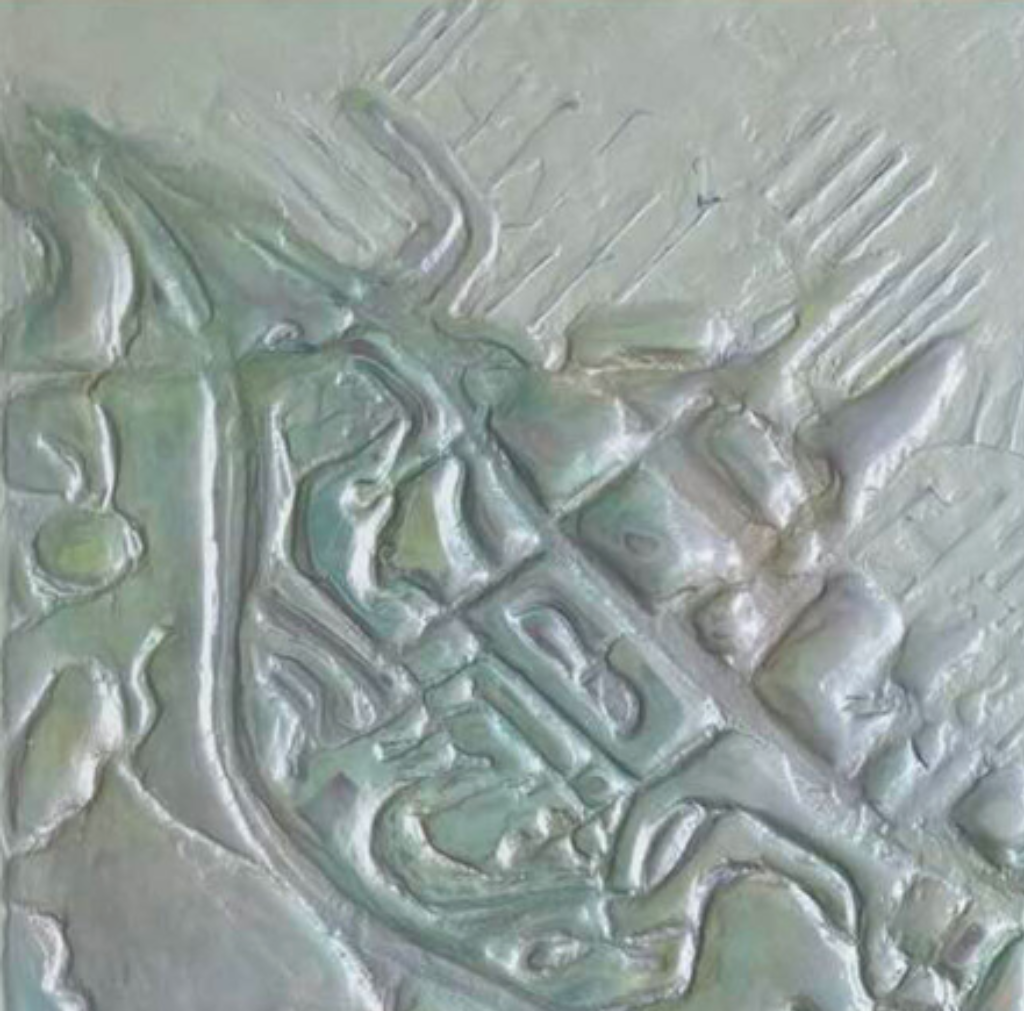 What draws you in first is the remarkable surface. Miriam builds the composition using very thick acrylic, applied through a custom tool she developed herself. It actually echoes the precision of a cake-decorating instrument, allowing her to “draw” the streets in raised relief. The result is deeply tactile and mesmerizing.