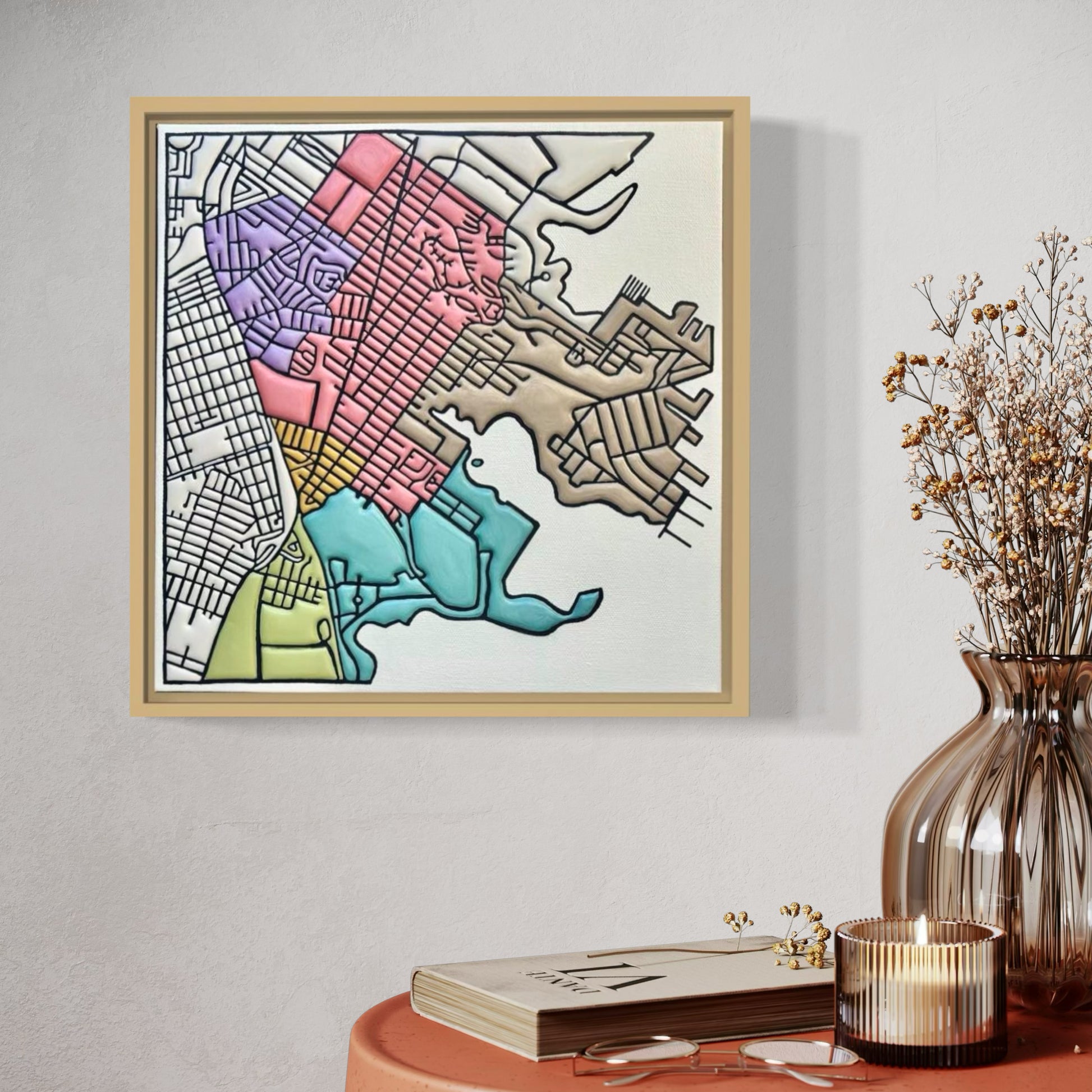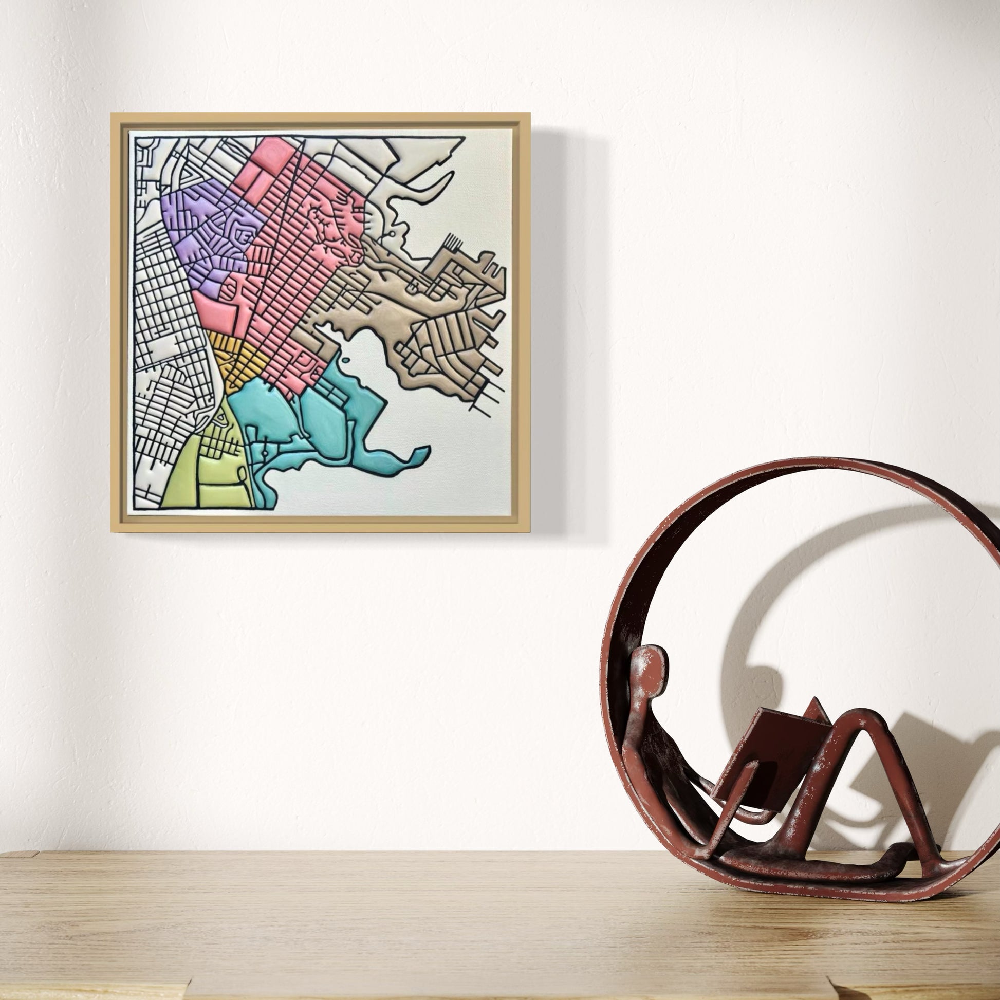 Each piece begins with a digital mapping process, where Sweeney plots city blocks using Apple Maps as a structural guide. She then builds the surface with repeated layers of soft-body acrylics, creating depth, color, and a subtle sculptural quality. The process is slow and meditative, allowing compositions to shift gradually, sometimes reflecting the density of an urban core, other times opening into looser, more organic forms.