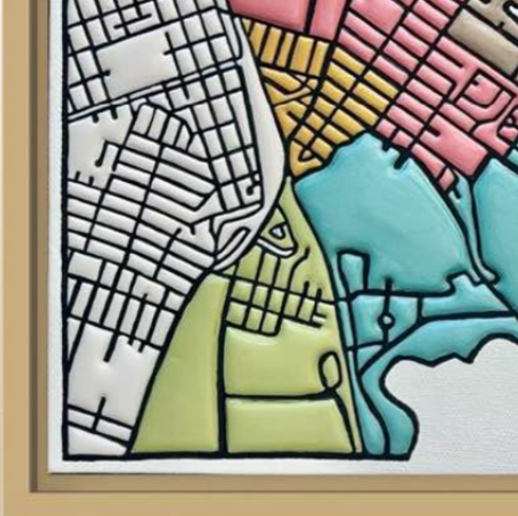 Miriam Sweeney is a San Francisco–based artist whose work reimagines aerial views of cityscapes as textured, map-like abstractions. Her paintings explore the balance between order and chaos, structure and collapse, capturing the rhythm of urban life through layered shapes that suggest streets, landmarks, traffic, and the voices of the city.