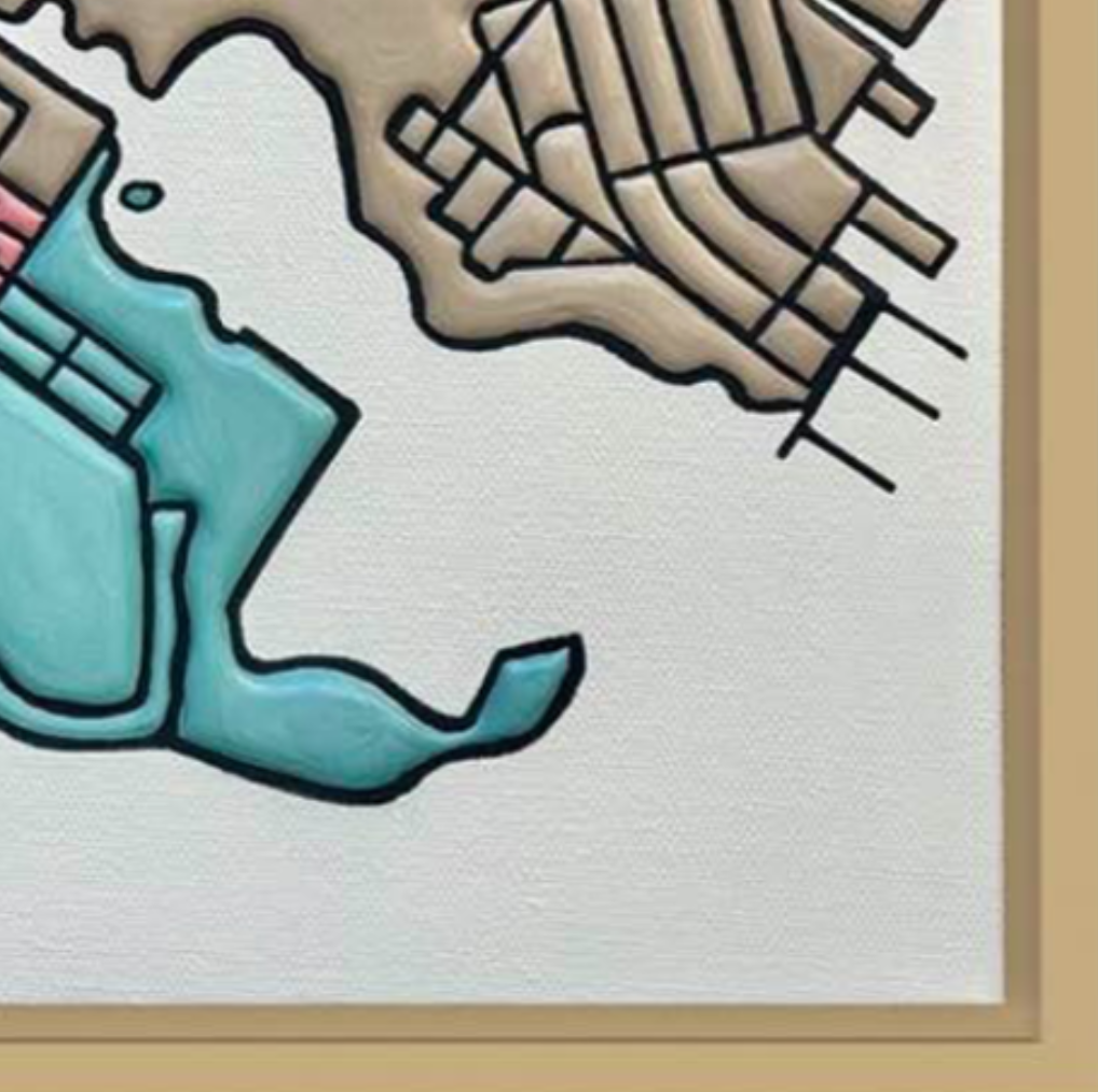 What draws you in first is the remarkable surface. Miriam builds the composition using very thick acrylic, applied through a custom tool she developed herself. It actually echoes the precision of a cake-decorating instrument, allowing her to “draw” the streets in raised relief. The result is deeply tactile and mesmerizing.