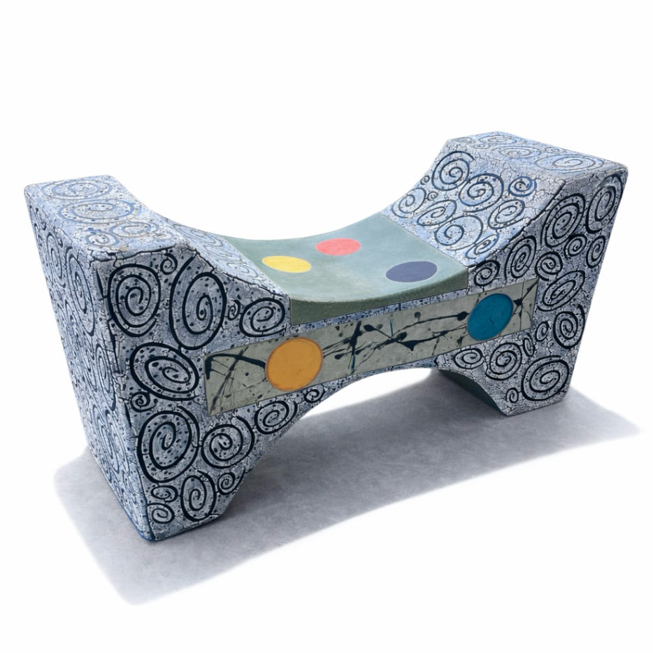 Over a four-decade career, Gustavson has pushed the expressive potential of clay, developing a controlled yet highly responsive surface language. Describing himself as a painter-sculptor, he treats each form as a three-dimensional canvas built through layered glazes, textures, and color interactions. His vessels often suggest the human figure in motion, while his wall reliefs activate negative space as an integral compositional force. Large-scale outdoor sculptures and benches extend this painterly vision into powerful tectonic forms.