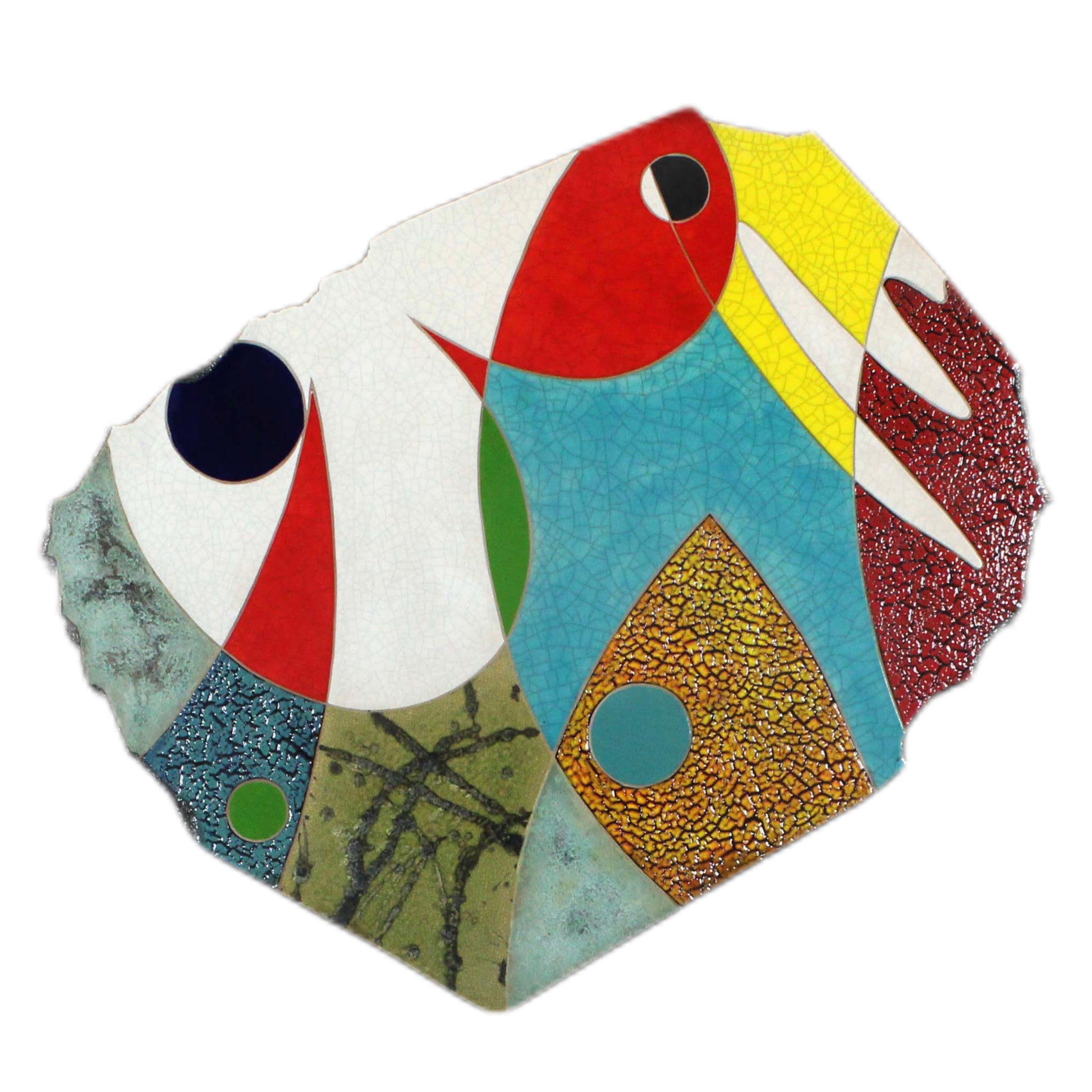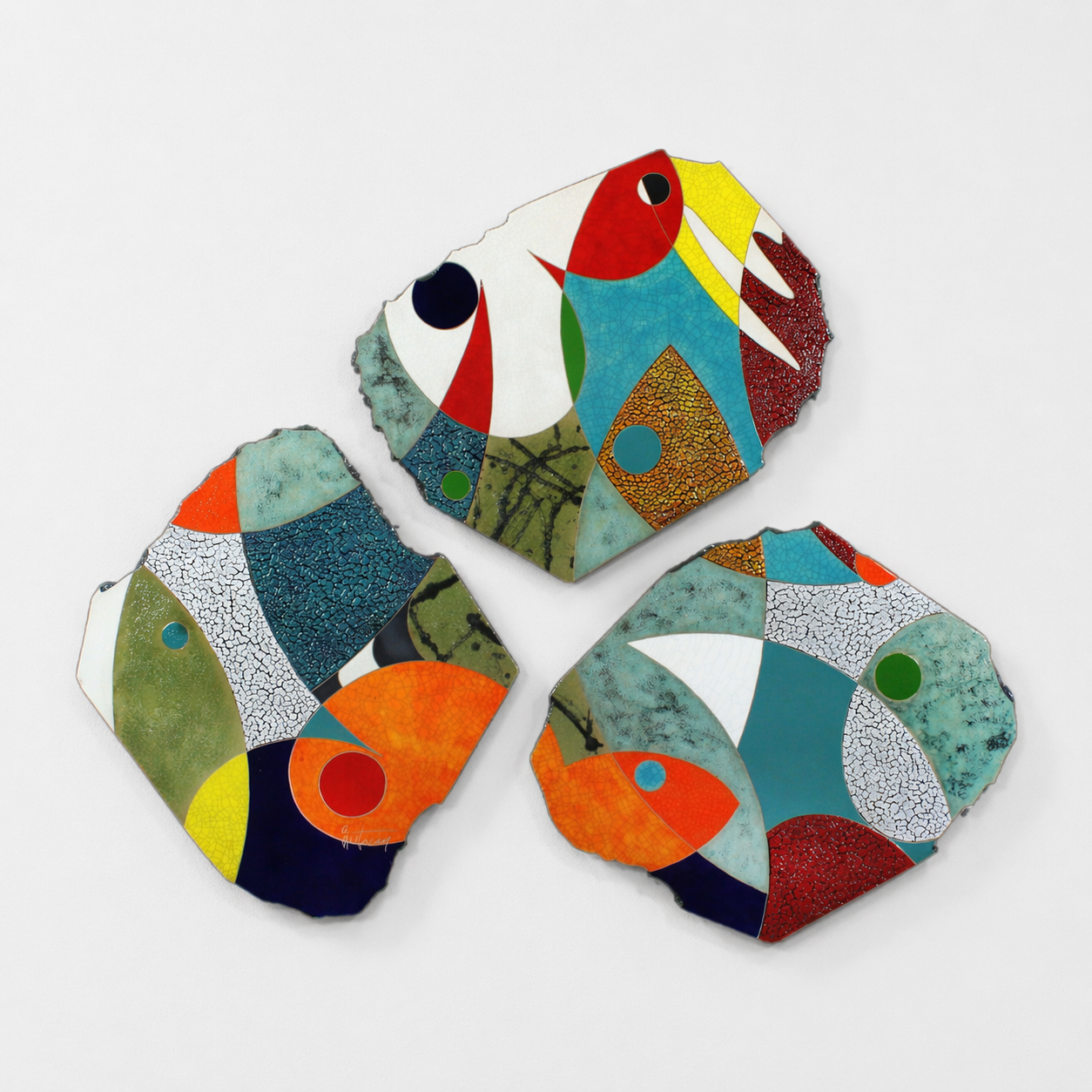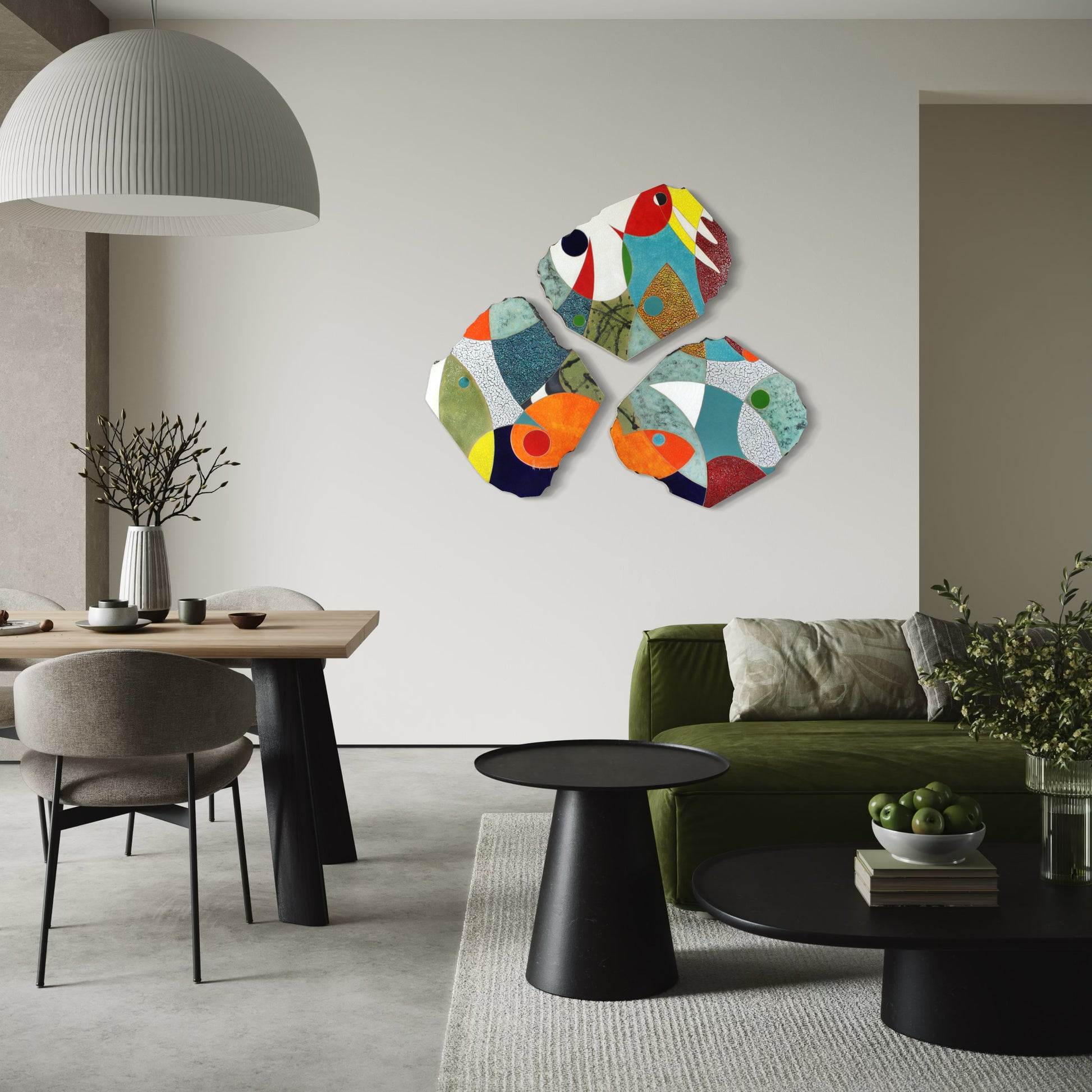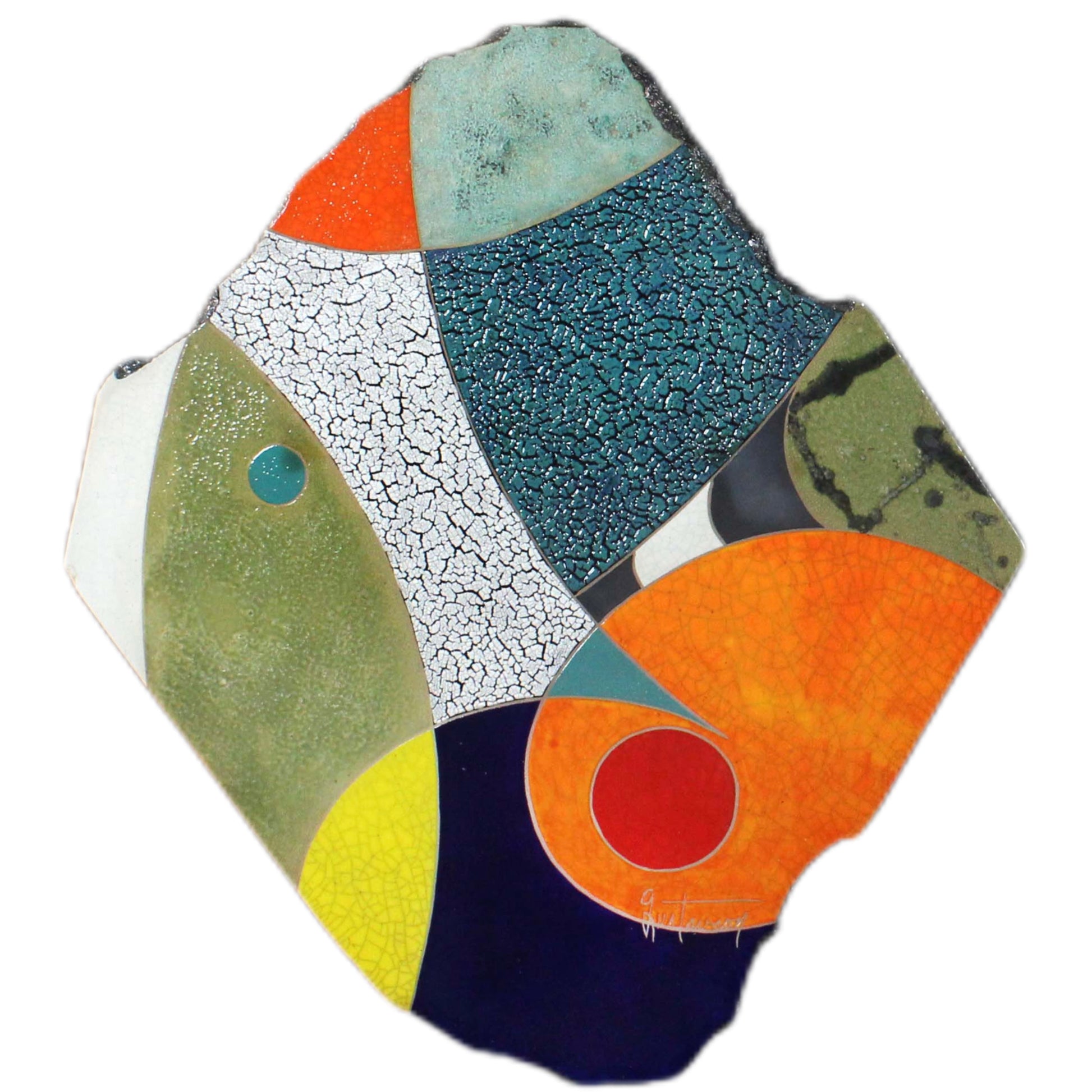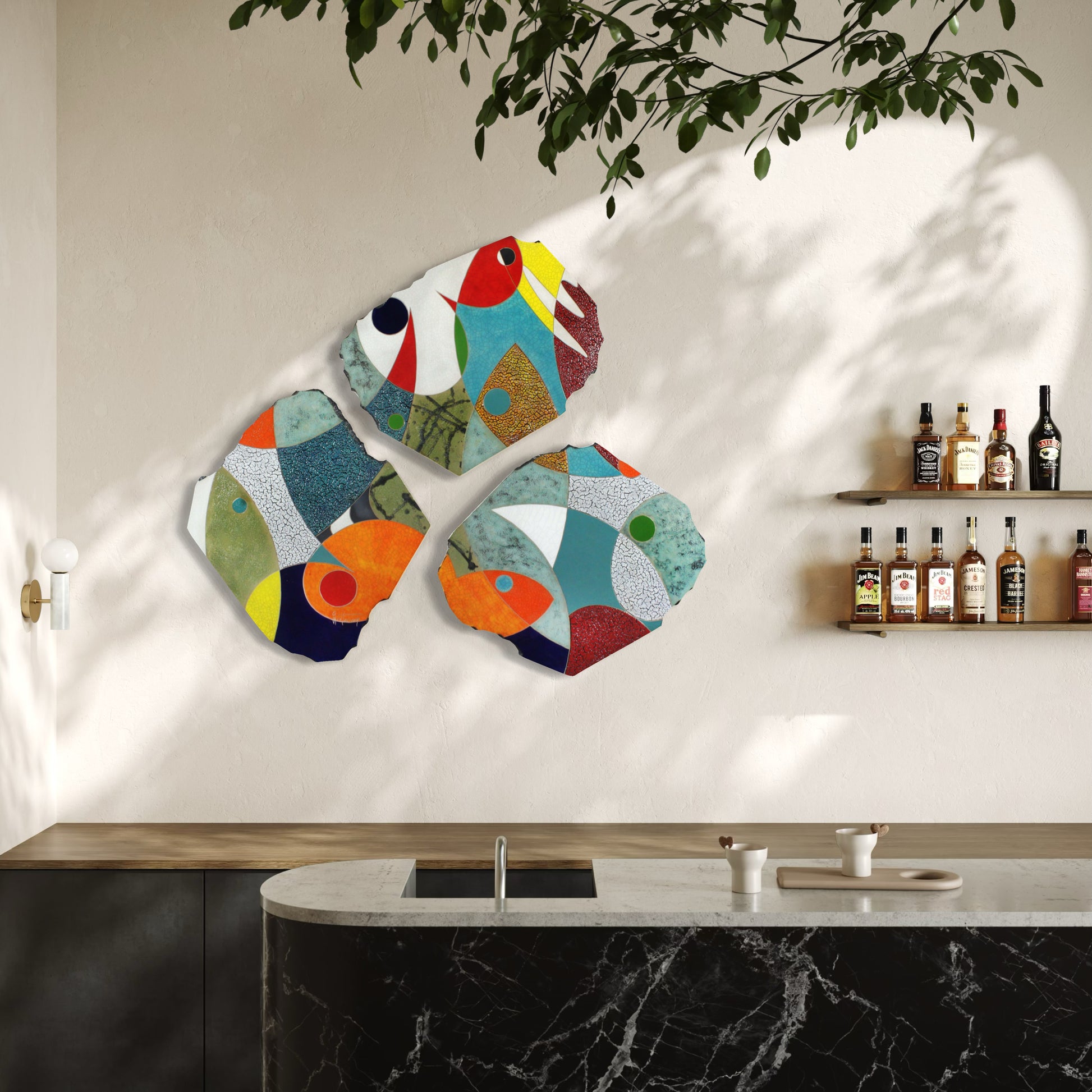 Three irregularly shaped slabs carrying one of the most vivid palettes in the wall relief collection. The upper slab moves through white, teal, red, and gold in overlapping forms with Cubist confidence. The lower left is warmer and more circular, orange and teal moving through it with genuine joy. The right slab is the most graphic, bold orange, deep navy, and crackled yellow in clean decisive sections.