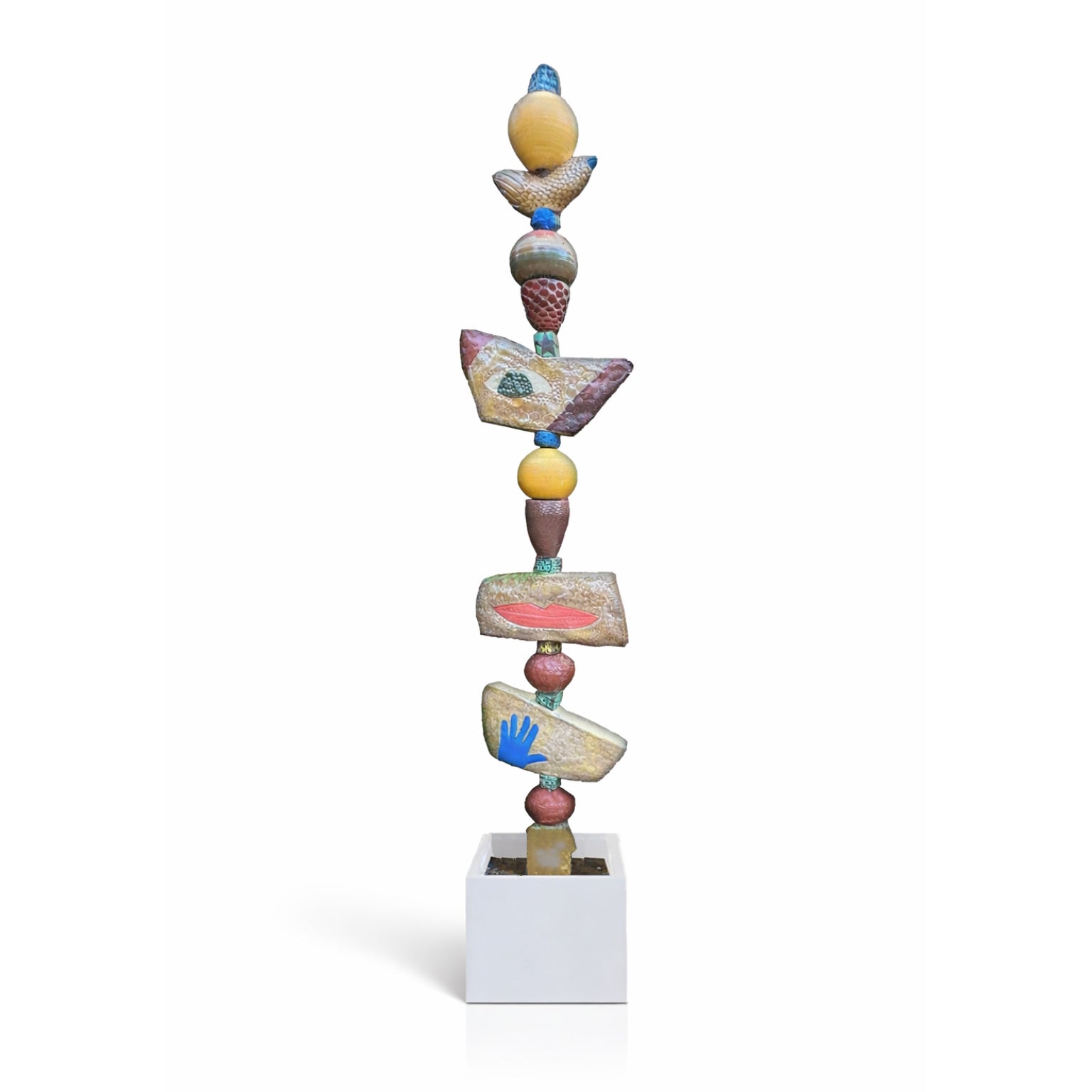 In recent years, Zimmerman has returned to his earliest artistic passion, clay, expanding his practice into the sculptural realm with his Garden Totems. These vertically stacked ceramic works are hand-built and individually glazed, each element supporting the next in a spontaneous, intuitive process. Rooted in his pottery background from Venice Beach in the 1960s and 70s, the totems translate his painterly sensibility into three dimensions, bringing the same sense of movement, humor, and joie de vivre into the garden or interior space.