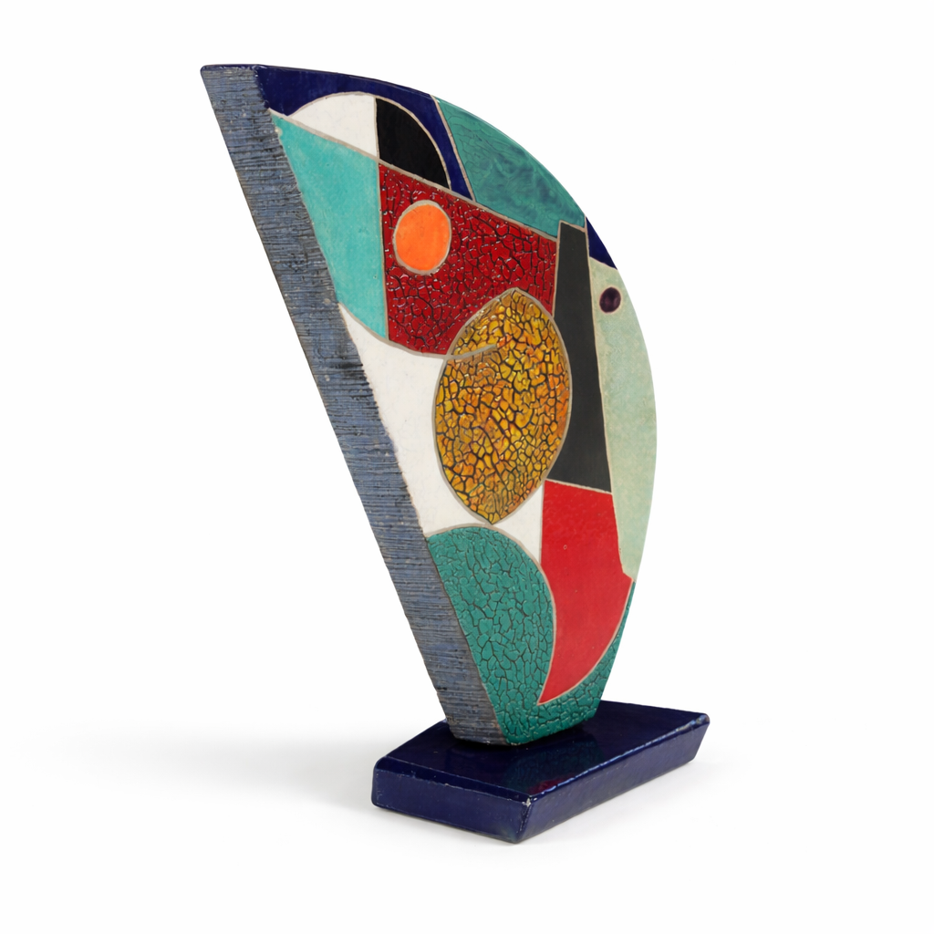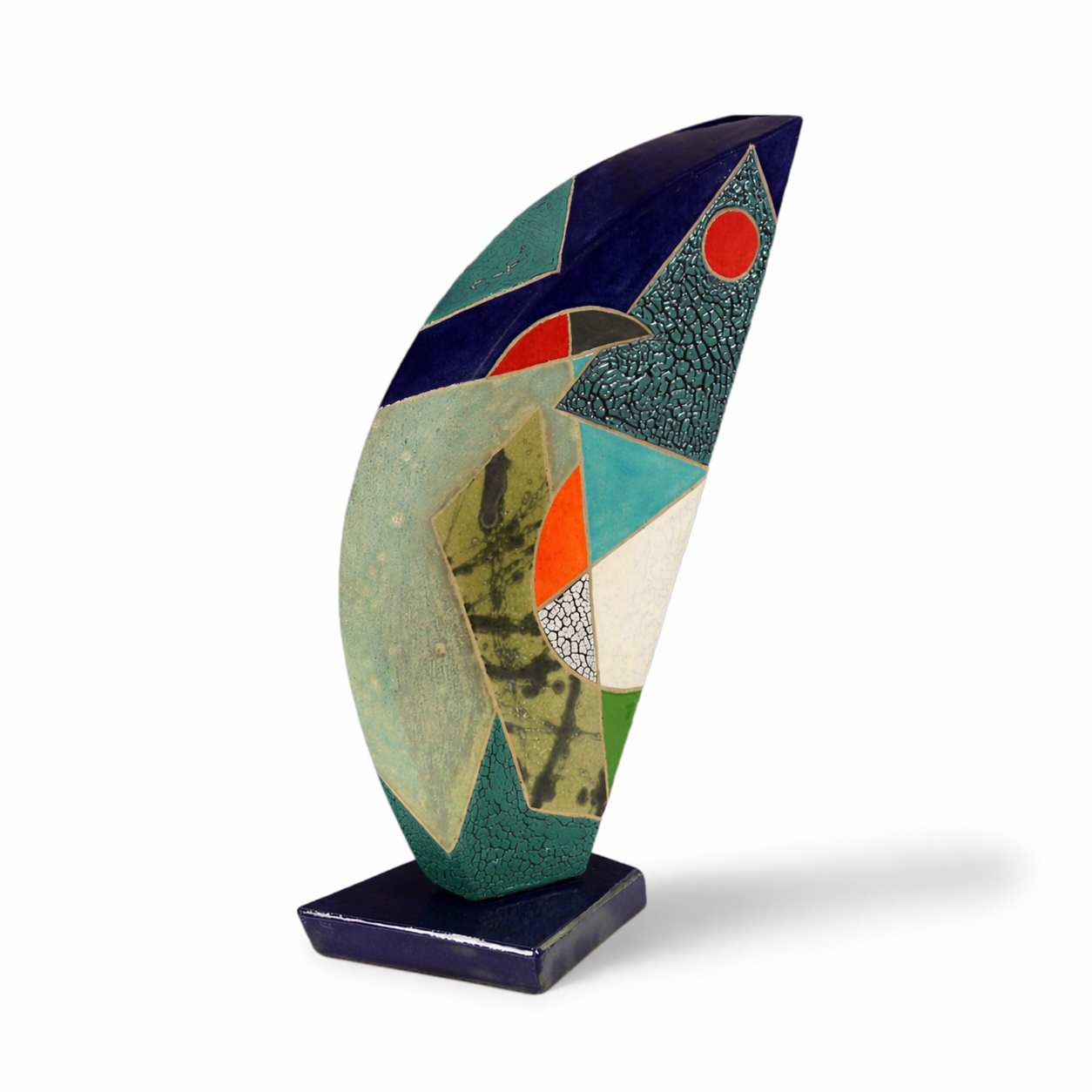 The reverse offers a cooler, more meditative palette of matte sage with fragments of teal, orange, and white, along with a crackled white section low on the form. Both sides stand as complete compositions. Set on a deep navy base, the piece features the most tactile surface in the series, rewarding close viewing.