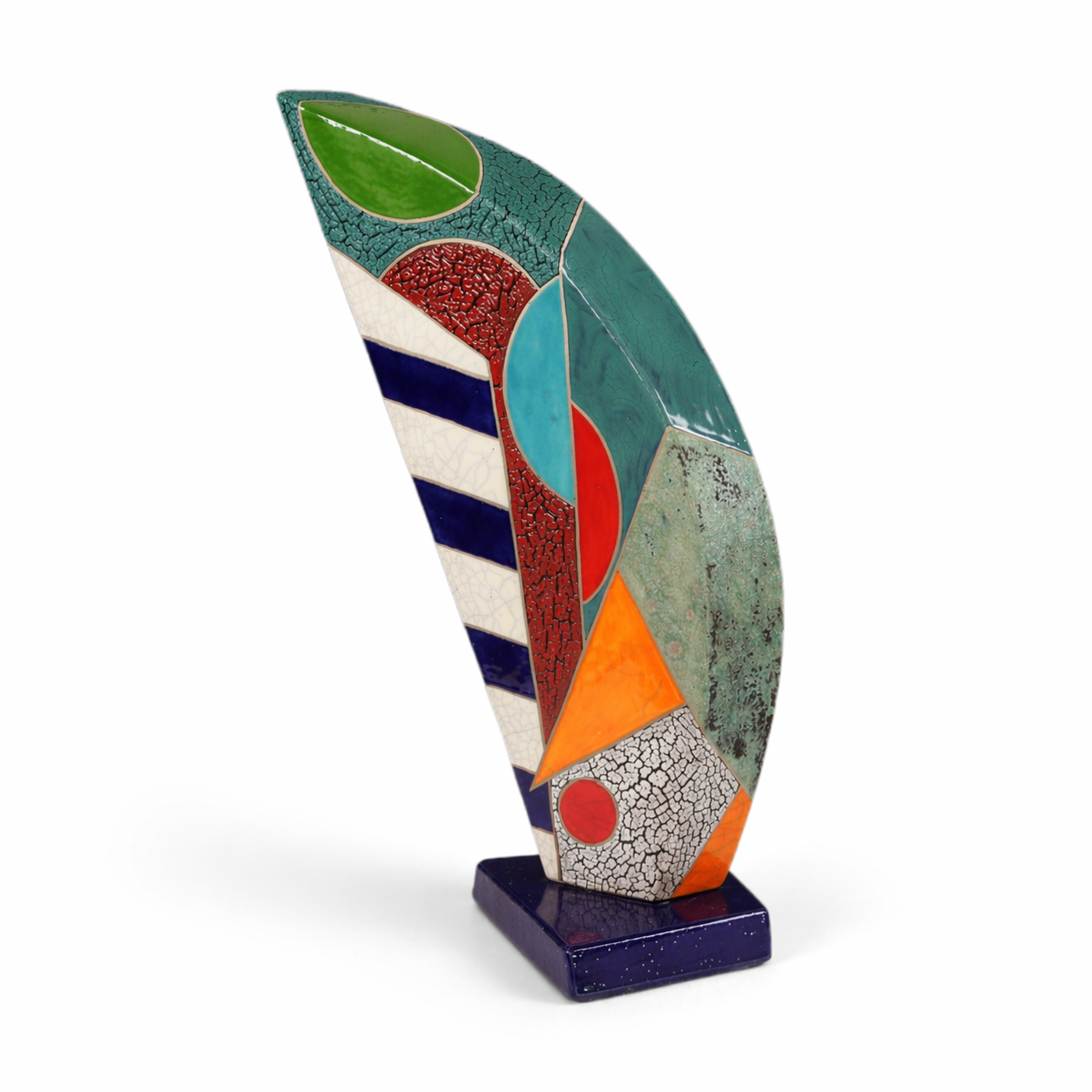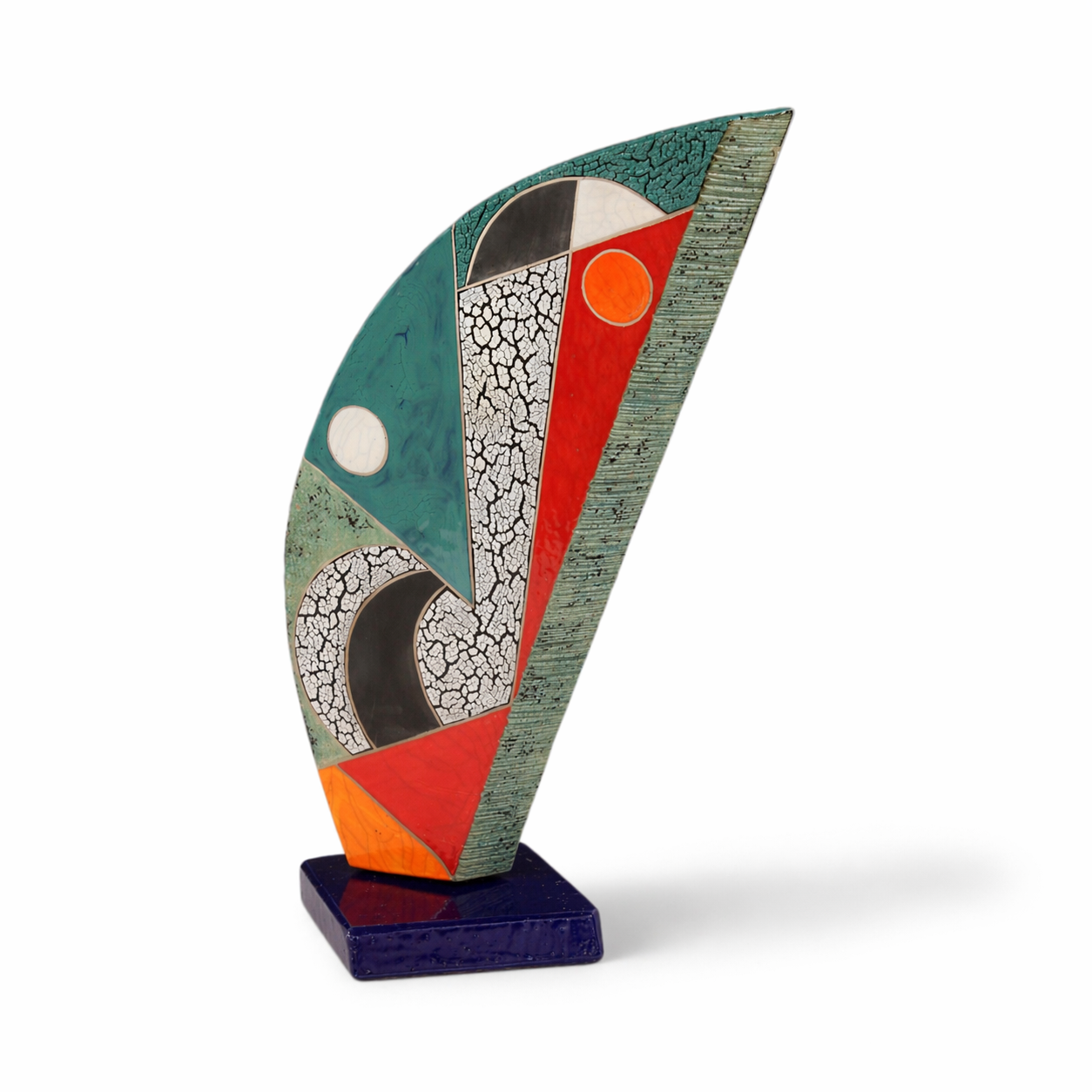The reverse is more restrained, featuring deep textured teal with areas of crackled burgundy and white, accented by small touches of color along the edges. The sculpture rests on a veined marble base, enhancing its grounded, contemplative character.