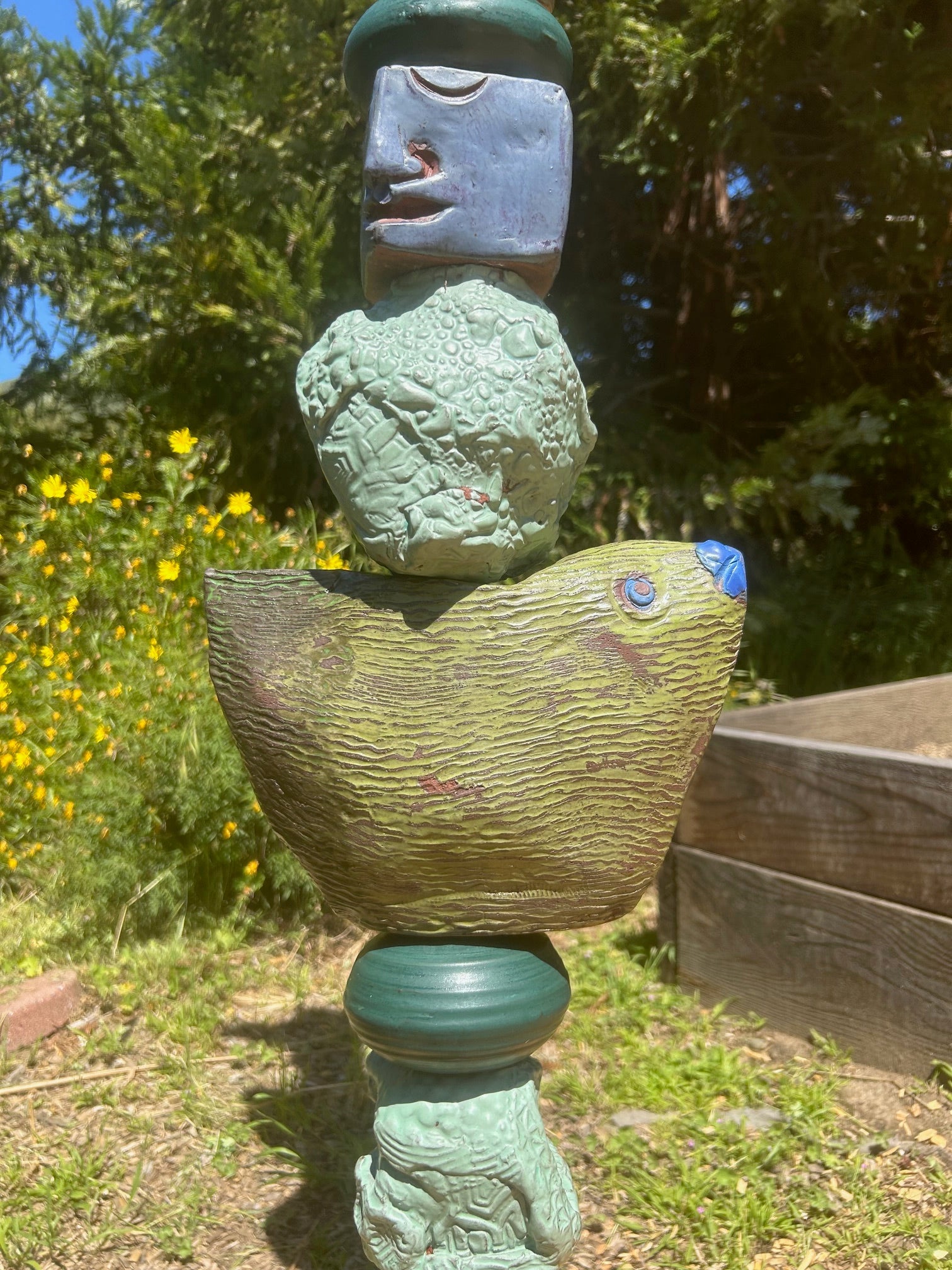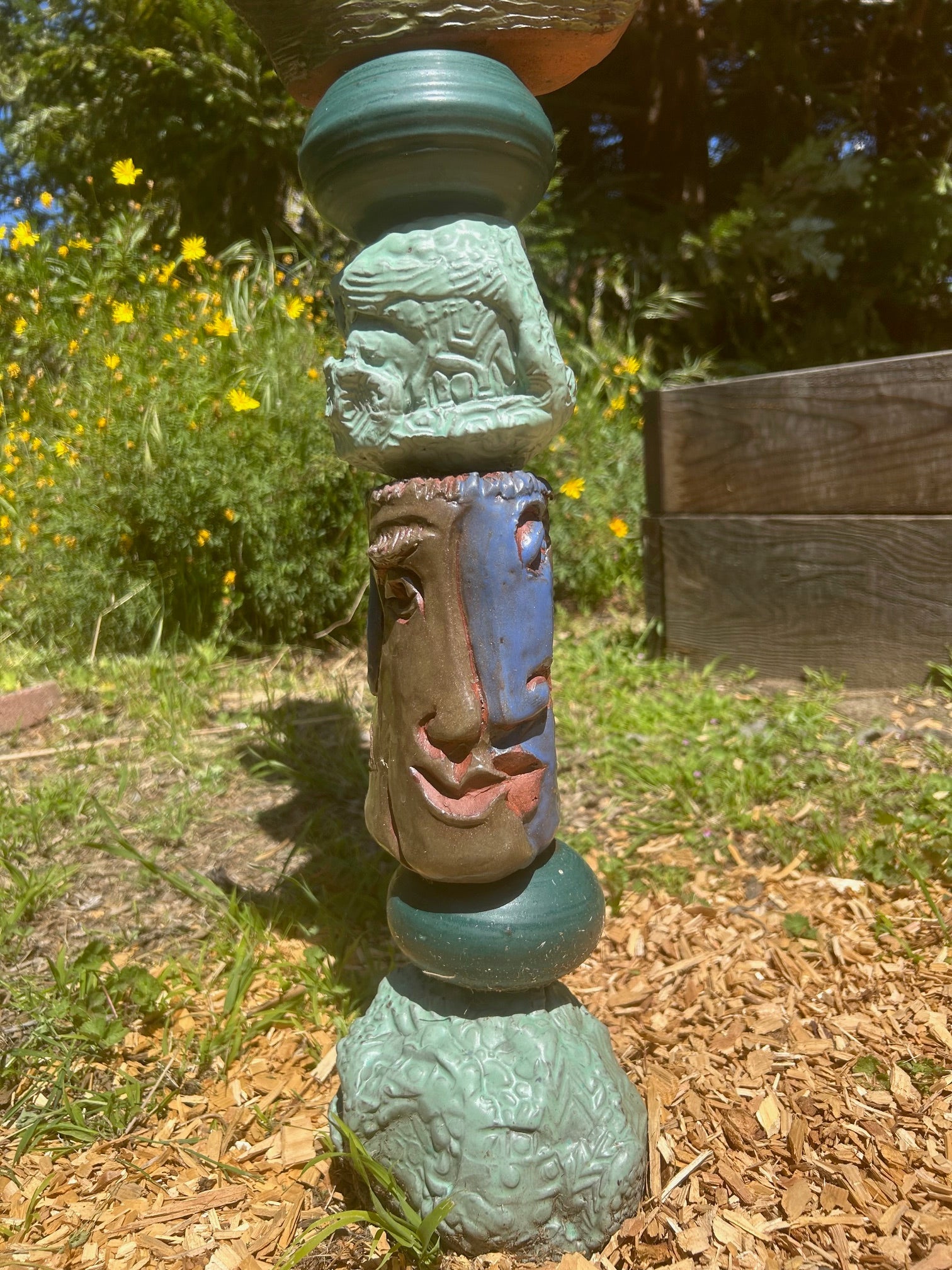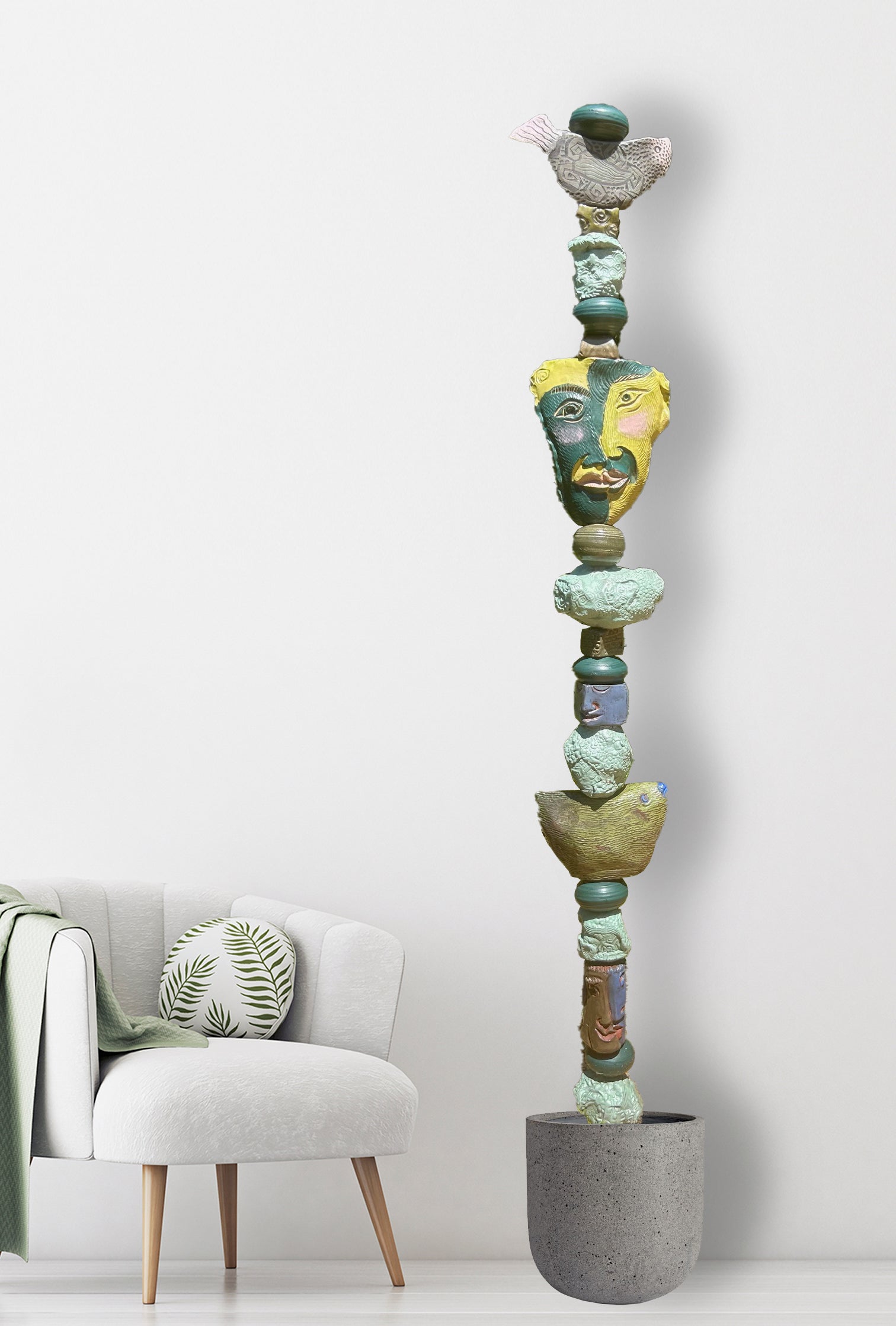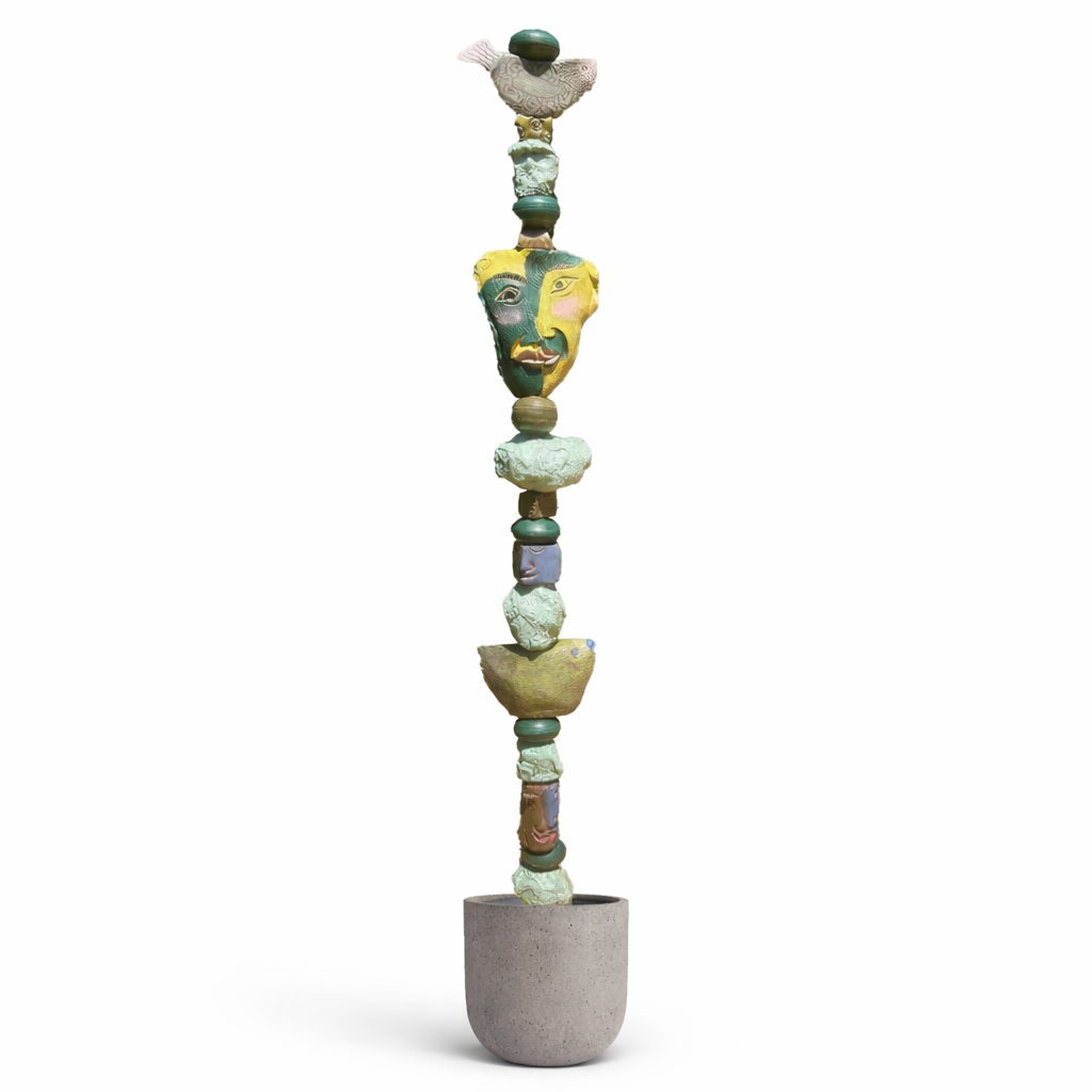 In recent years, Zimmerman has returned to his earliest artistic passion, clay, expanding his practice into the sculptural realm with his Garden Totems. These vertically stacked ceramic works are hand-built and individually glazed, each element supporting the next in a spontaneous, intuitive process. Rooted in his pottery background from Venice Beach in the 1960s and 70s, the totems translate his painterly sensibility into three dimensions, bringing the same sense of movement, humor, and joie de vivre into the garden or interior space.