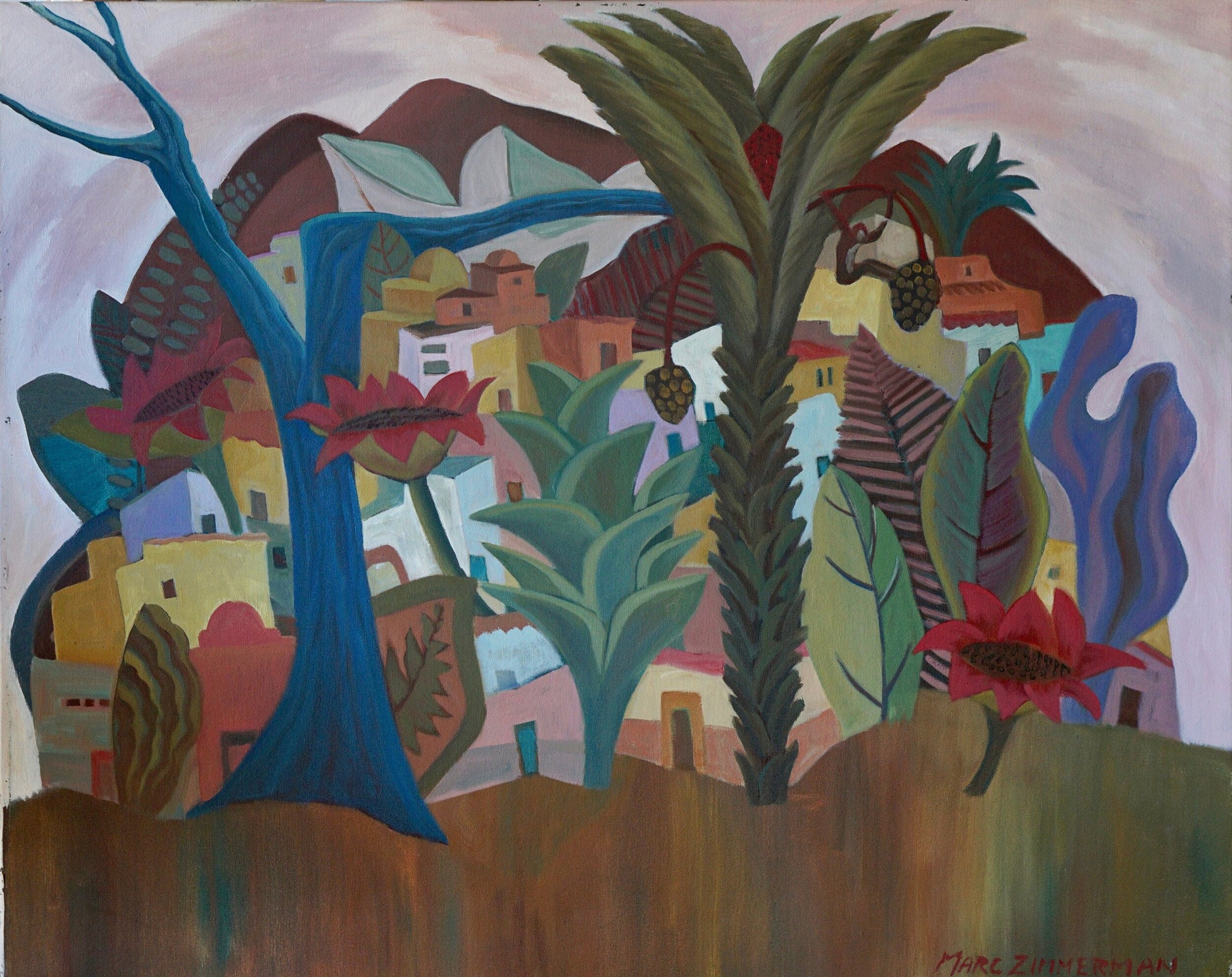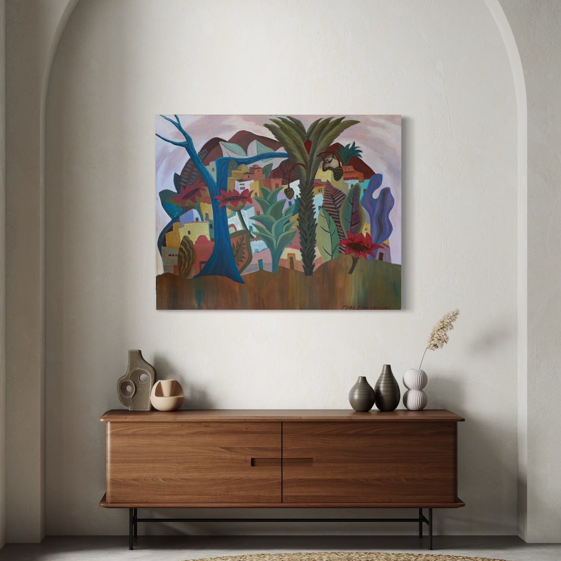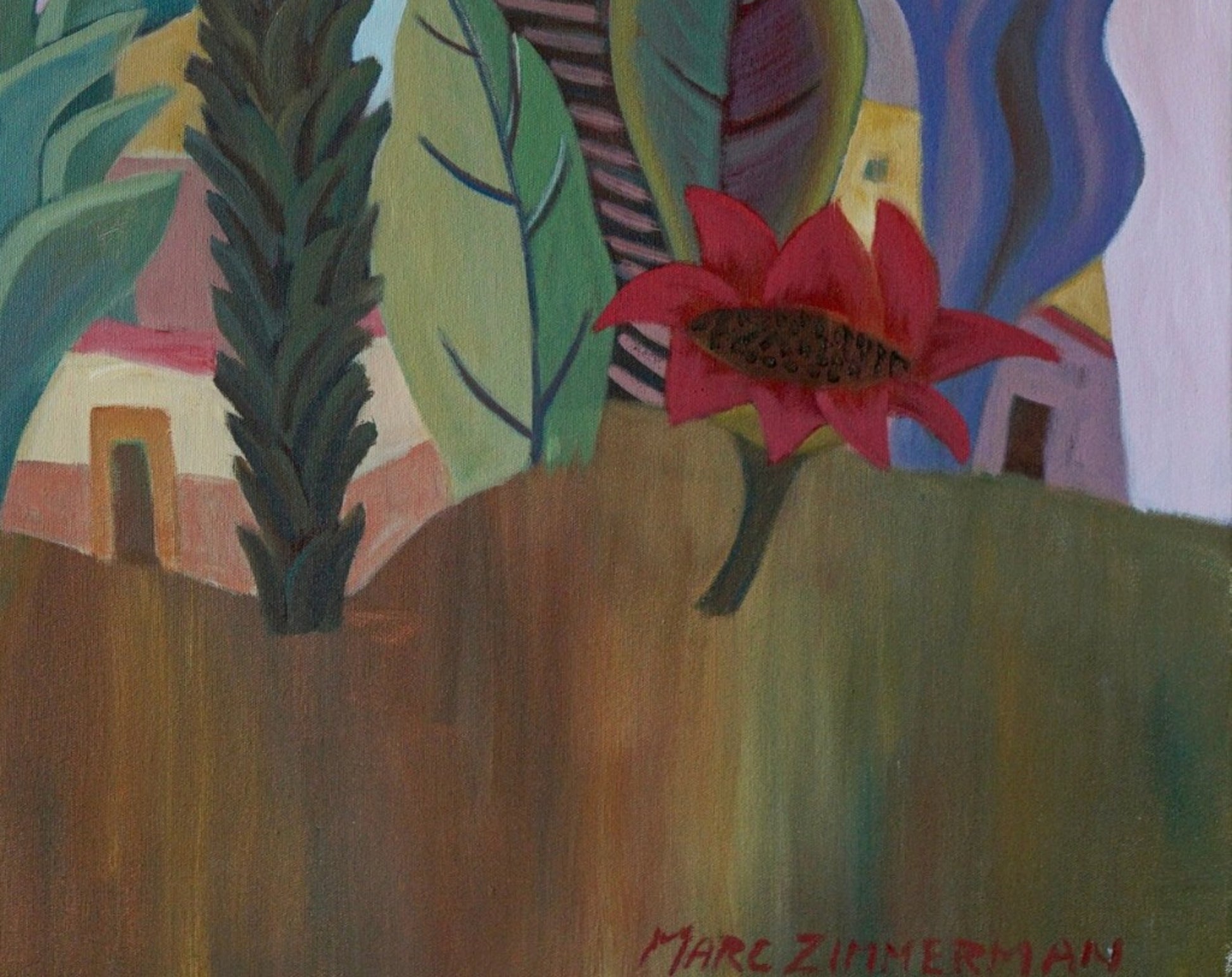 Marc Zimmerman is an American painter and ceramic sculptor based in Carmel-by-the-Sea, California, recognized for exuberant, color-driven works that fuse tropical imagery, figurative elements, and stylized botanical forms. Across both canvas and clay, his practice is defined by a playful visual language and a confident orchestration of color that feels at once joyful, intuitive, and structurally resolved.
