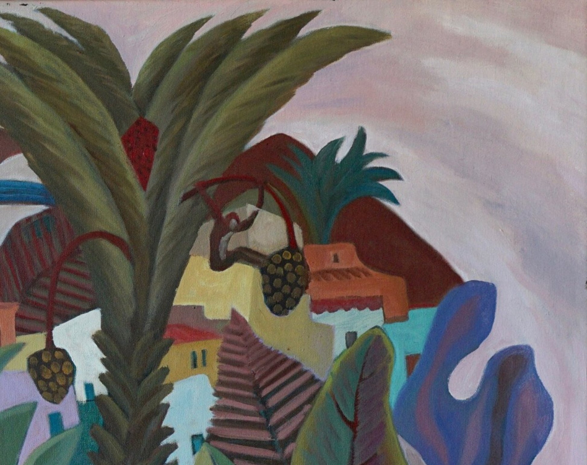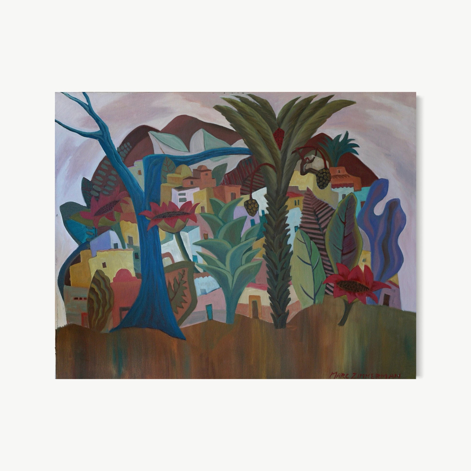 Zimmerman’s distinctive vocabulary was shaped early through his work in woodcut printmaking, which instilled the crisp edges and compositional clarity that continue to anchor his paintings today. His lush, immersive environments draw inspiration from the dreamlike worlds of Henri Rousseau and Paul Gauguin, while extended periods living and painting in Kauai, Hawaii, as well as time in Mexico and Europe, infused his work with the saturated light and rhythmic vitality that define his celebrated Jungle and Tropical Fantasy Floral series.