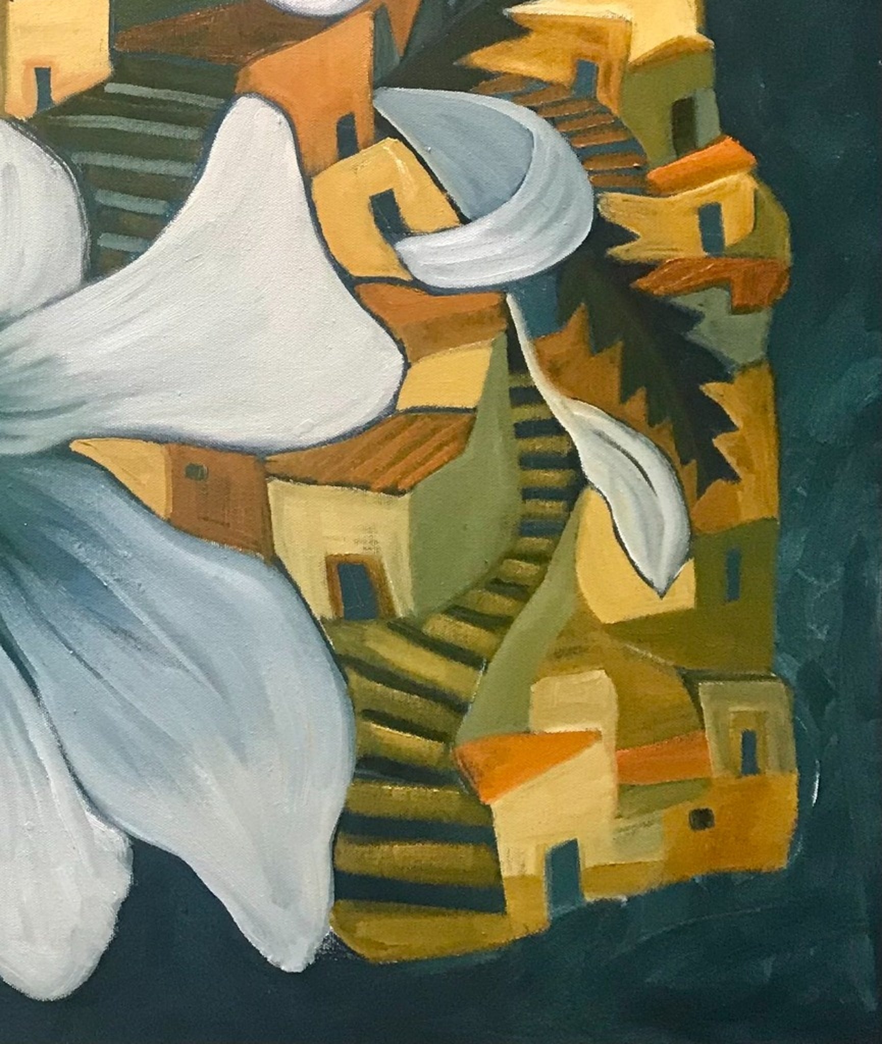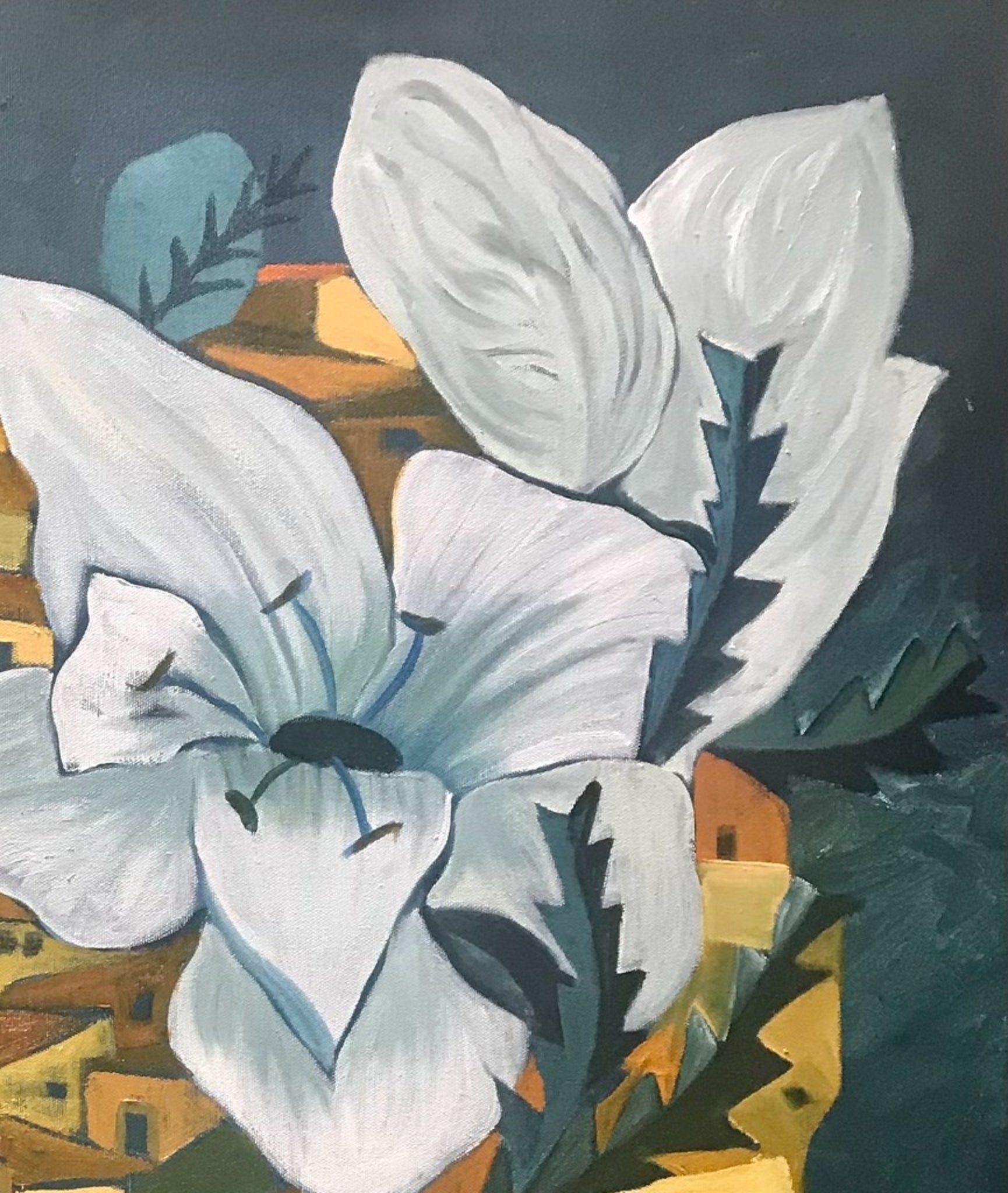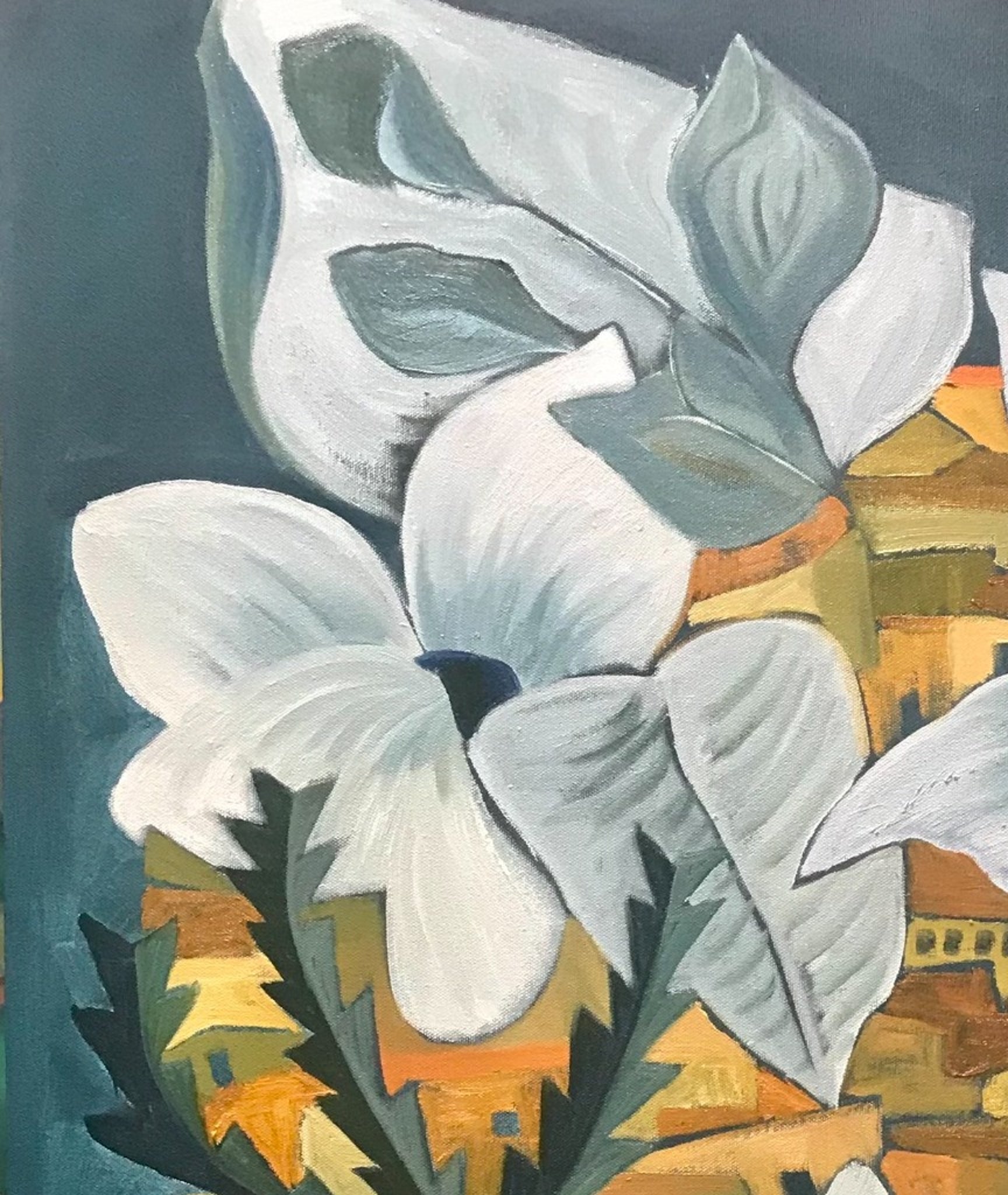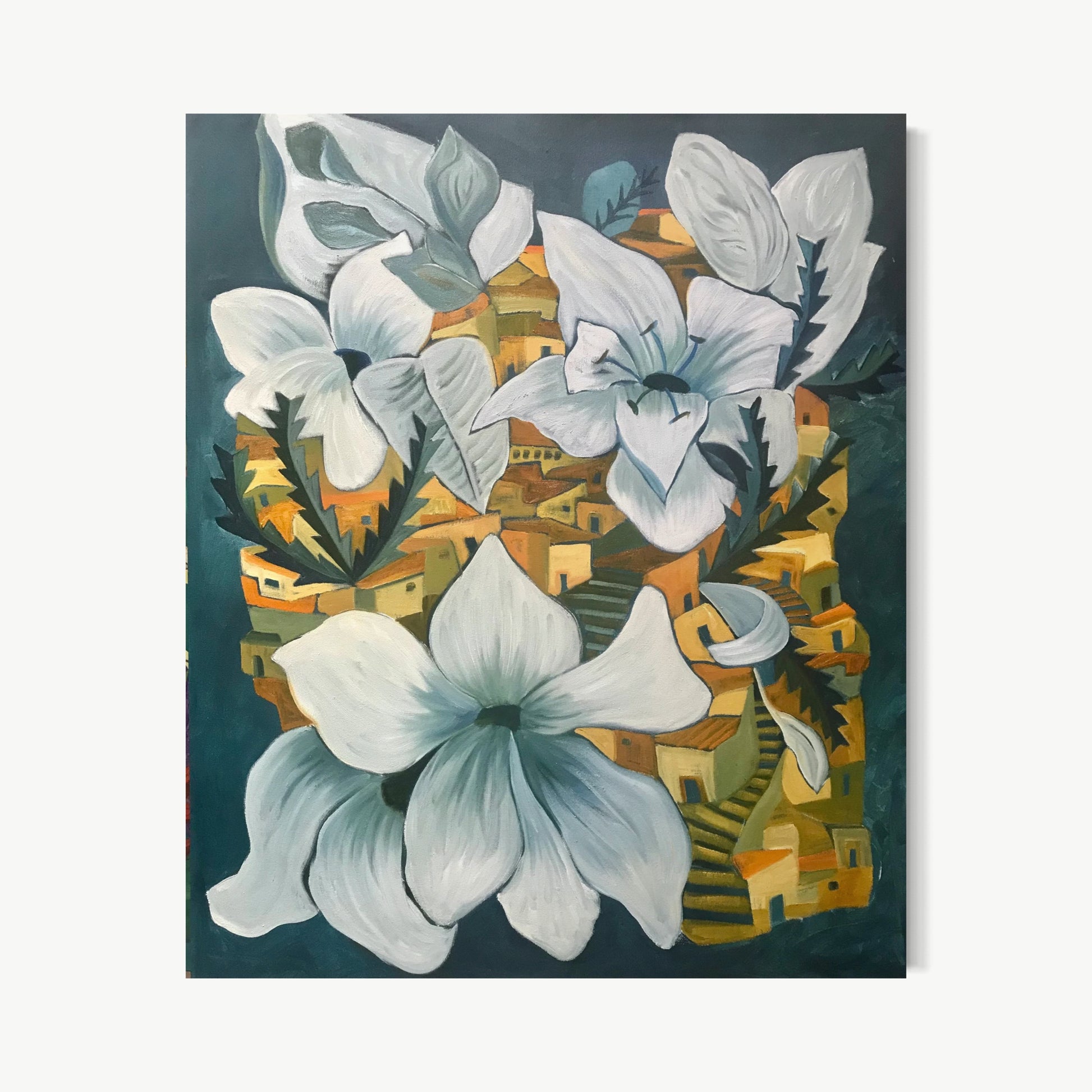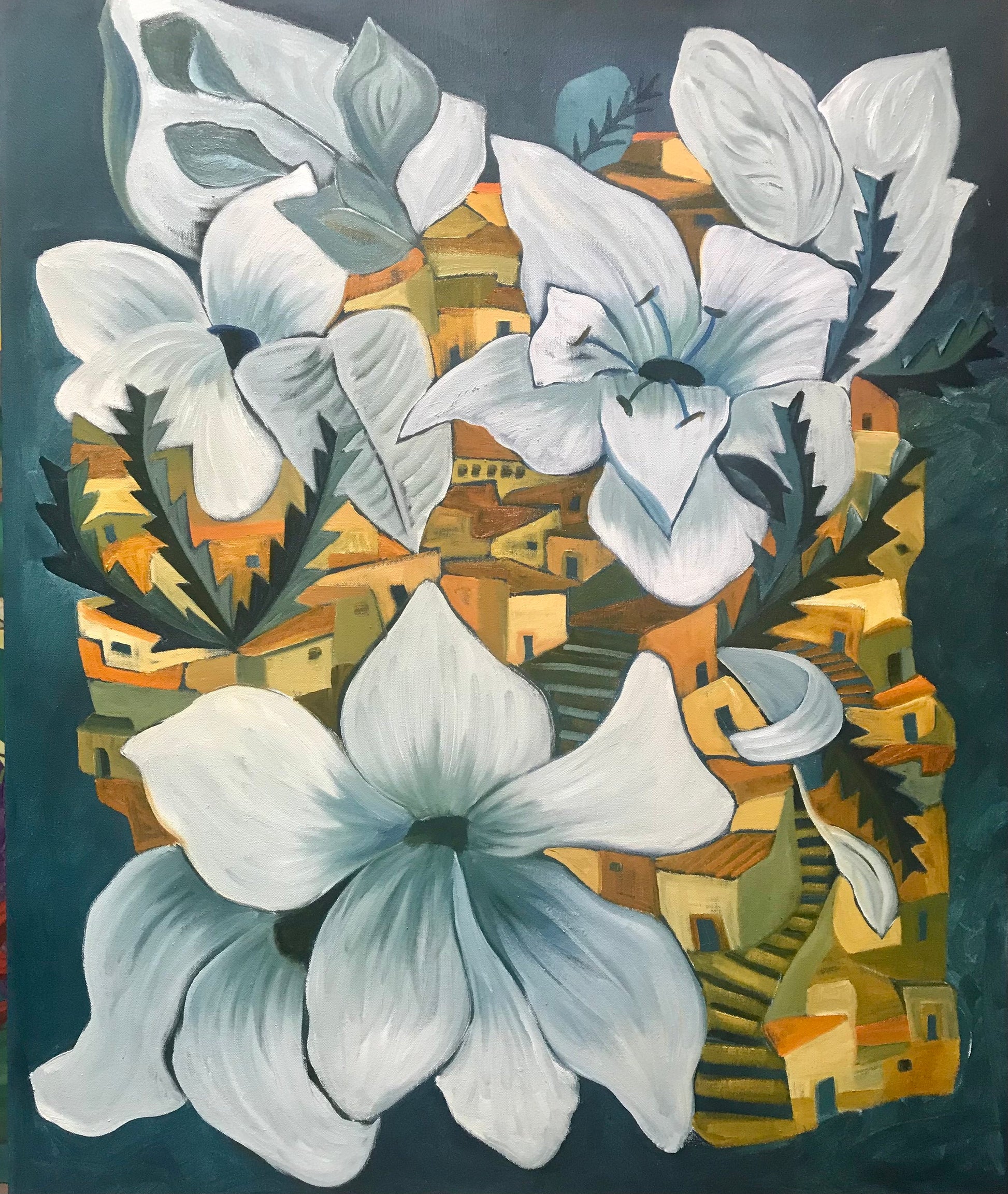 In this imaginative composition, Marc brings together architectural forms and oversized white florals in a way that feels both dreamlike and grounded. The village unfolds beneath the blooms, creating an engaging contrast between intimate built space and expansive botanical scale.