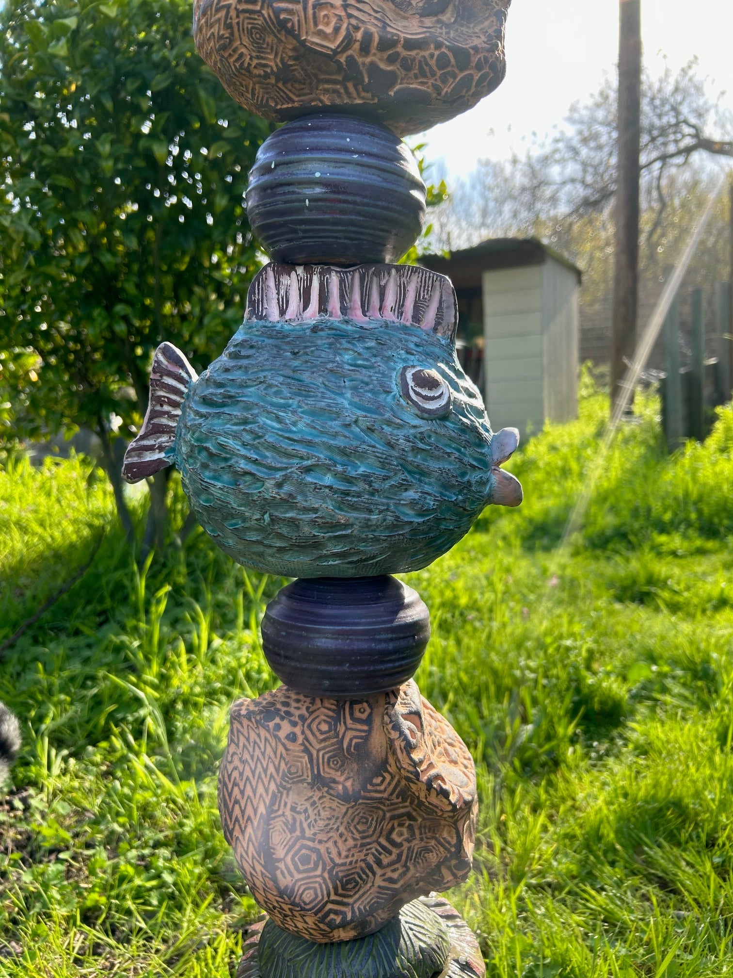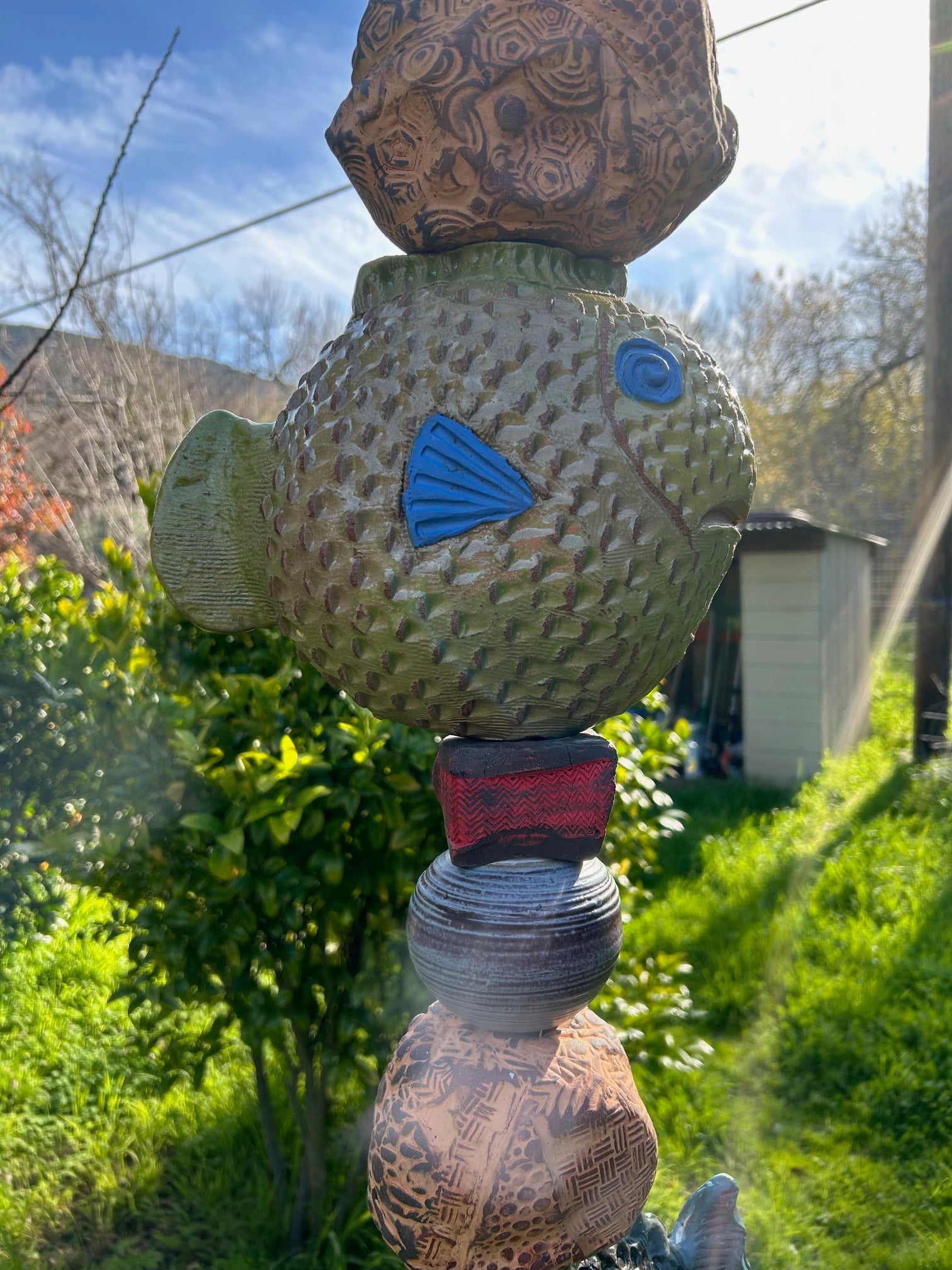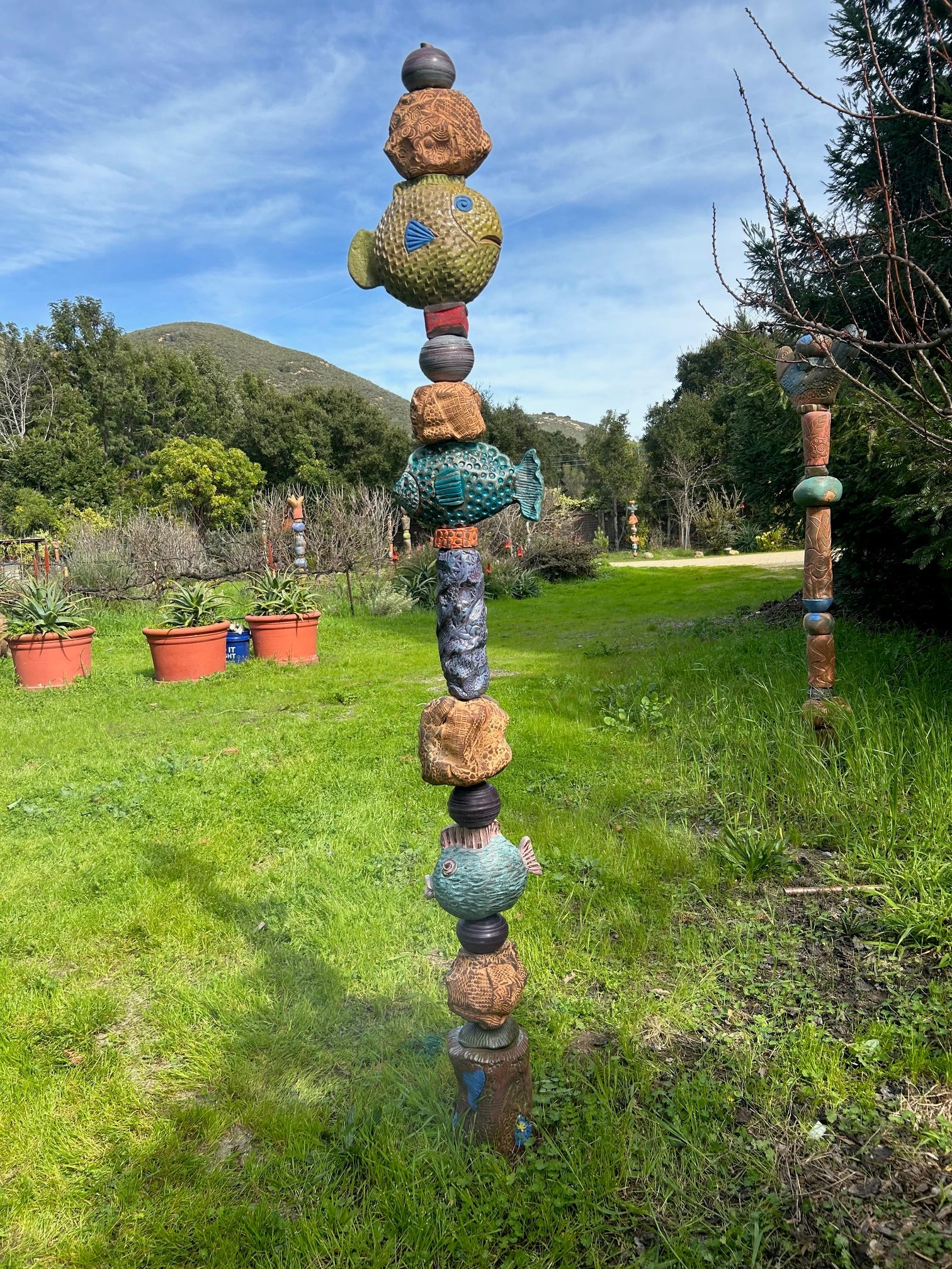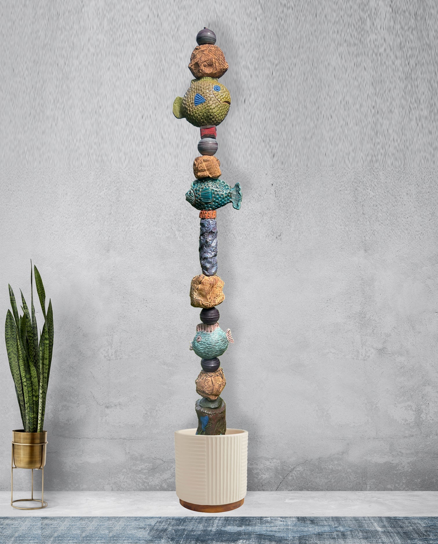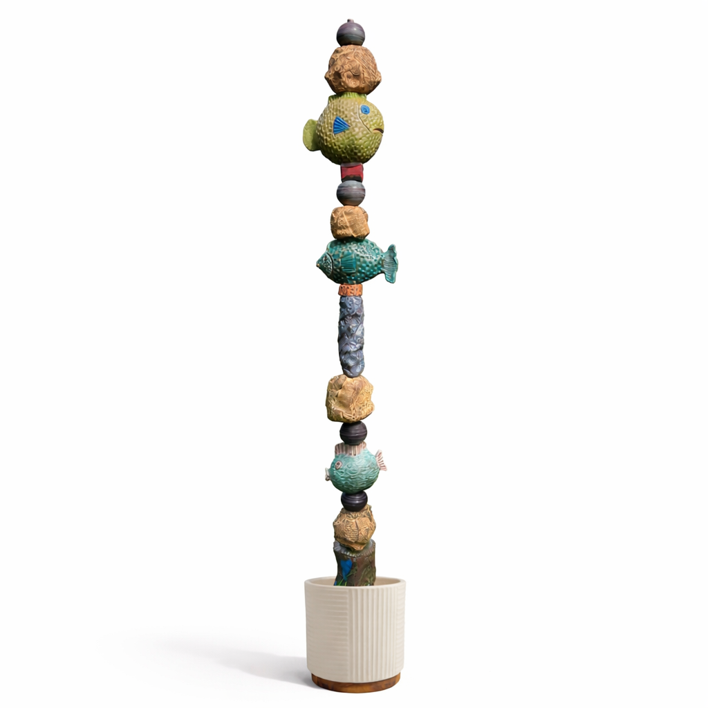 In recent years, Zimmerman has returned to his earliest artistic passion, clay, expanding his practice into the sculptural realm with his Garden Totems. These vertically stacked ceramic works are hand-built and individually glazed, each element supporting the next in a spontaneous, intuitive process. Rooted in his pottery background from Venice Beach in the 1960s and 70s, the totems translate his painterly sensibility into three dimensions, bringing the same sense of movement, humor, and joie de vivre into the garden or interior space.
