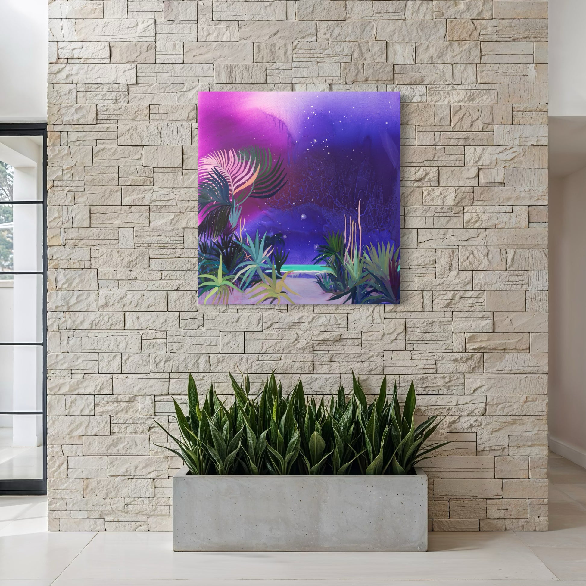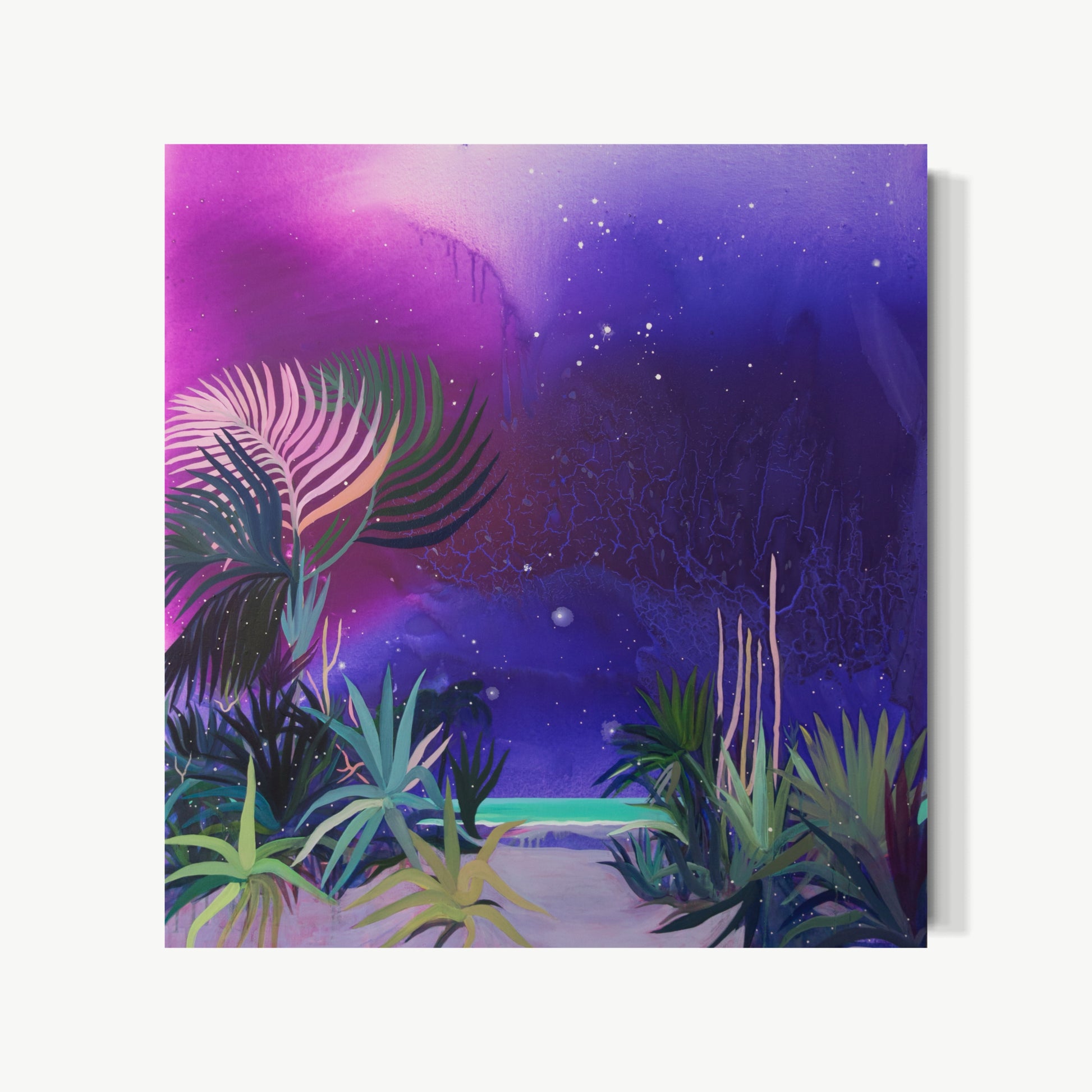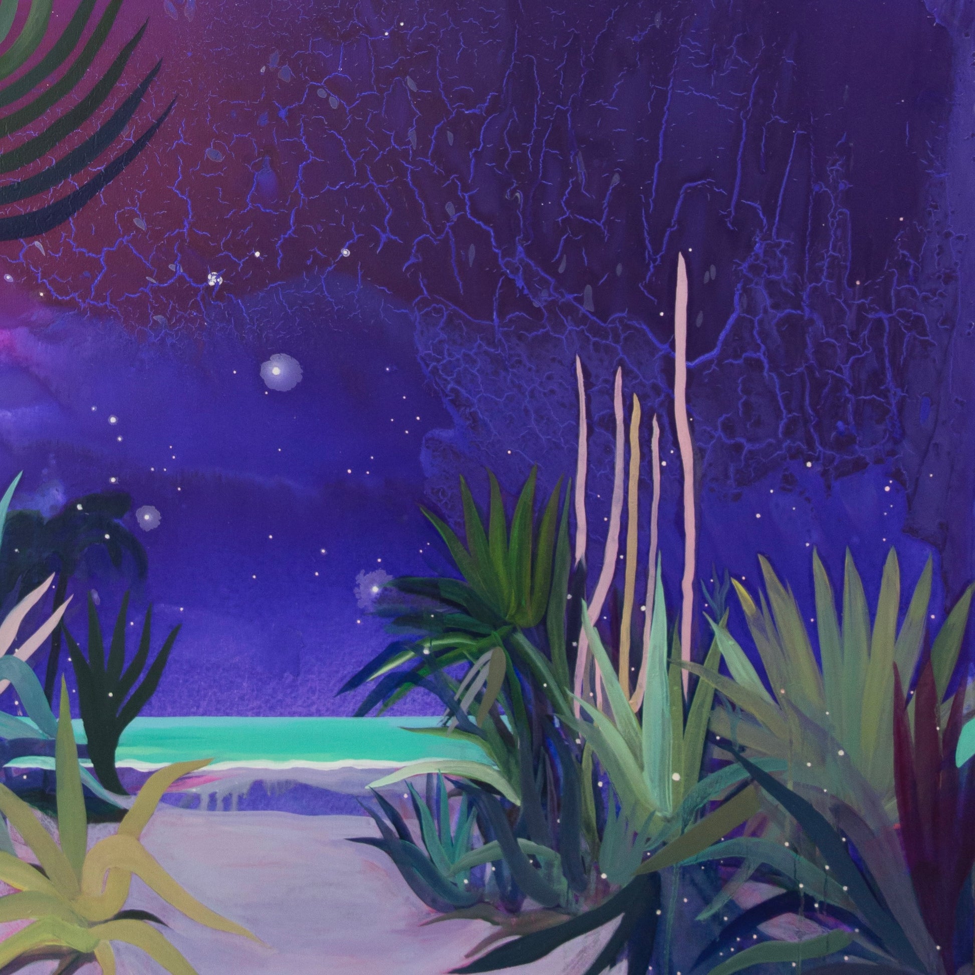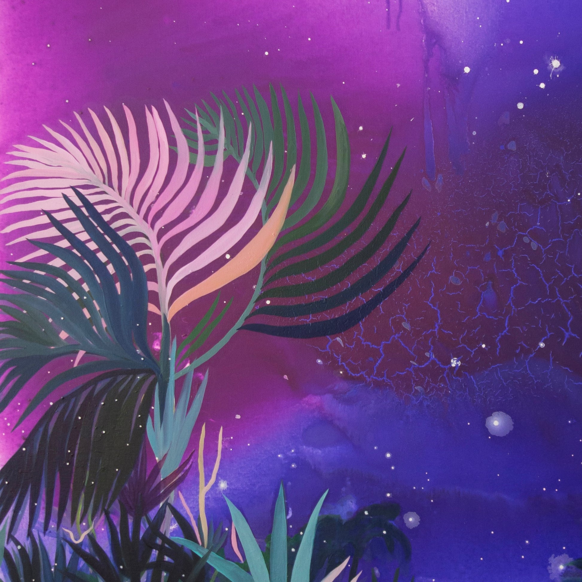 Your eye finds this painting from across the room. Tropical plants move forward into the foreground - agave and palm leaves catching a light that seems to come from nowhere. Behind them, the sky shifts slowly from magenta into deep violet, the paint opening in thin veins like something geological.