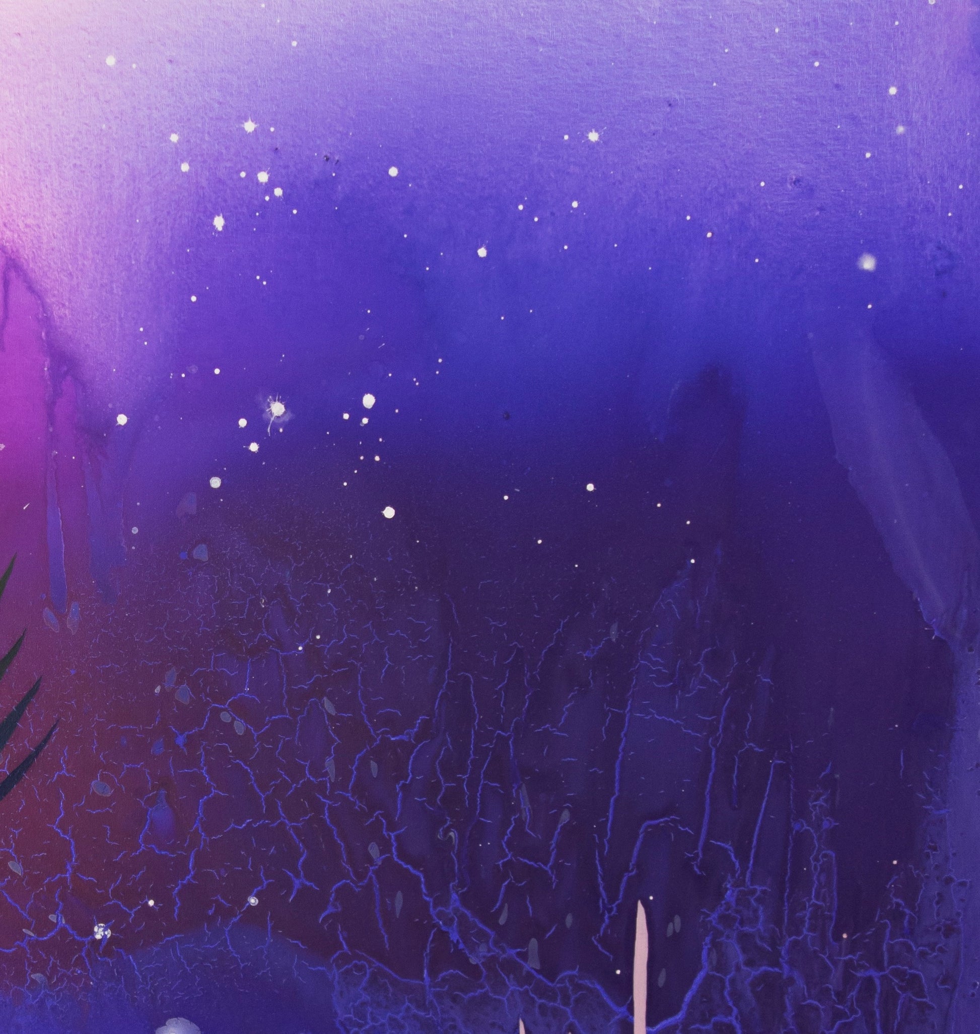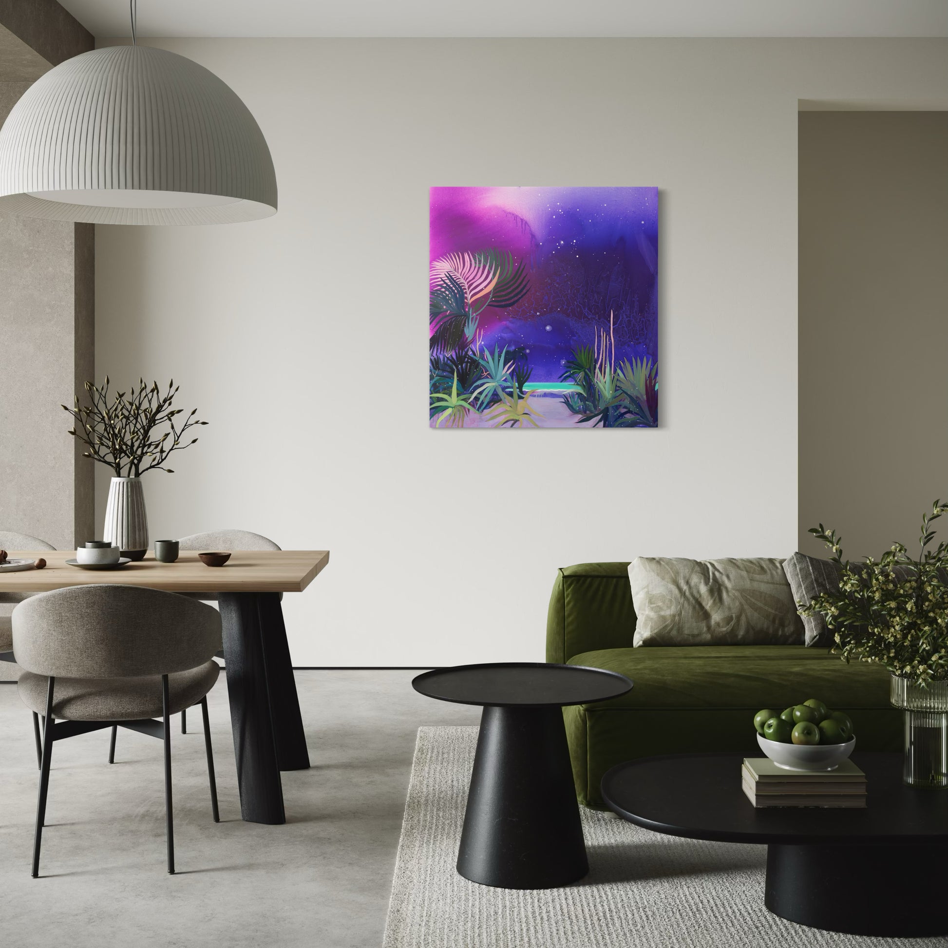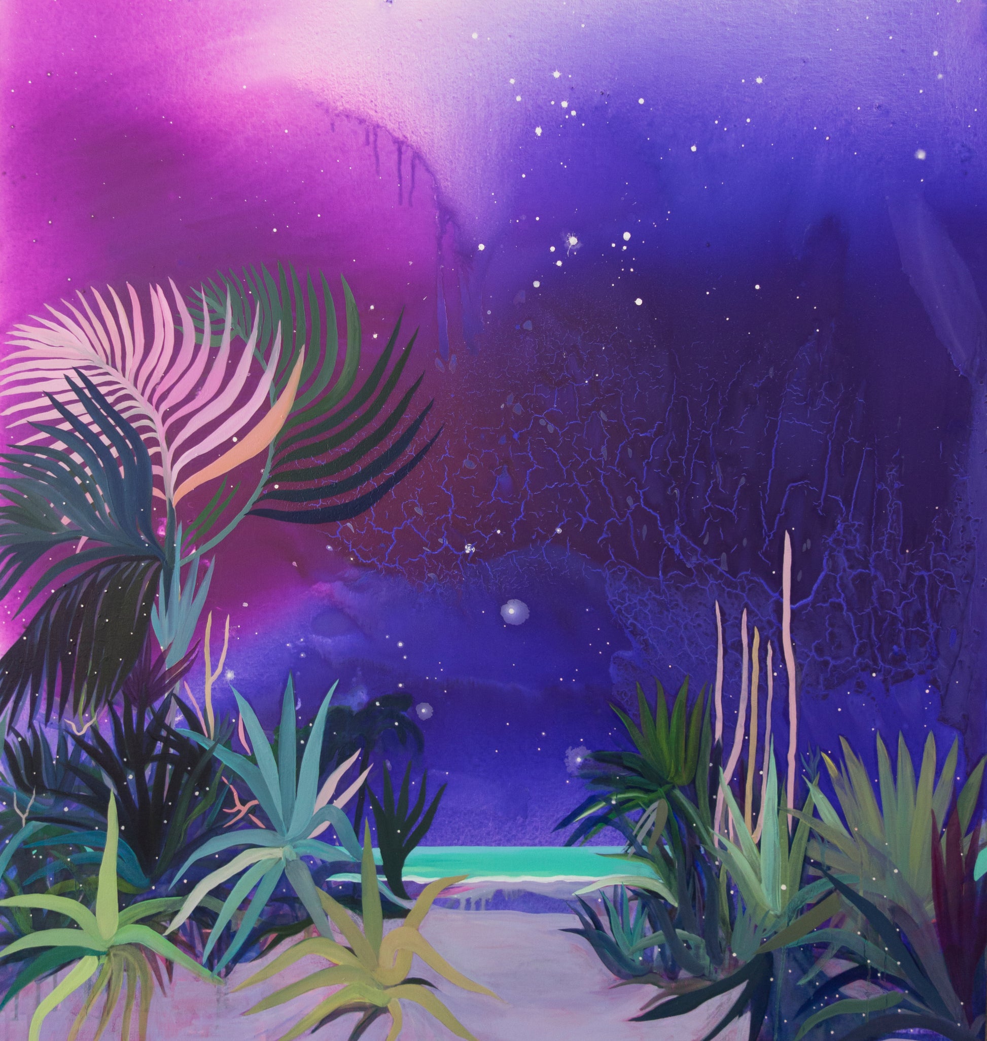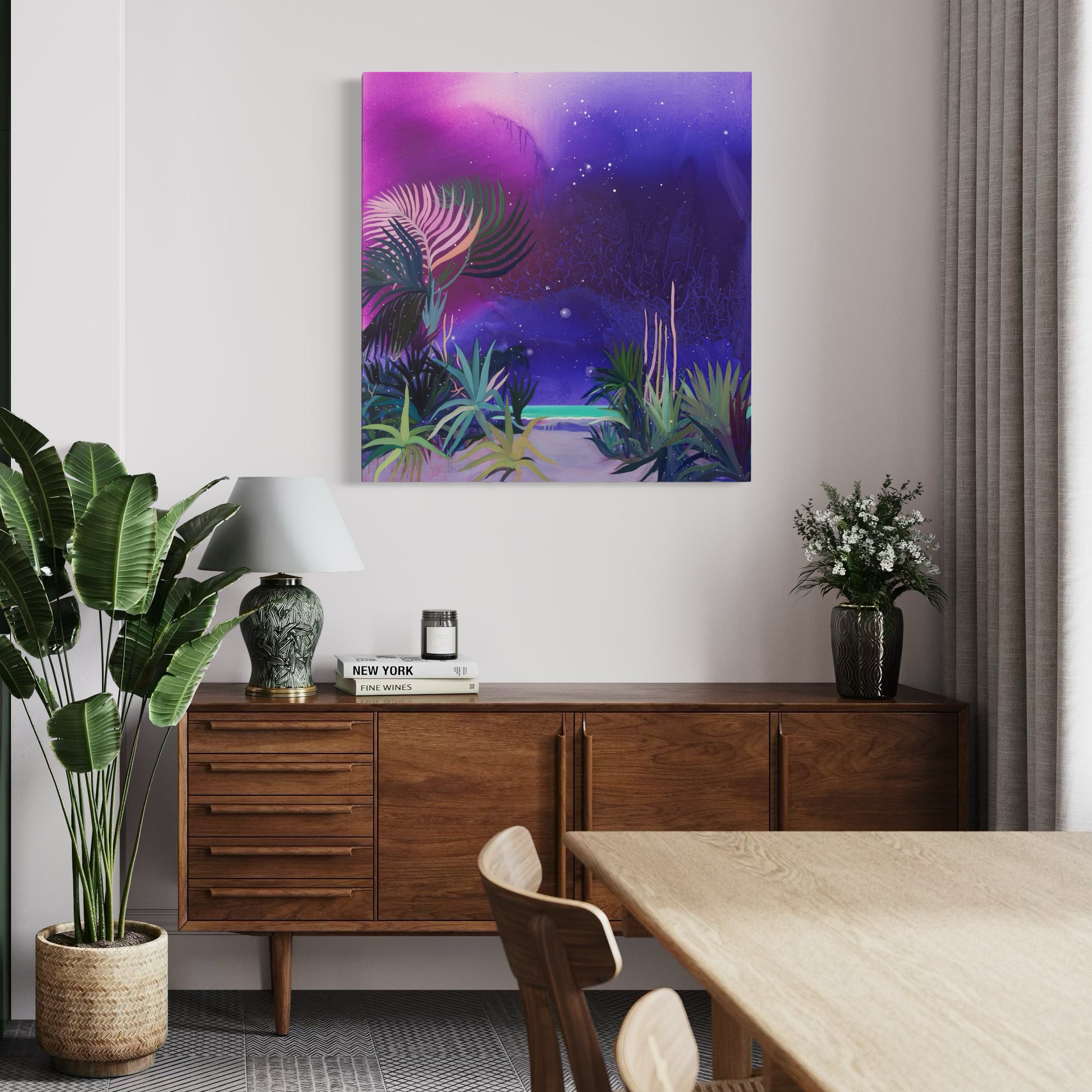Your eye finds this painting from across the room. Tropical plants move forward into the foreground - agave and palm leaves catching a light that seems to come from nowhere. Behind them, the sky shifts slowly from magenta into deep violet, the paint opening in thin veins like something geological.