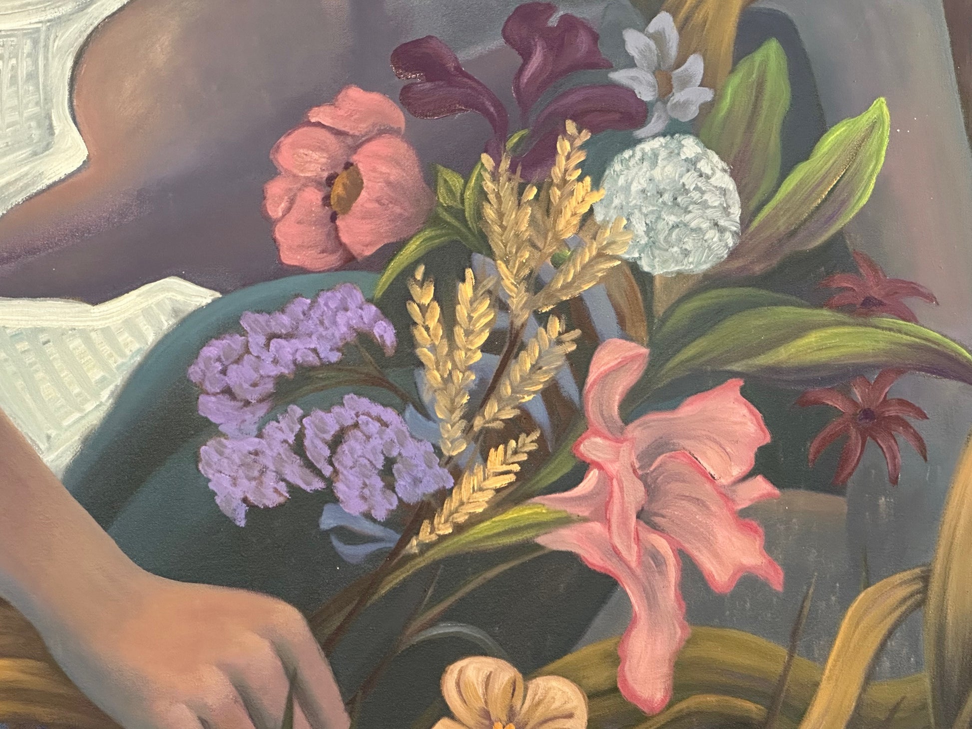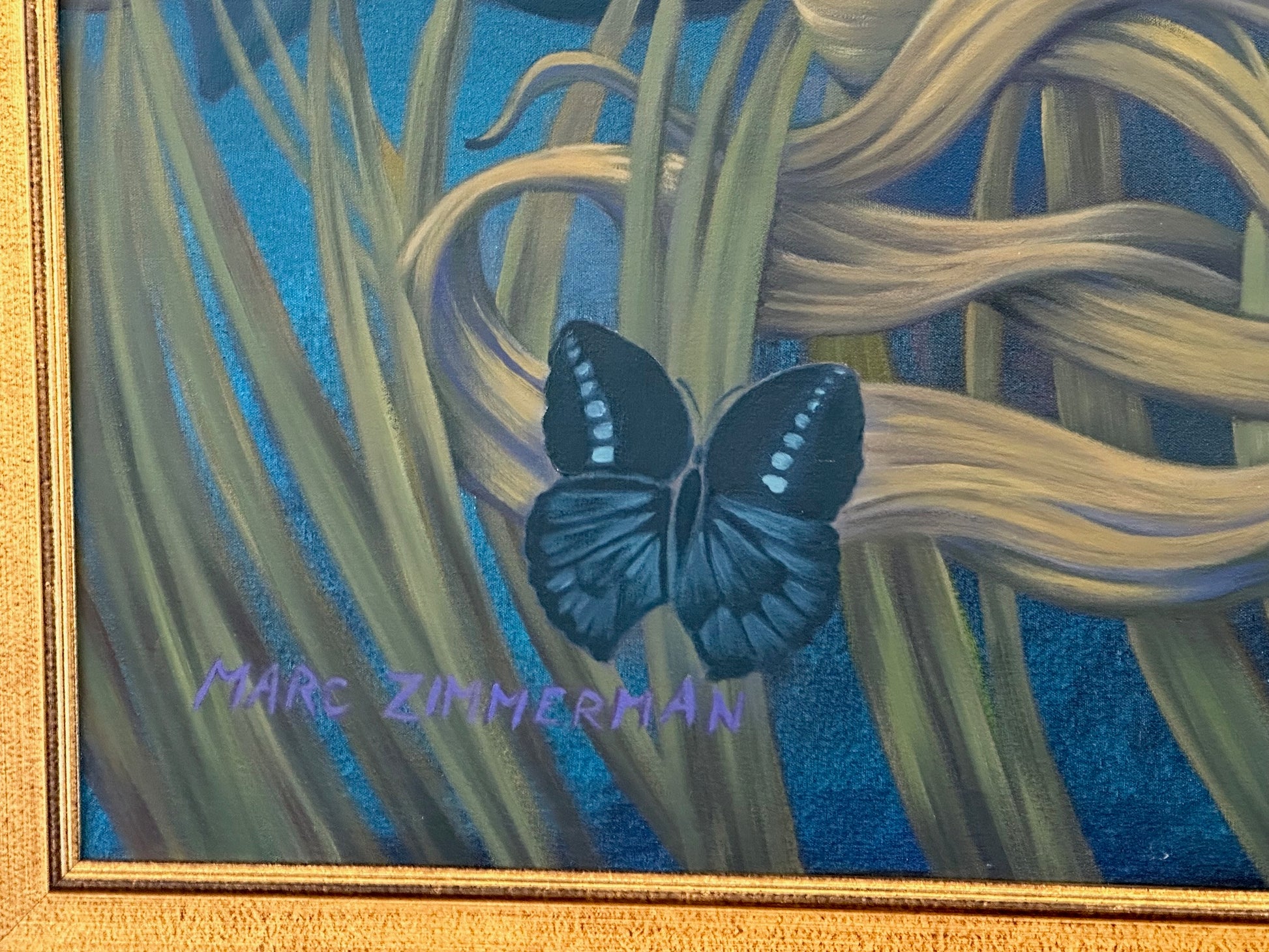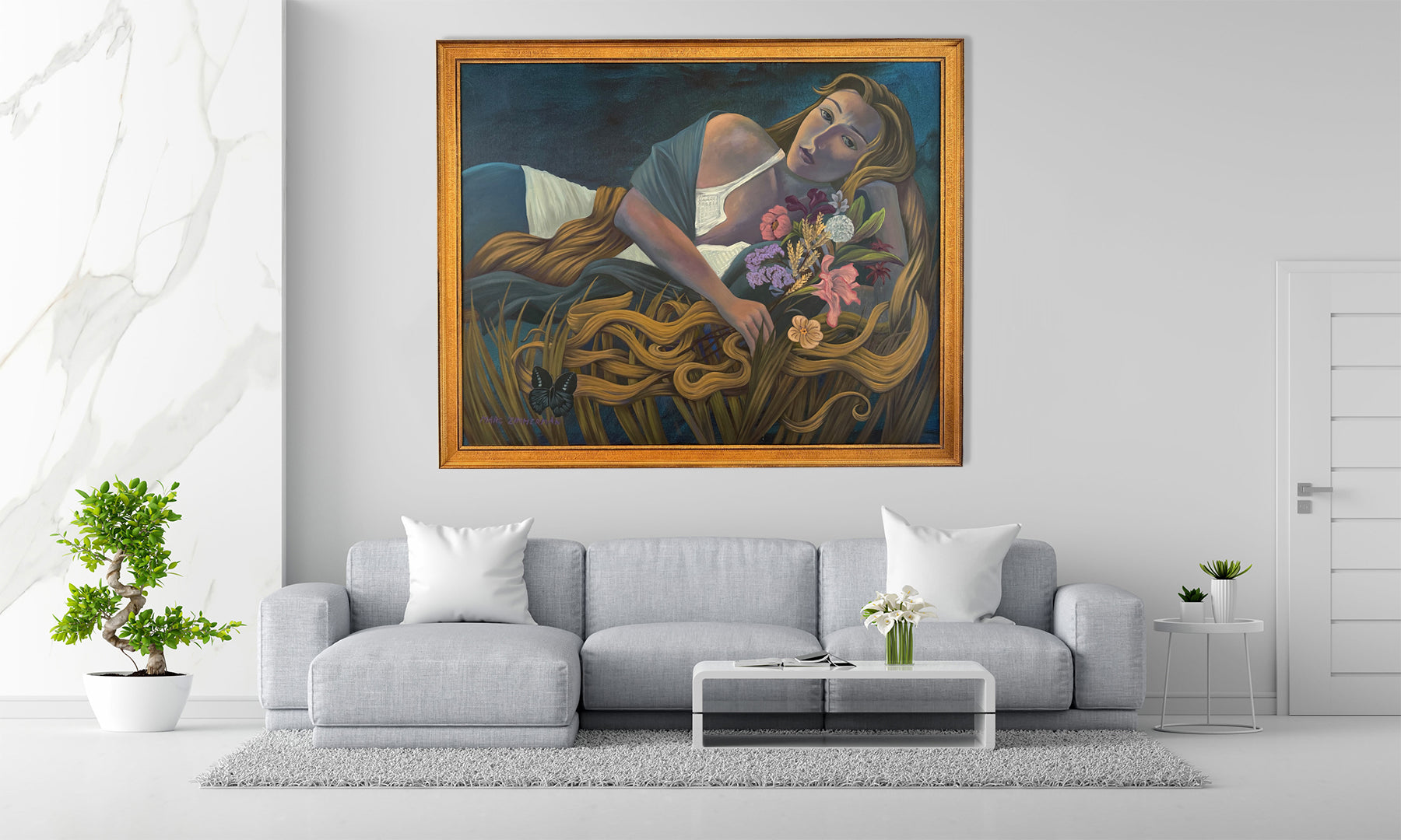 Soft florals and natural elements add warmth and narrative nuance, while Marc’s confident drawing keeps the composition clear and composed. At 48 by 60 inches, the work carries a strong, elegant presence on the wall. The painting currently comes with the contemporary gold frame shown, though the frame can be changed upon request.