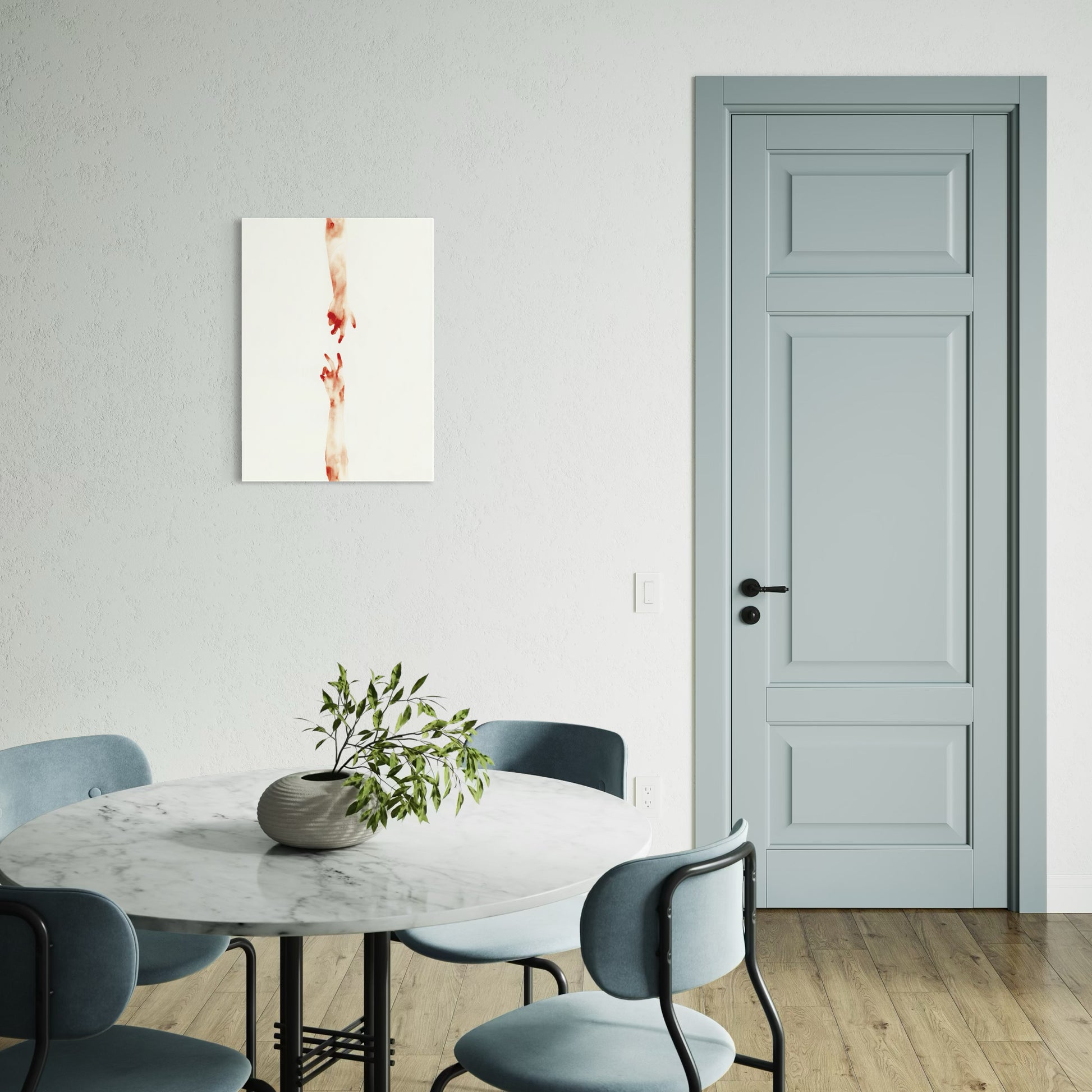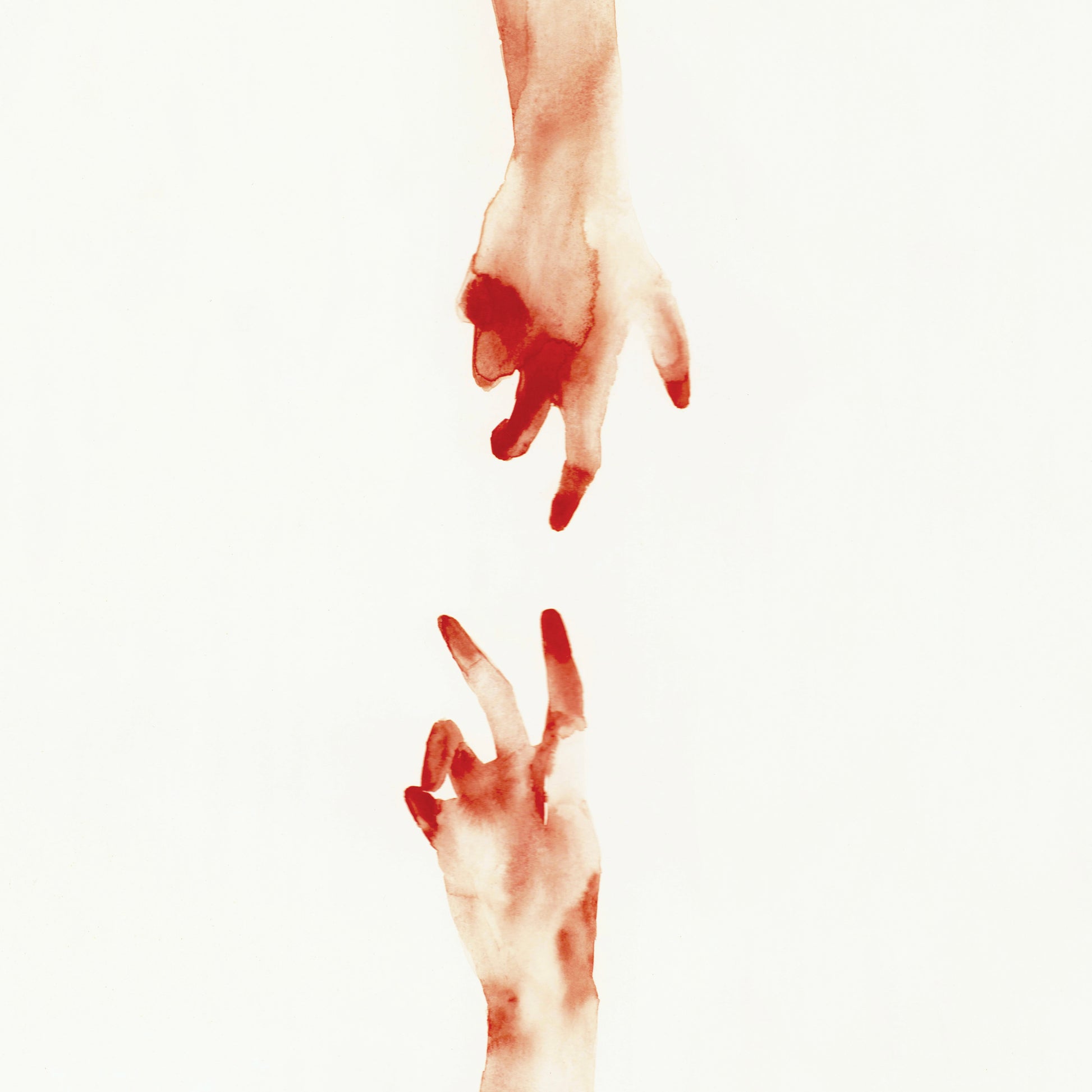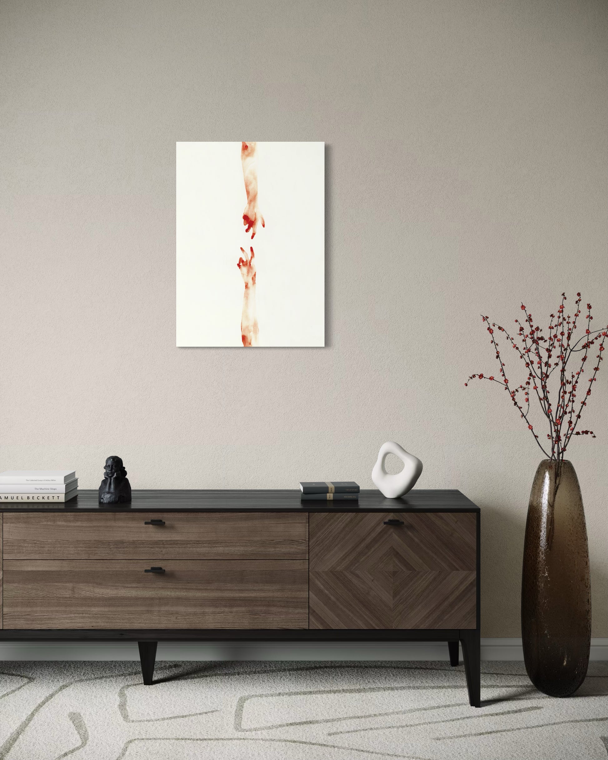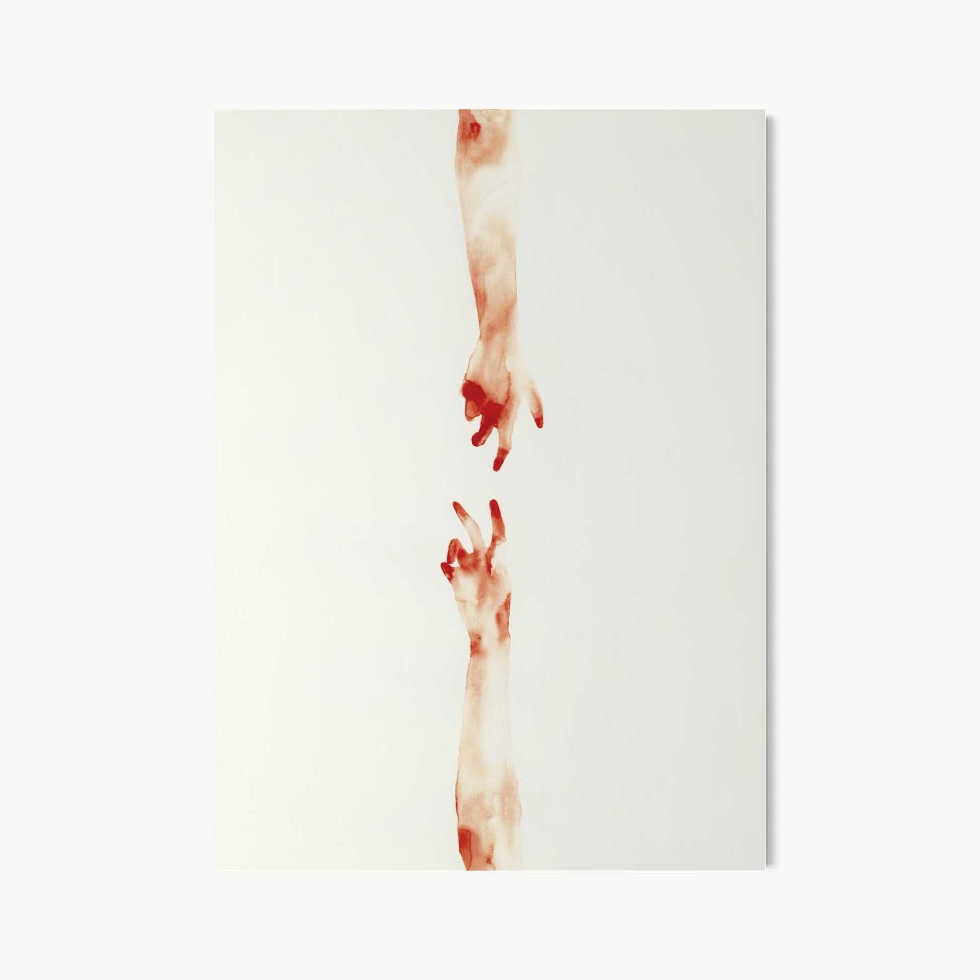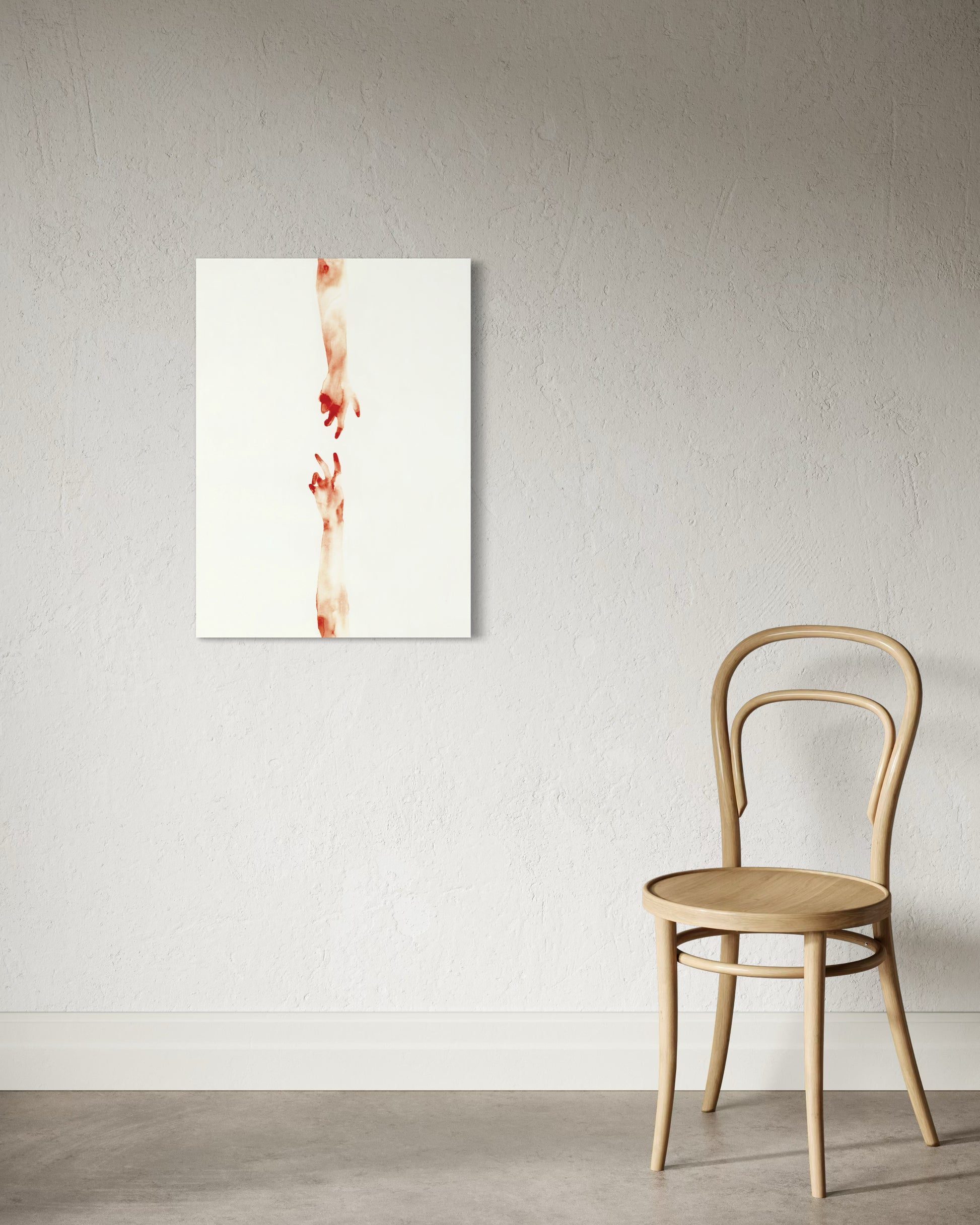 Cuddemi returns again and again to the hand - reaching, holding, almost touching. It is where connection begins and where it is most honestly felt. She gives them space to breathe, setting them against white and letting the gesture speak. Whether two hands drift toward each other across open space or arms intertwine in something between tension and tenderness, the hand carries everything. No faces are needed. In her work, a hand becomes a whole conversation.