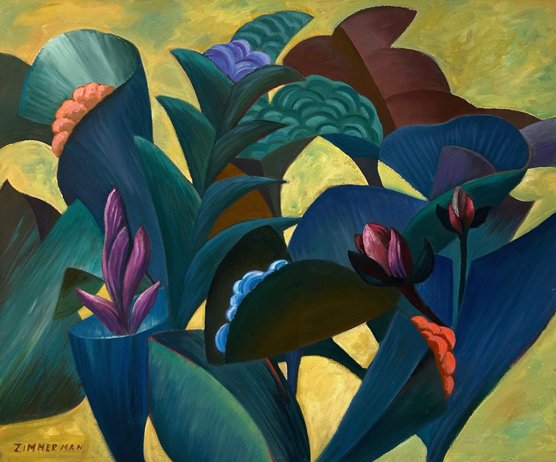 You are inside the garden here, not looking at it. Zimmerman puts you low among the leaves, surrounded by deep teal and blue-green forms that push right to the edges of the canvas. Then slowly, the smaller things appear. A coral floret half-hidden in the foliage. A purple bloom lifting itself from the lower left. A red bud catching the light near the right edge. That yellow-green glow moving through the gaps is not background. It feels like actual sun coming through.