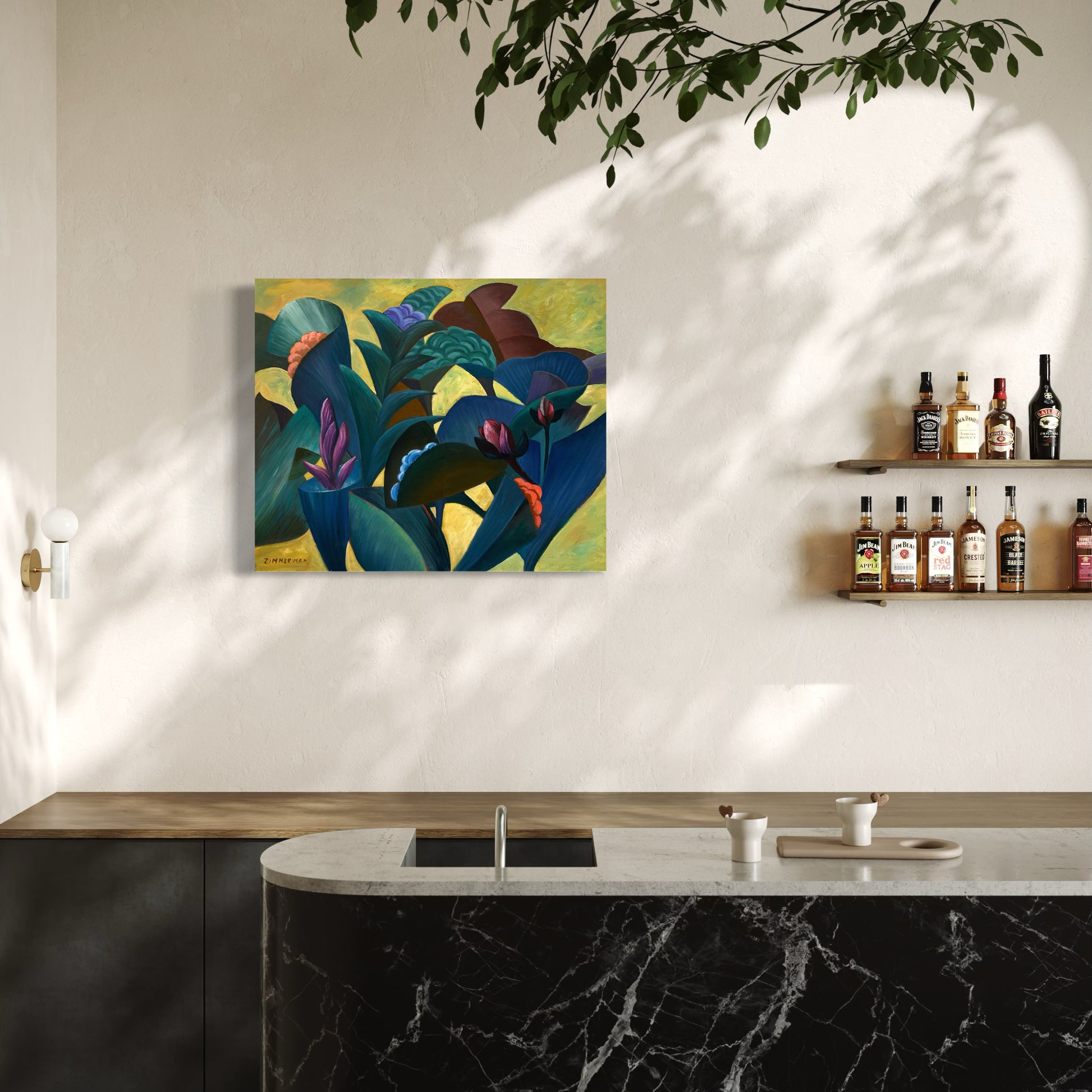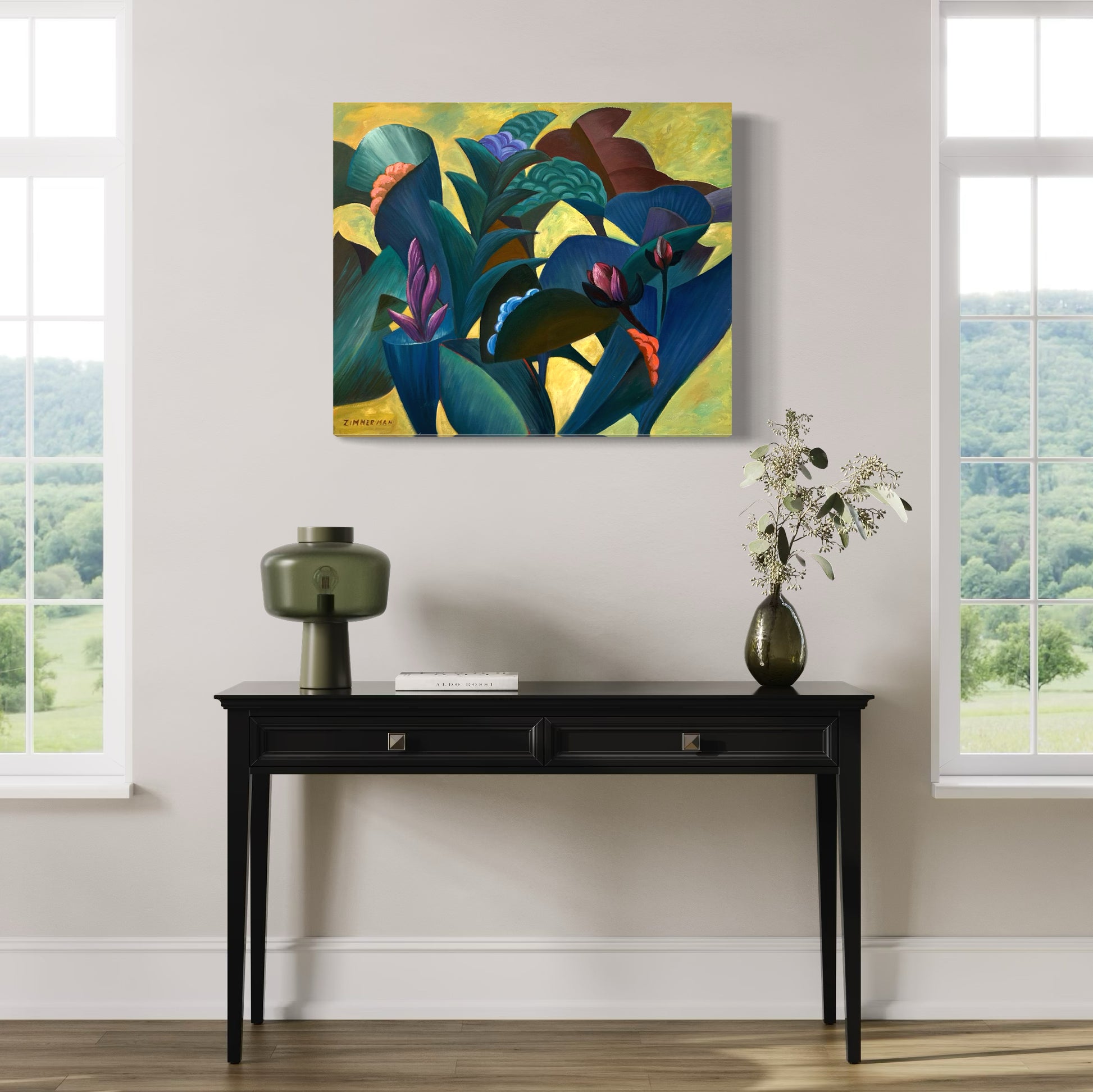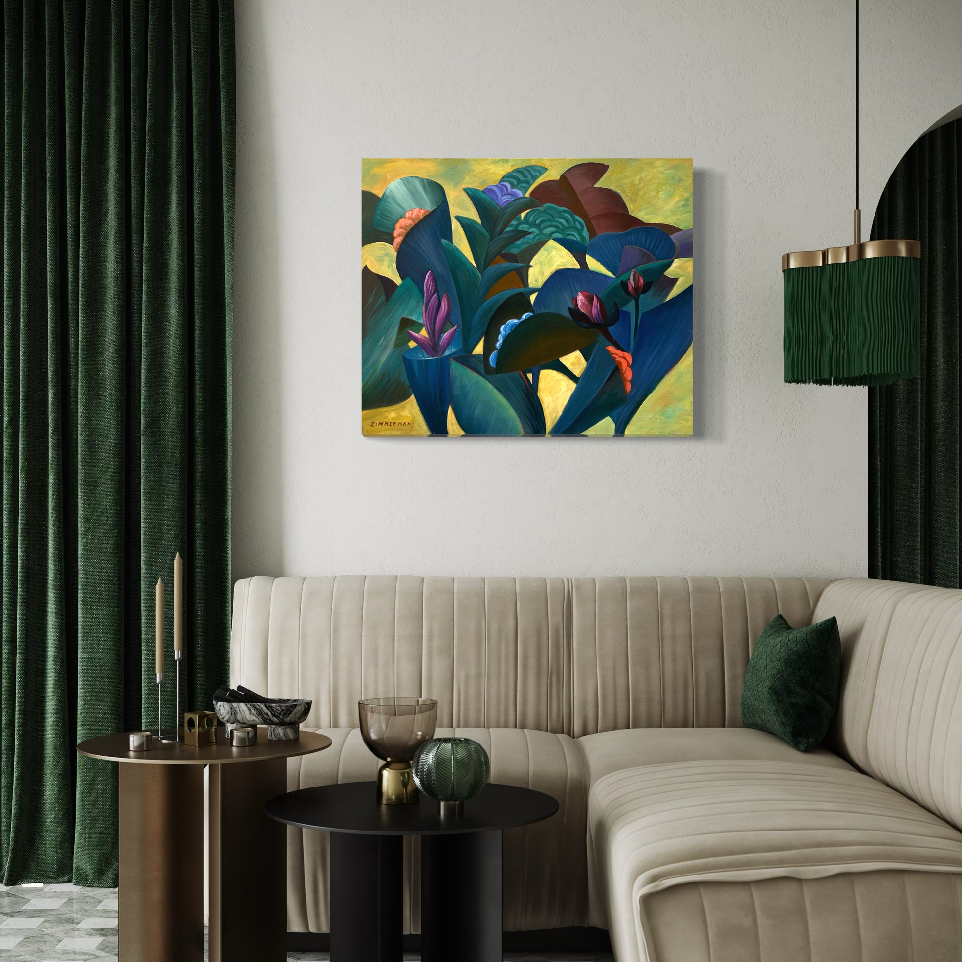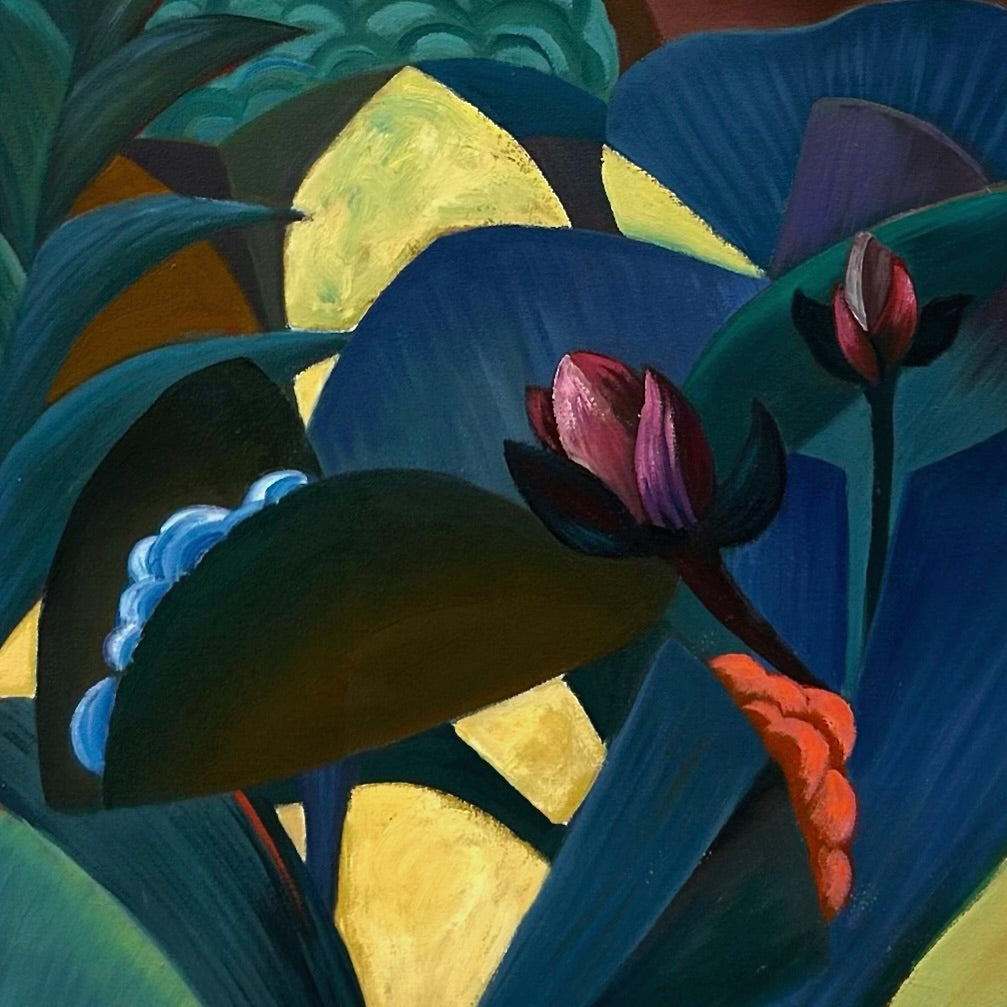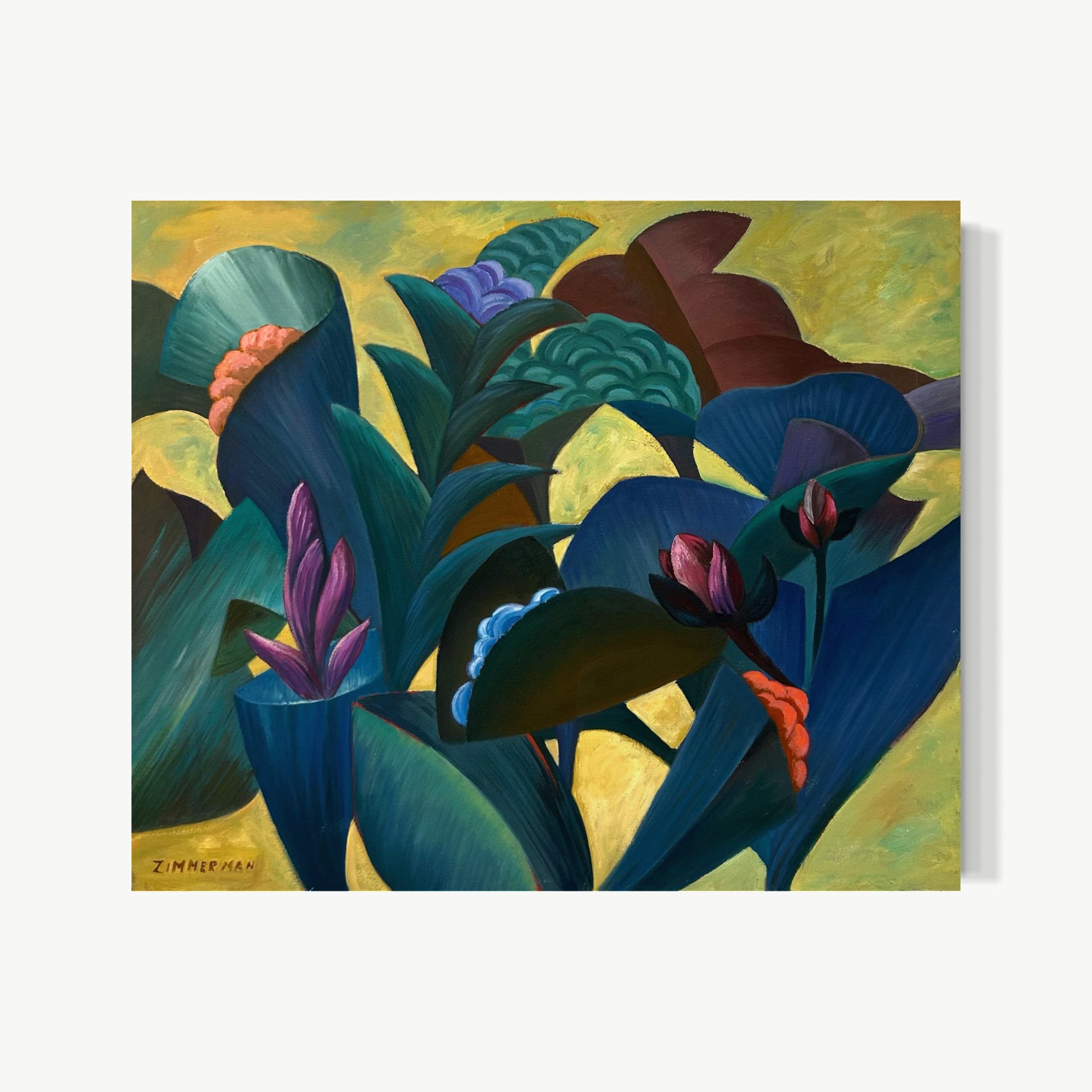 Zimmerman’s distinctive vocabulary was shaped early through his work in woodcut printmaking, which instilled the crisp edges and compositional clarity that continue to anchor his paintings today. His lush, immersive environments draw inspiration from the dreamlike worlds of Henri Rousseau and Paul Gauguin, while extended periods living and painting in Kauai, Hawaii, as well as time in Mexico and Europe, infused his work with the saturated light and rhythmic vitality that define his celebrated Jungle and Tropical Fantasy Floral series.