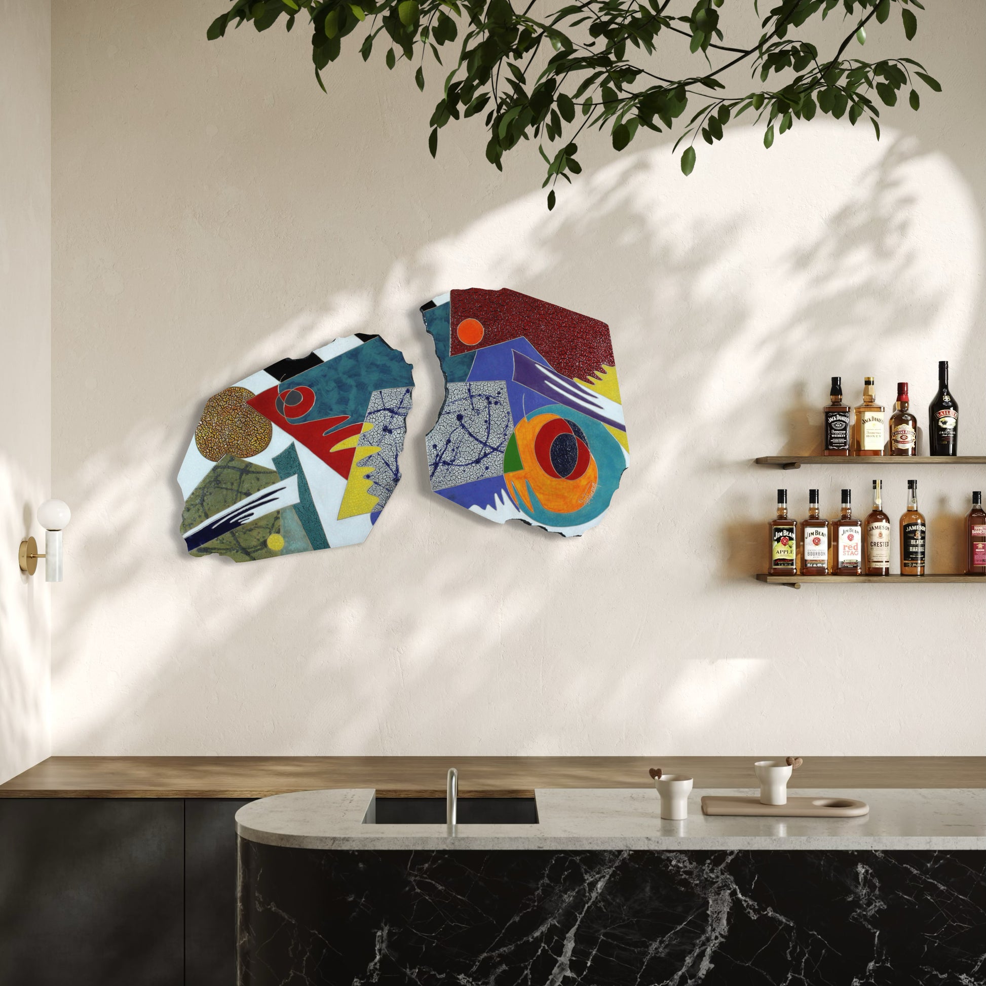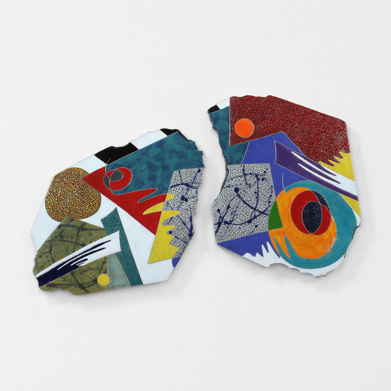 Two large irregular slabs, each carrying a bold and complex surface. The left slab is warmer, a large textured golden-ochre circle dominating the face, with expressive dark marks drawn through the lighter ground. The right slab shifts into a cooler register, deep red and crackled burgundy at the top, a bold orange circular form at the centre, and drawn blue lines adding surface complexity throughout.