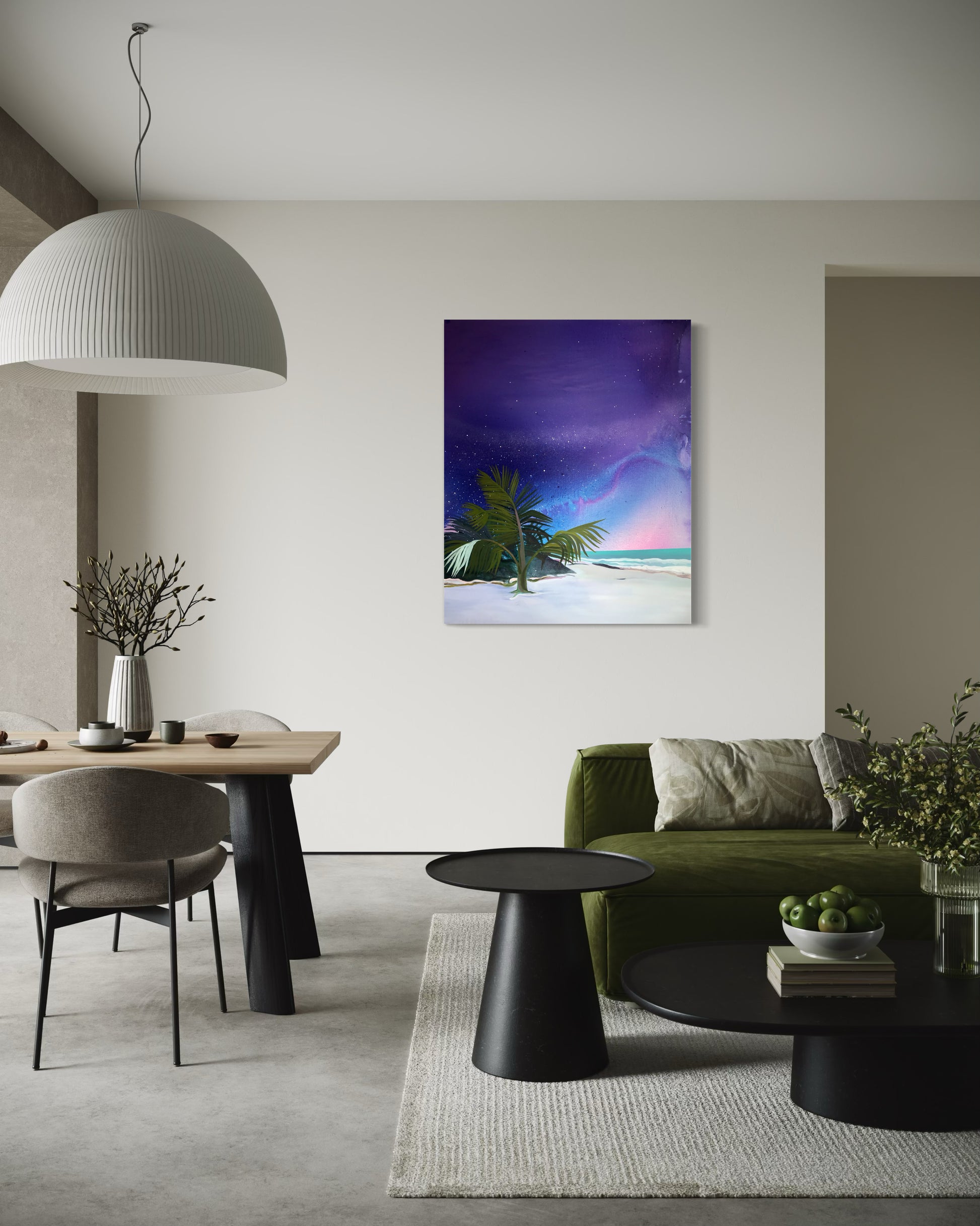 At the center, a narrow line of turquoise ocean quietly holds everything together. Javiera has lived in Mexico for nearly a decade, and you can feel that landscape here - the density of the vegetation, the charged stillness of a tropical night.