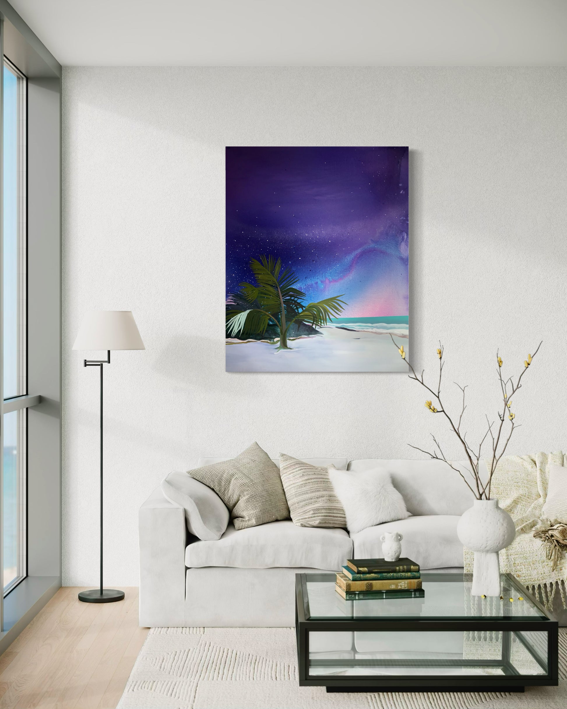 Your eye finds this painting from across the room. Tropical plants move forward into the foreground - agave and palm leaves catching a light that seems to come from nowhere. Behind them, the sky shifts slowly from magenta into deep violet, the paint opening in thin veins like something geological.