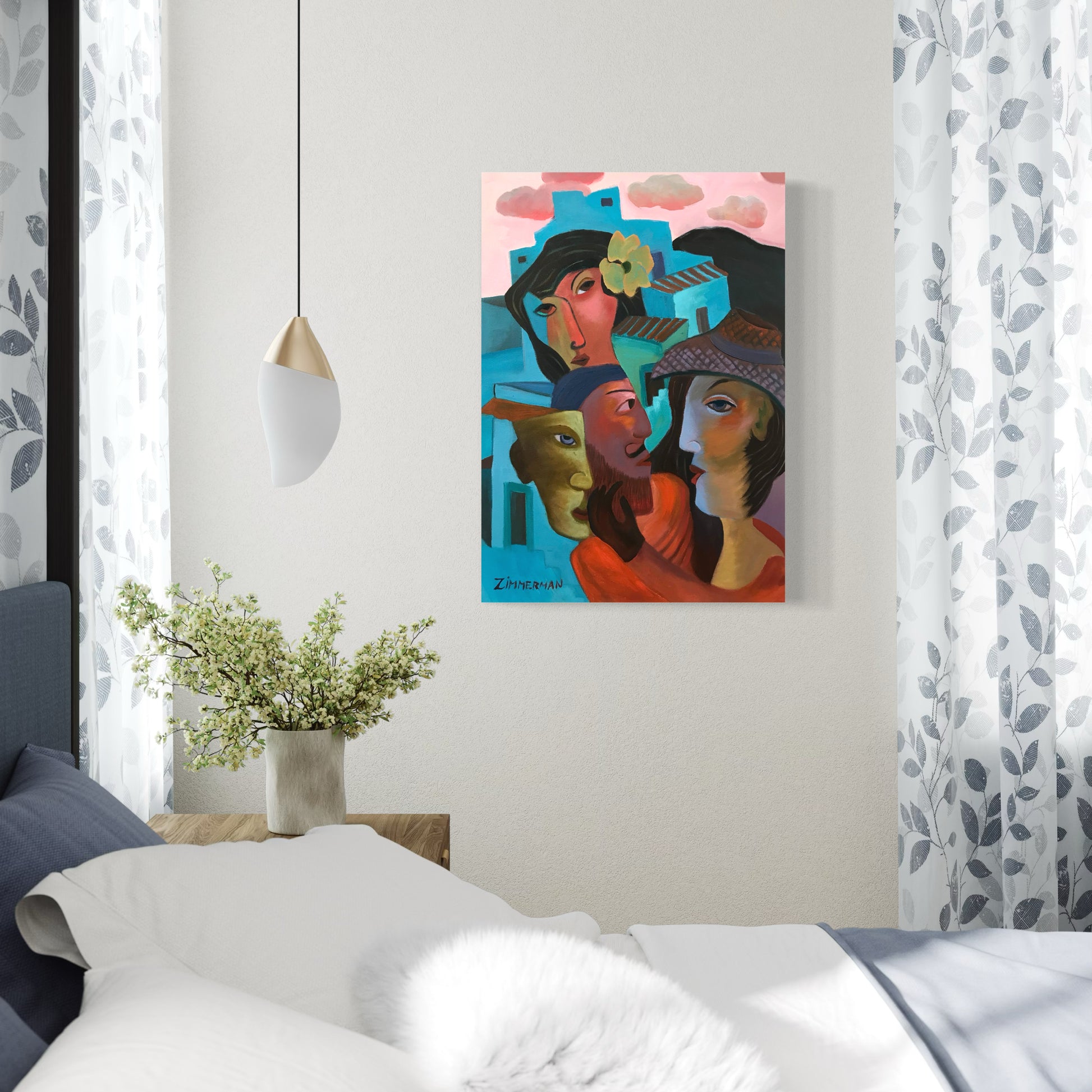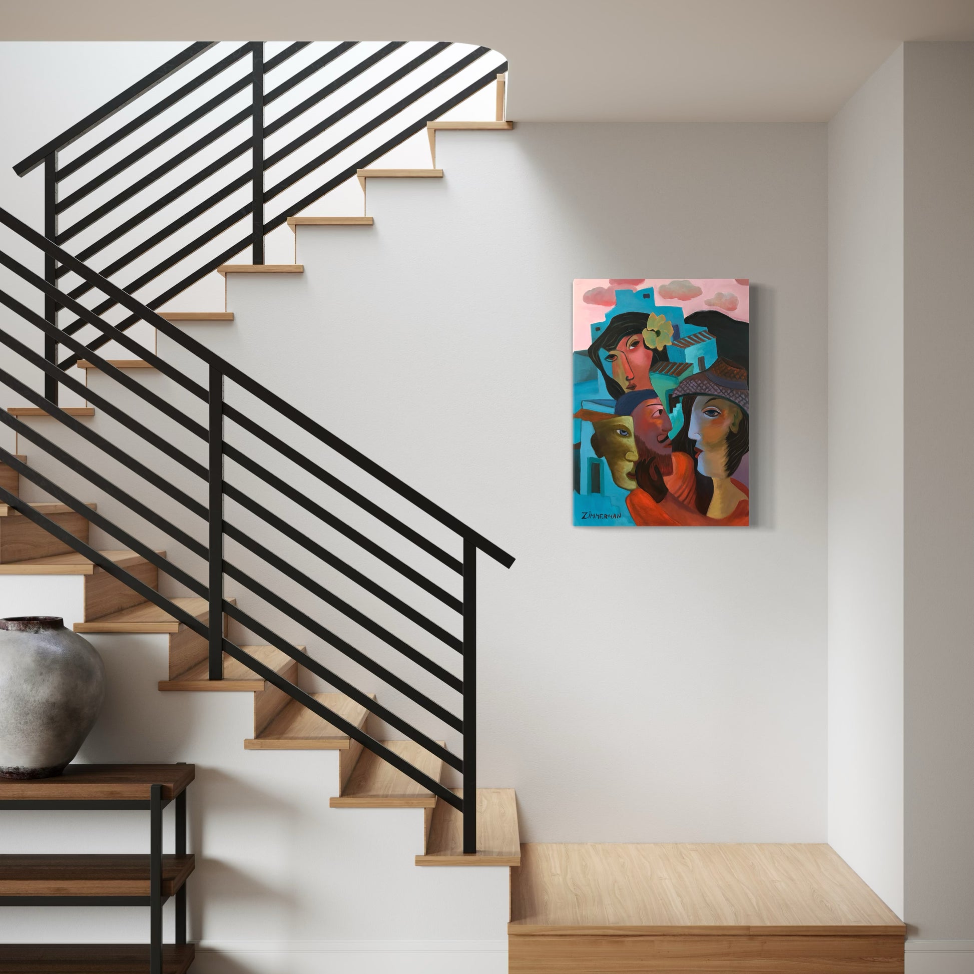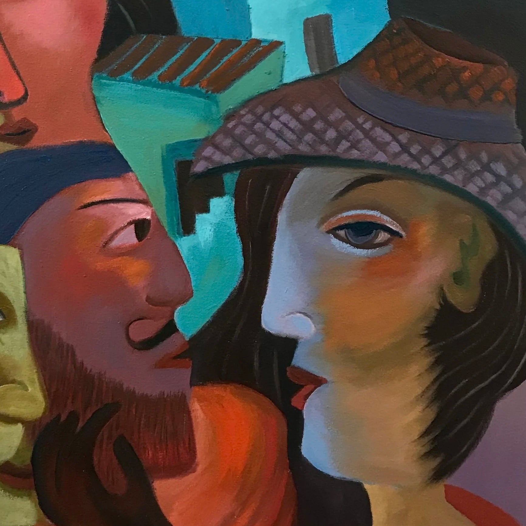 Four faces press close together, each angled slightly differently, set against pale blue architecture and a soft pink sky. At the center, a bearded figure extends a mask toward the viewer. That single gesture shifts the entire scene, prompting a quiet uncertainty about what is revealed and what is concealed.