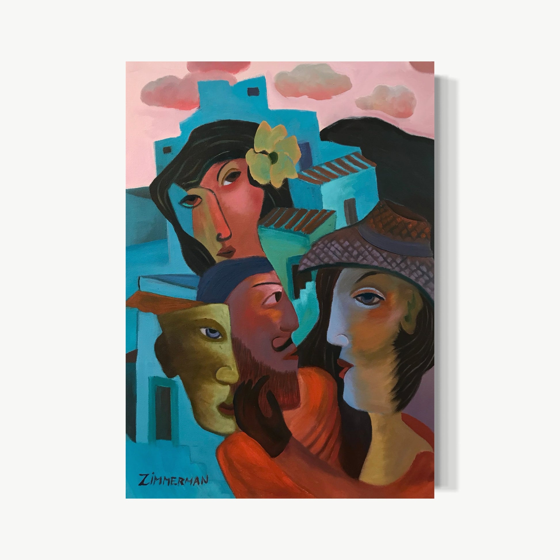 Zimmerman’s time in Europe, particularly in Spain, and his extended periods in Mexico continue to resonate in his figurative work. The terracotta warmth of the skin tones, the angular Mediterranean and Latin architectural forms, and a mood that feels both specific and slightly timeless all remain present. His line, shaped through years of printmaking and painting, is clean and assured, holding the composition together with clarity and restraint.