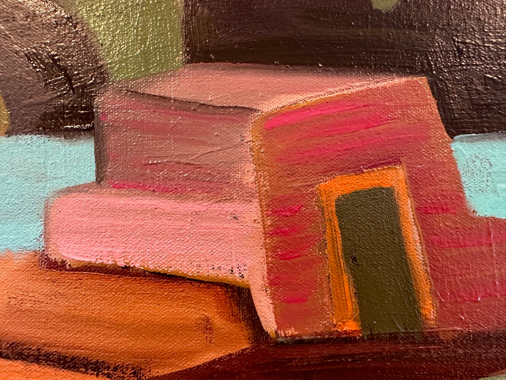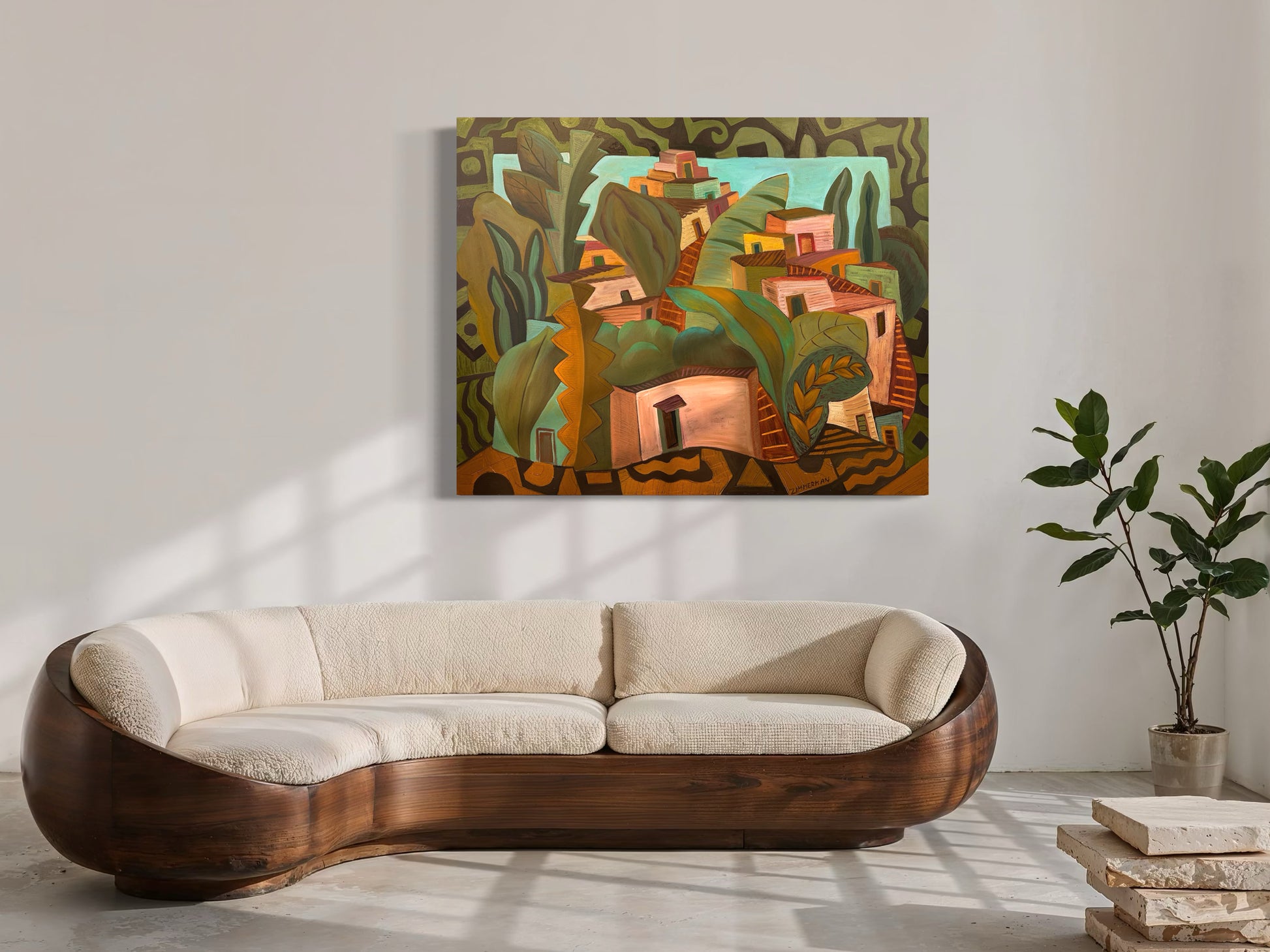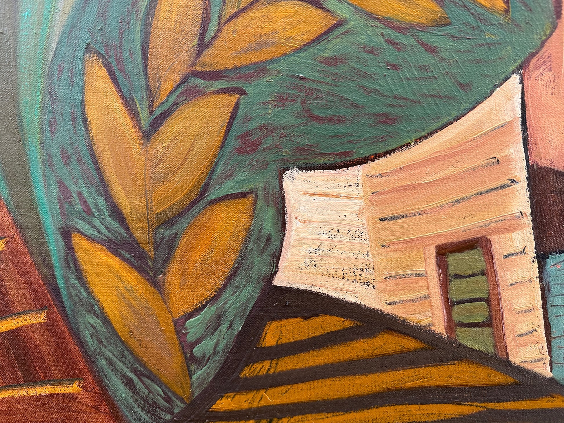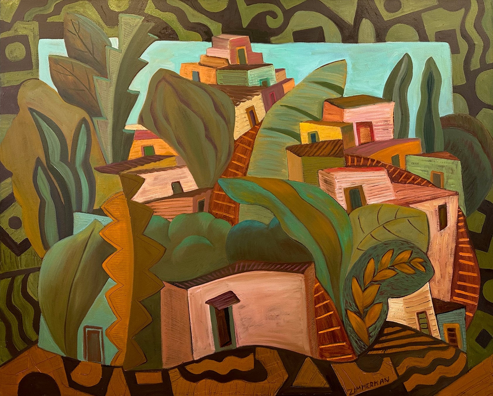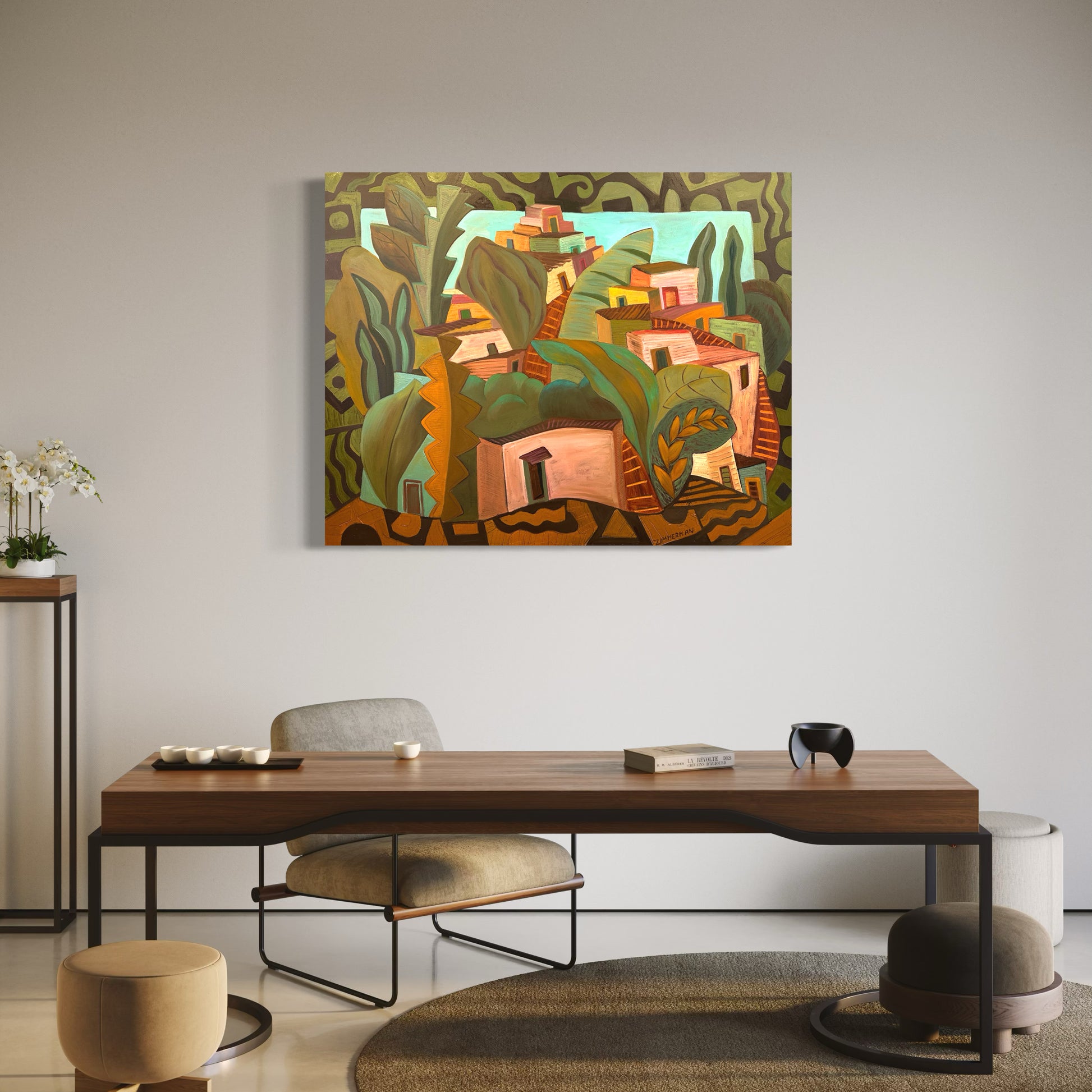 This large-scale painting immediately sets a warm, inviting tone. Marc brings together architecture and lush botanical forms in a way that feels both playful and thoughtfully composed. The layered homes seem to emerge naturally from the surrounding foliage, creating a scene that feels imagined yet strangely familiar.