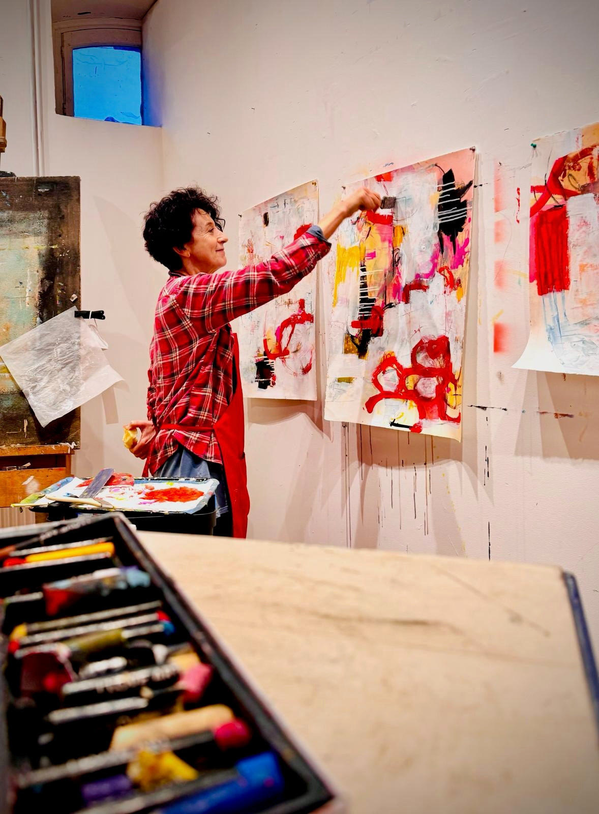 Christiane Corcelle is a French-American mixed media artist based in Massachusetts. Her intuitive, layered practice spans painting, printmaking, collage, and de-collage, building richly textured surfaces that invite close exploration. Guided by curiosity and openness to process, she transforms color, shape, and found materials into works that are both dynamic and contemplative.